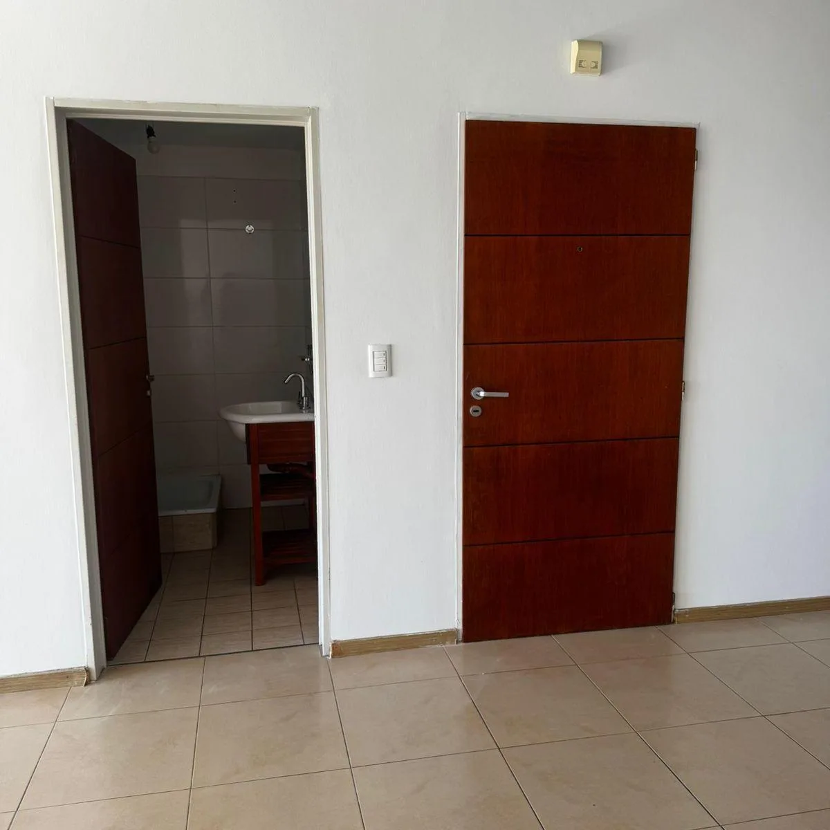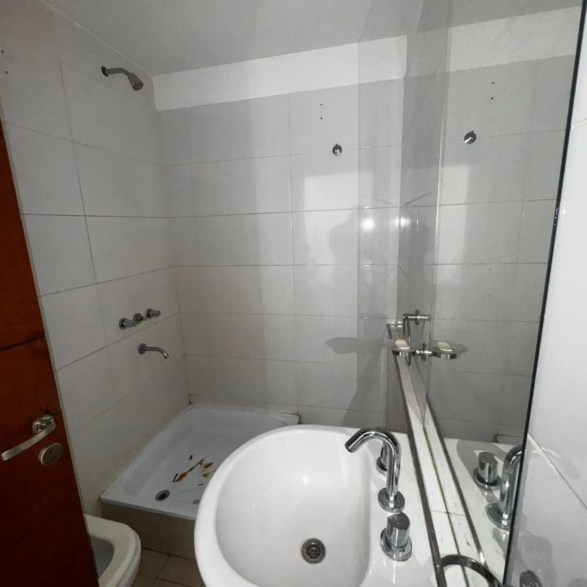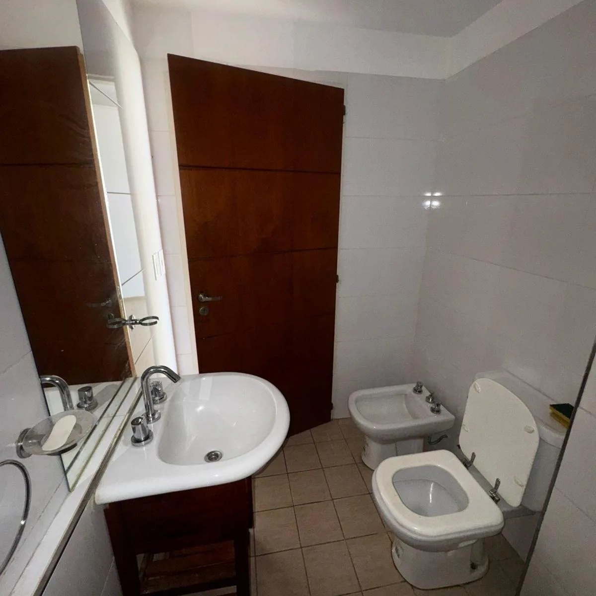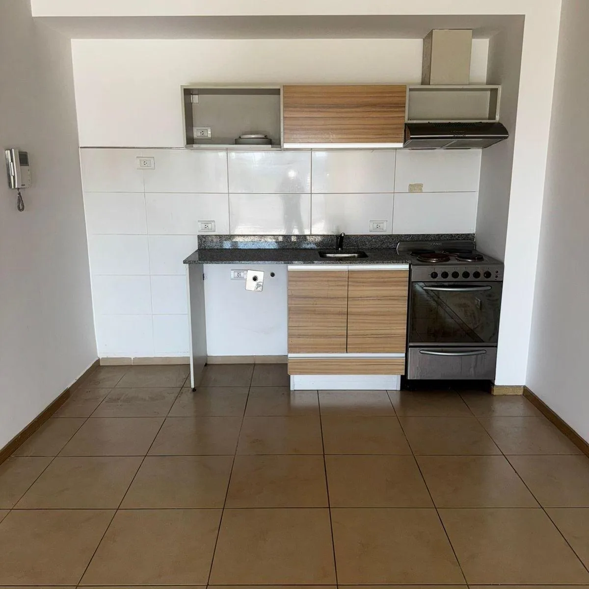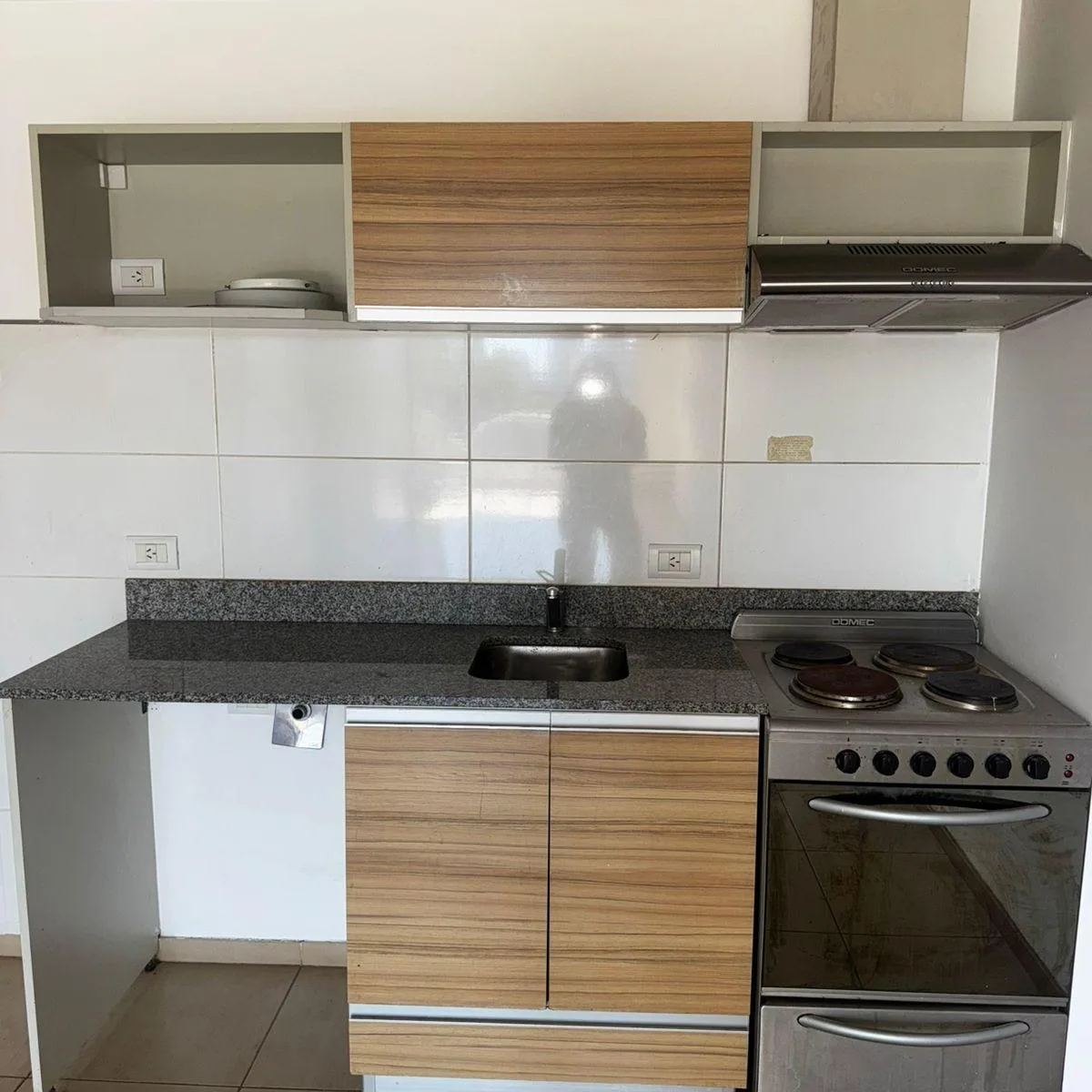 Kitnet no 3º andar em Saavedra, com cozinha equipada com fogão elétrico de 4 bocas Domec, forno elétrico embutido Domec e coifa/exaustor. Há armário de pia e alacena em melanina wengué, bancada em granito cinza com rodapé. O banheiro completo inclui torneiras, lavatório, bidê e aquecedor de passagem (termo-tanque) elétrico Saiar, além de espelho amplo e tampa de vaso sanitário com madeira branca.