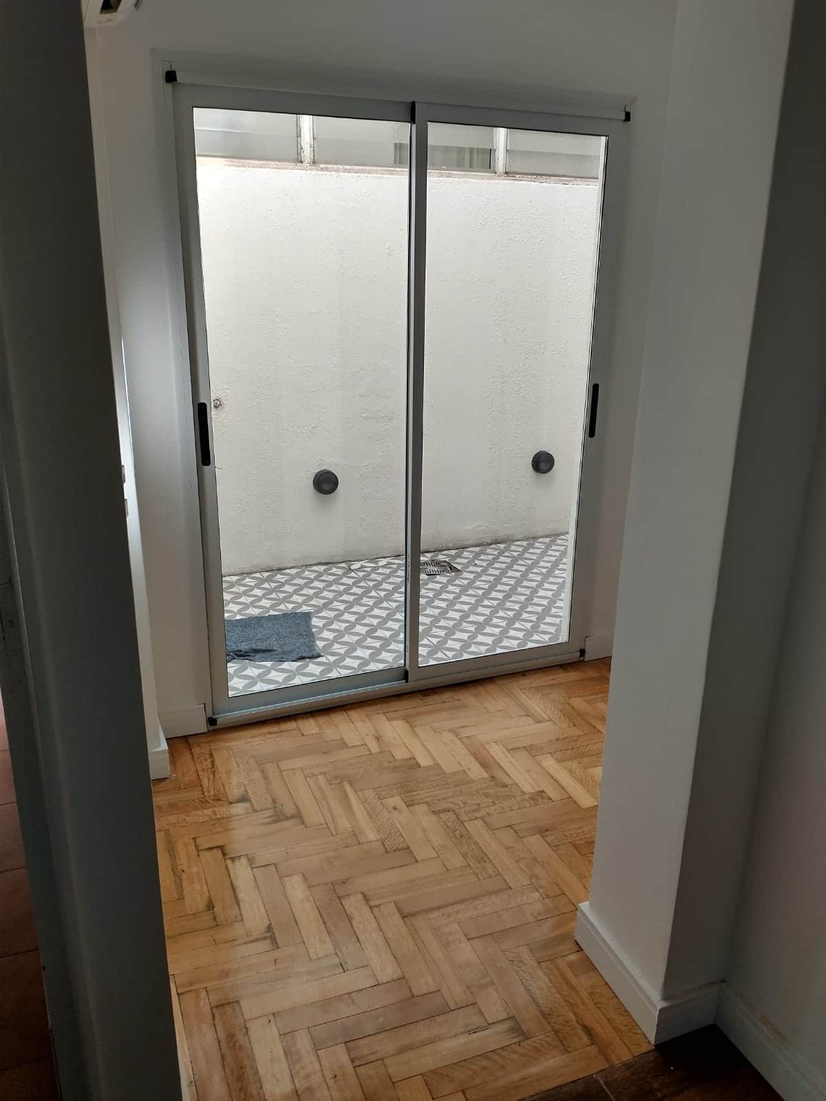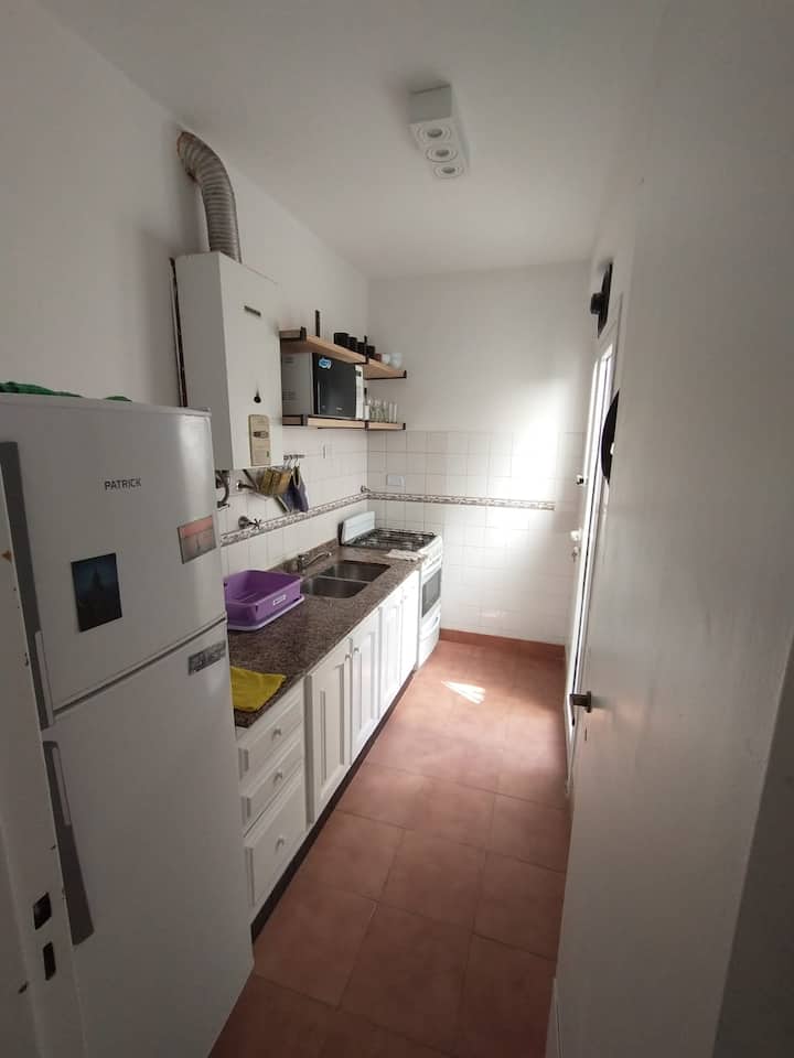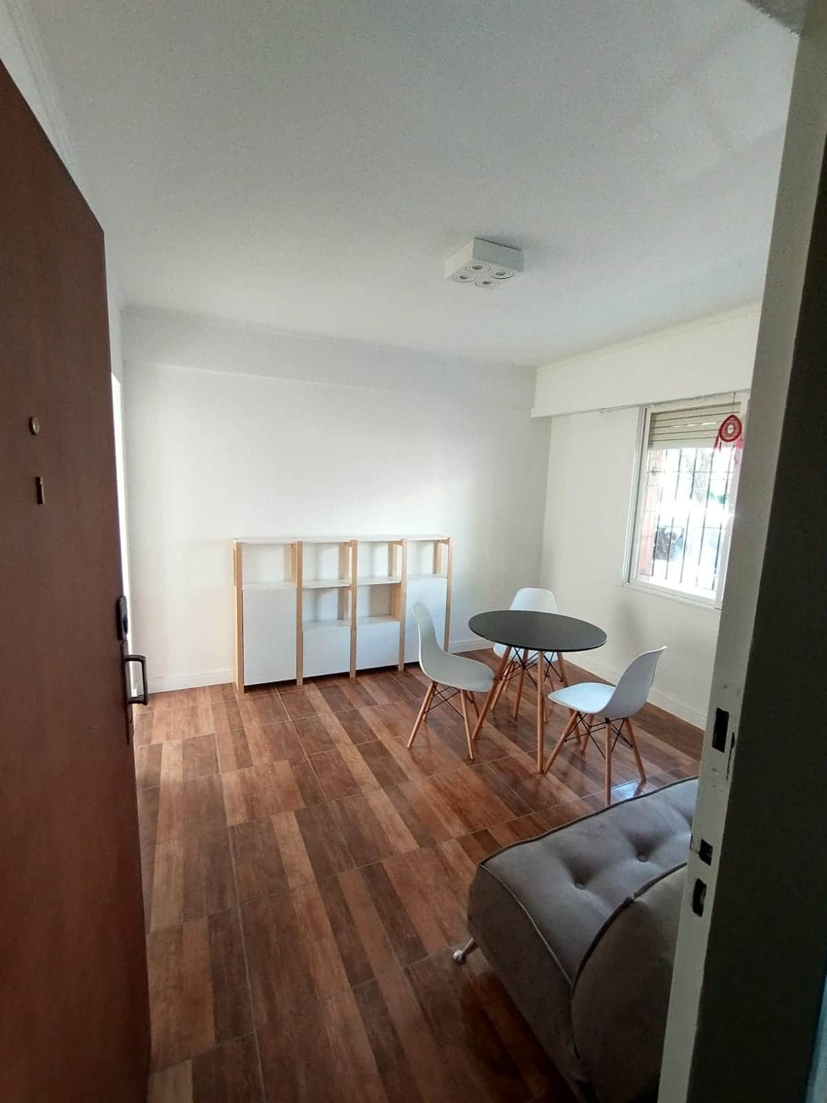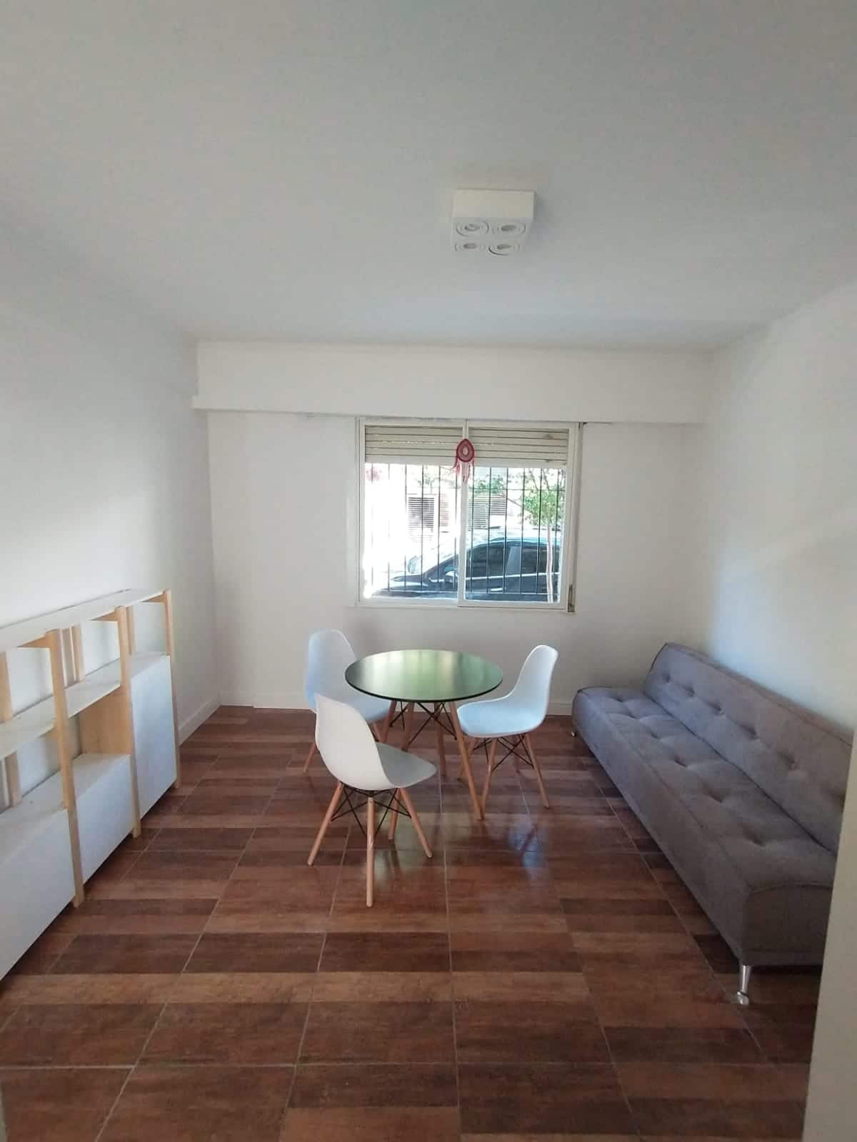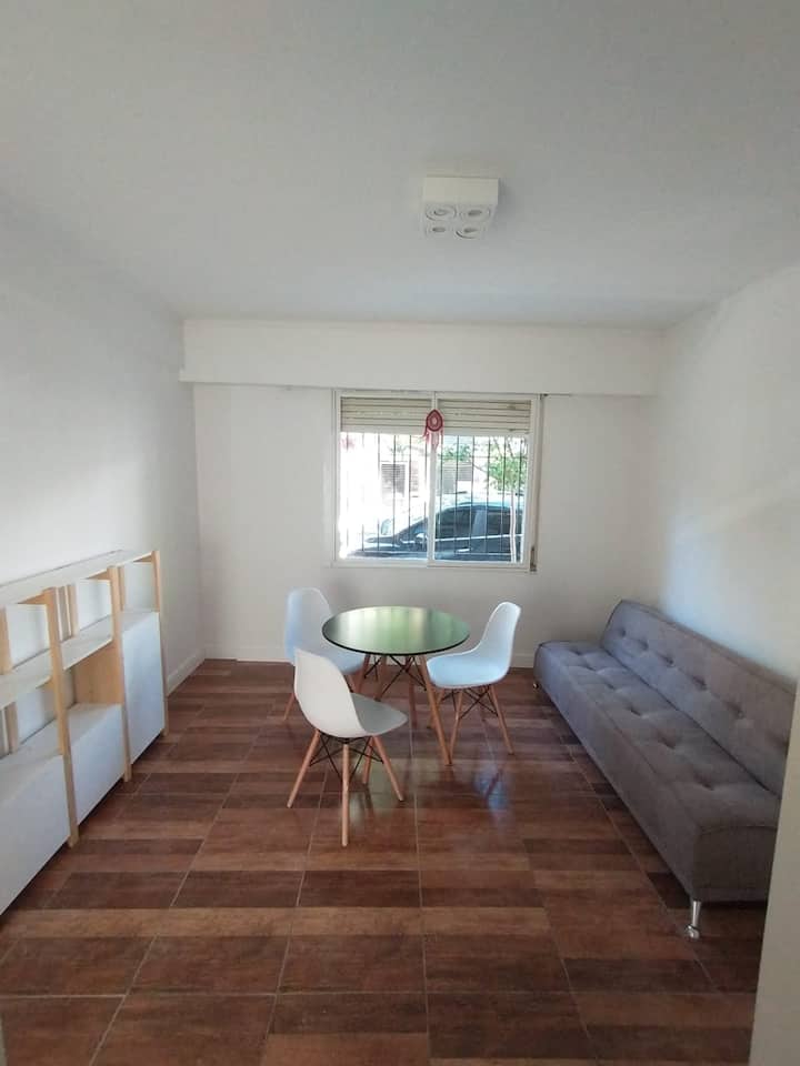 Apartamento com 1 quarto e 2 ambientes em Saavedra, com pátio. Tem cama de casal e sofá que vira cama, cozinha e área externa com máquina de lavar.