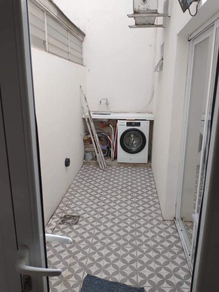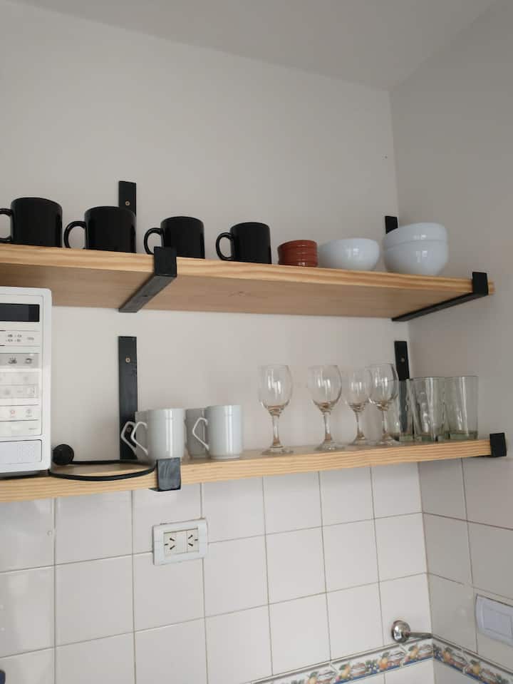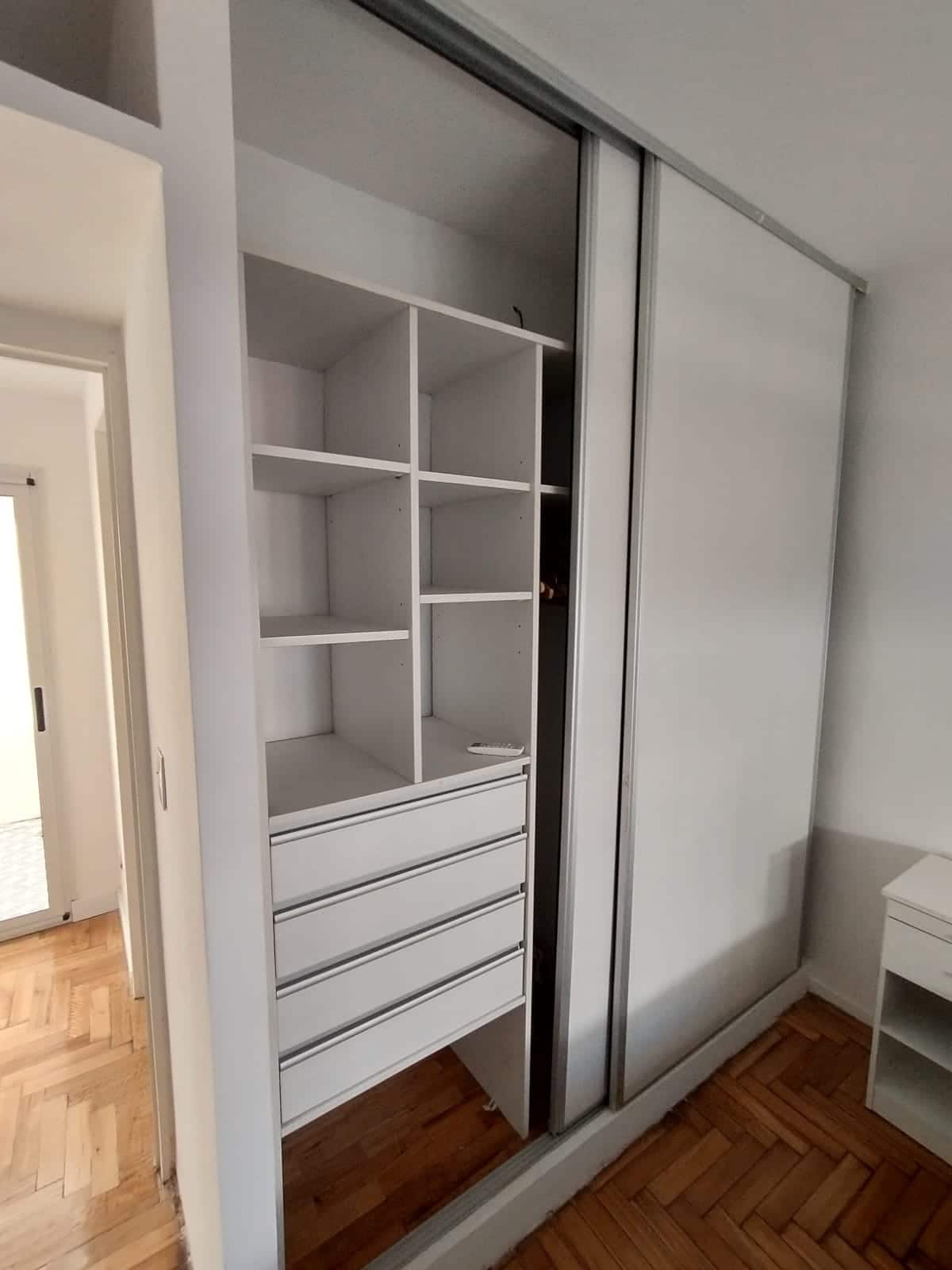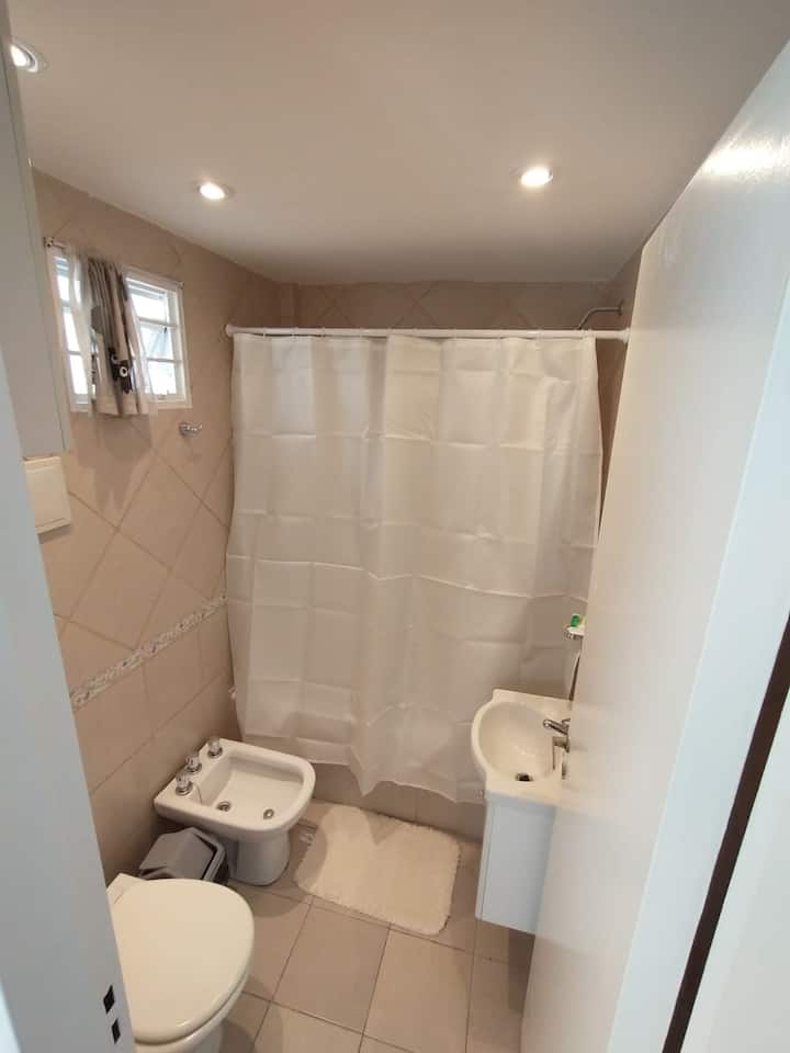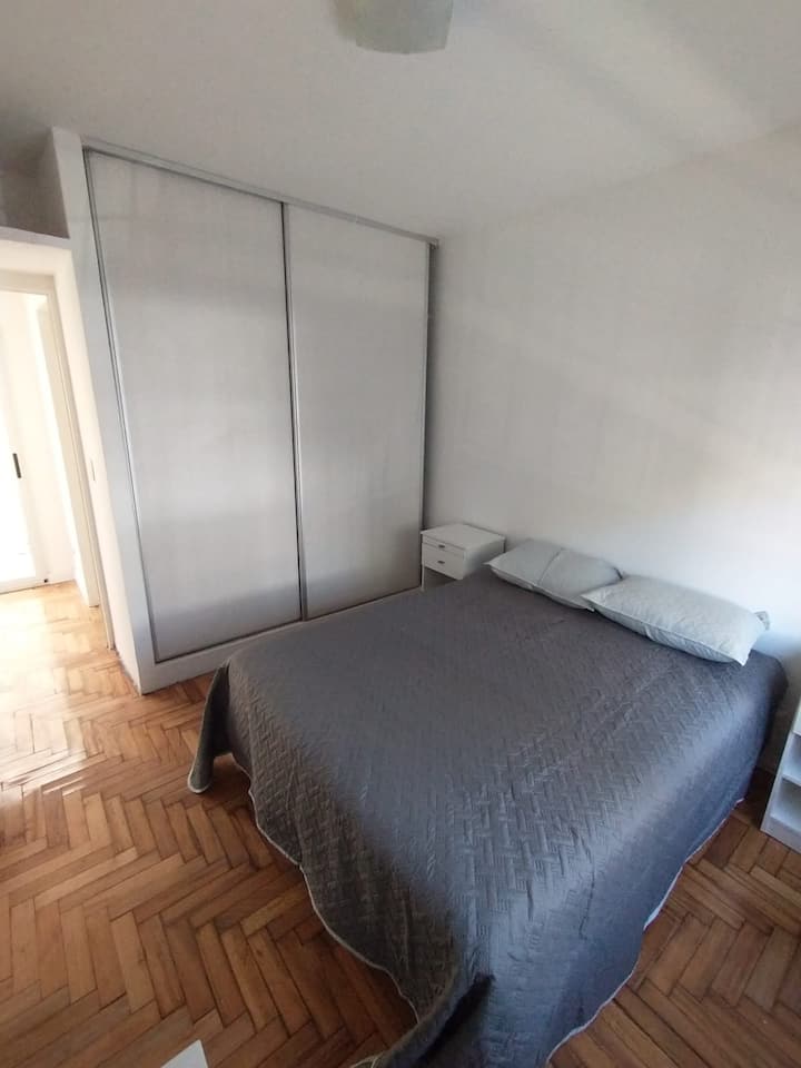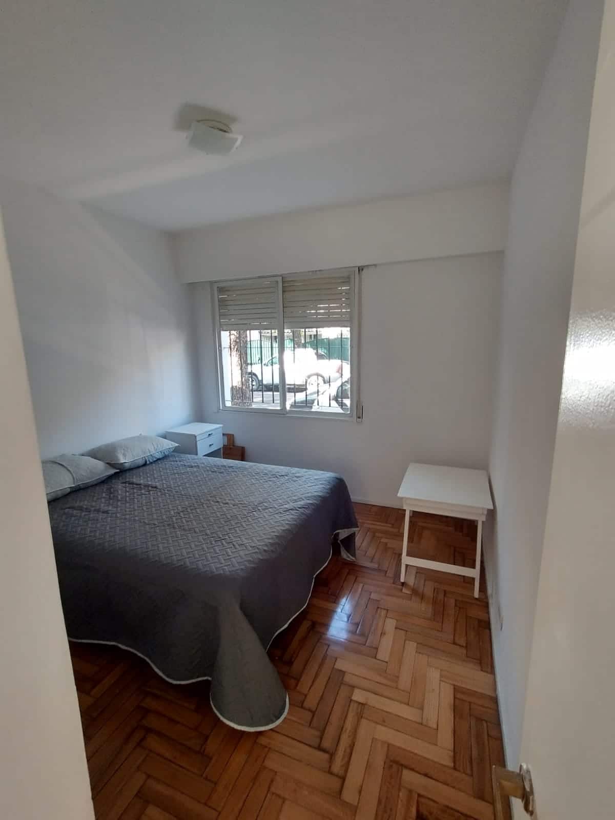 Apartamento com 1 quarto e 2 ambientes em Saavedra, com pátio. Tem cama de casal e sofá que vira cama, cozinha e área externa com máquina de lavar.