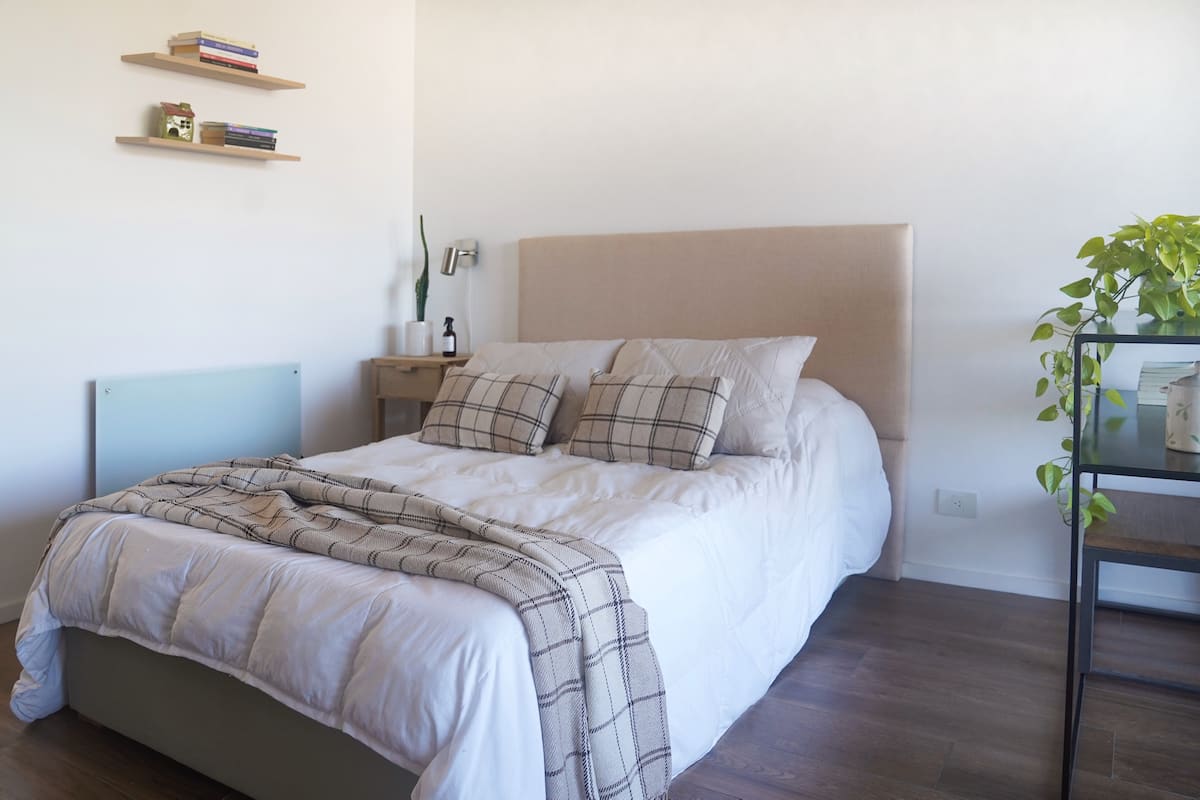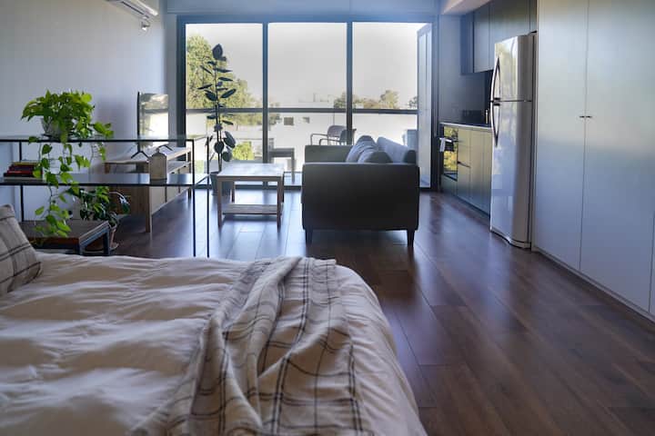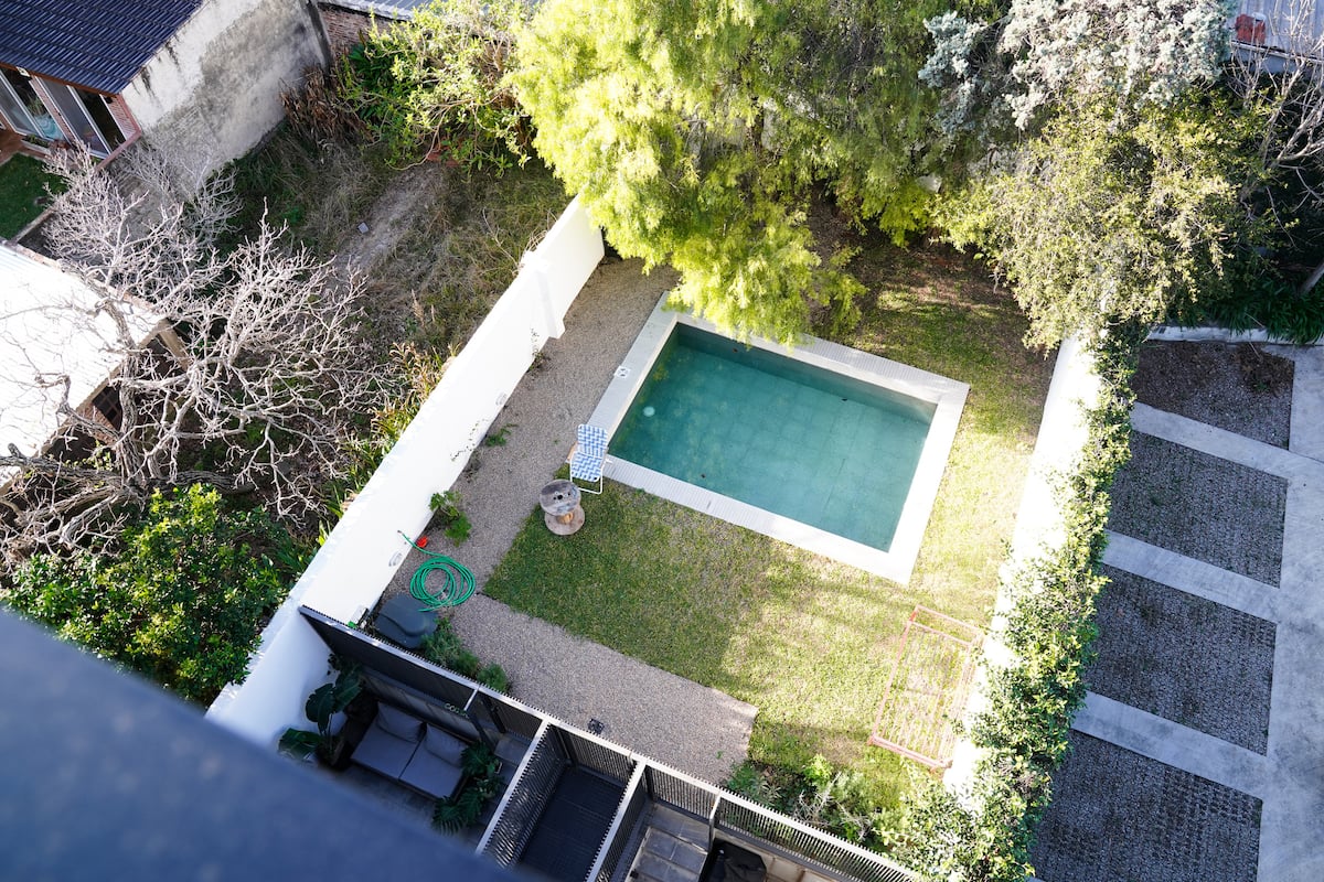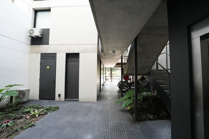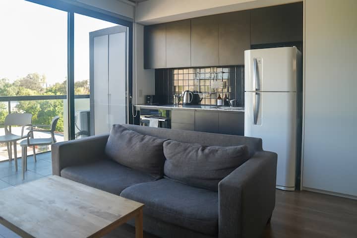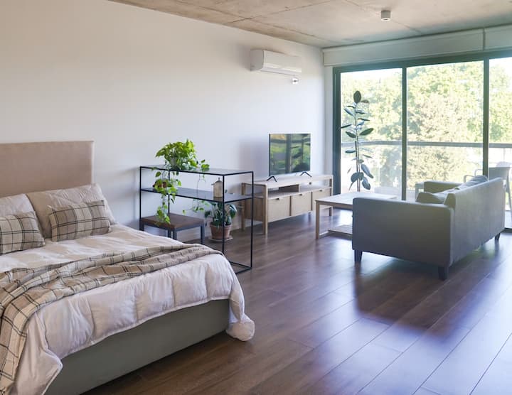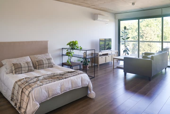 Studio em Saavedra, novo, com varanda e vista aberta para o parque. O apartamento tem Smart TV e Wi-Fi de boa velocidade. No prédio há lavanderia com máquina de lavar e secar para uso dos hóspedes, jardim comum com piscina e área de churrasco, além de espaço verde. A entrada e a saída estão indicadas como check-in das 15h às 21h e check-out até 10h.