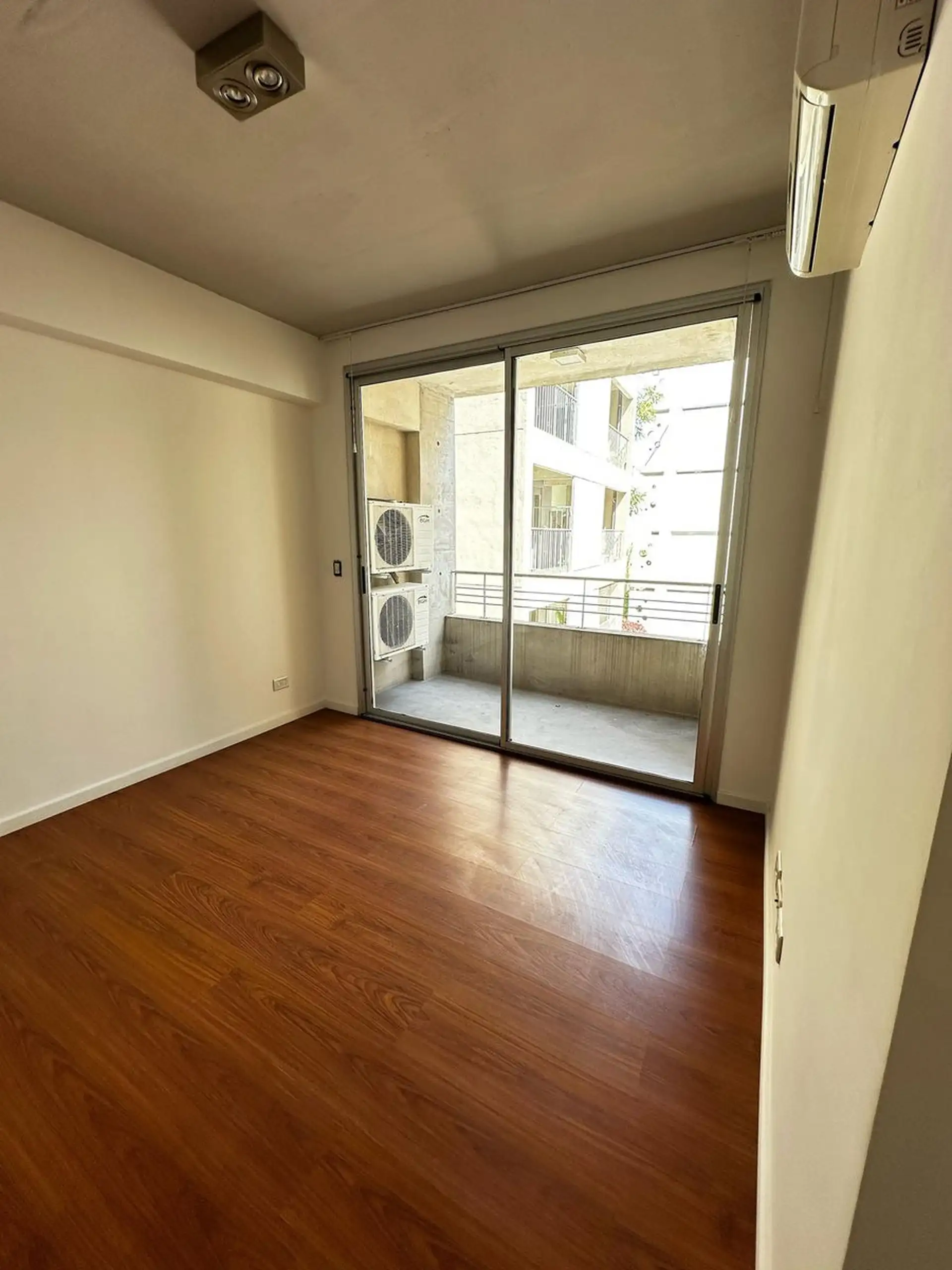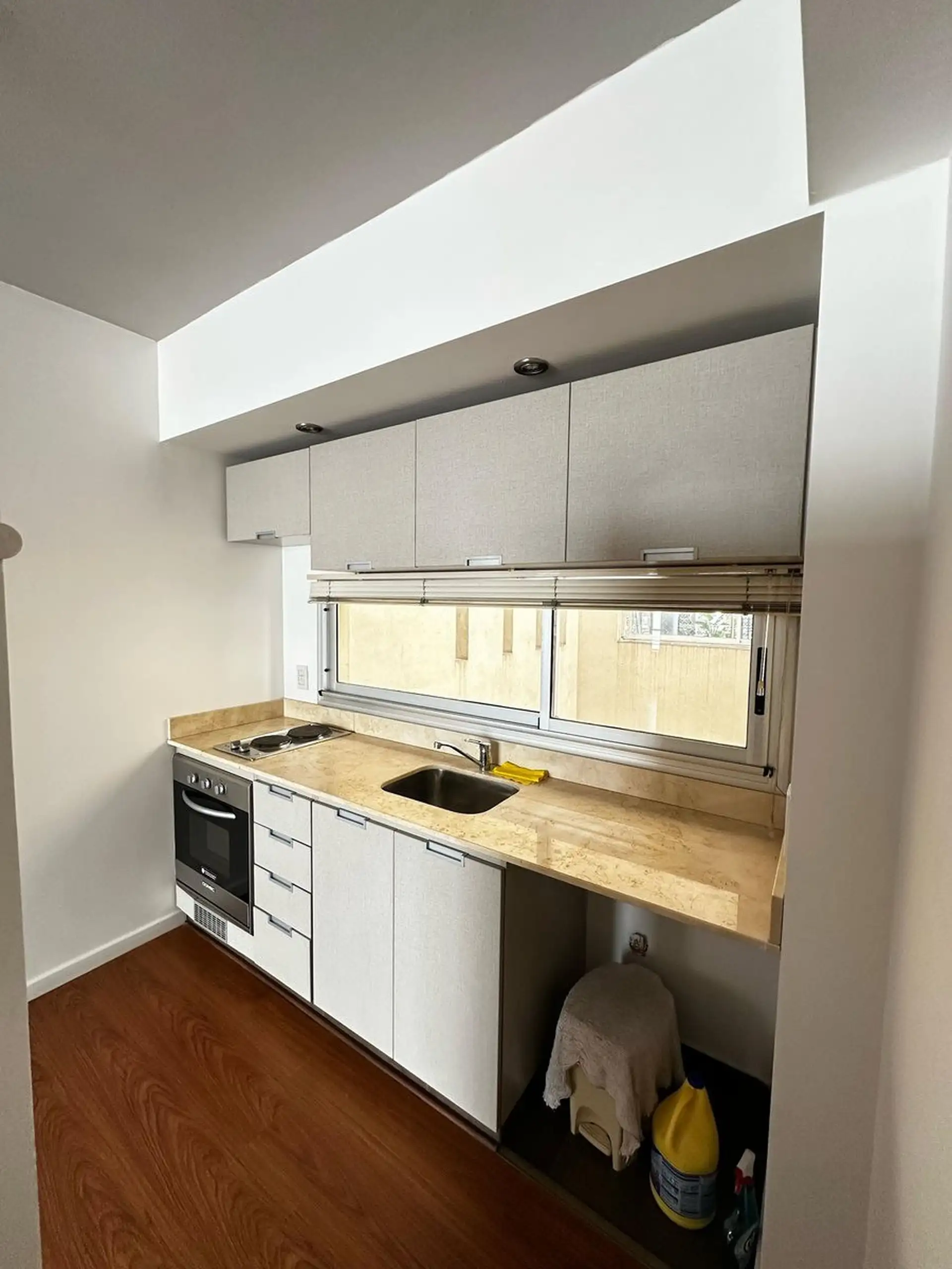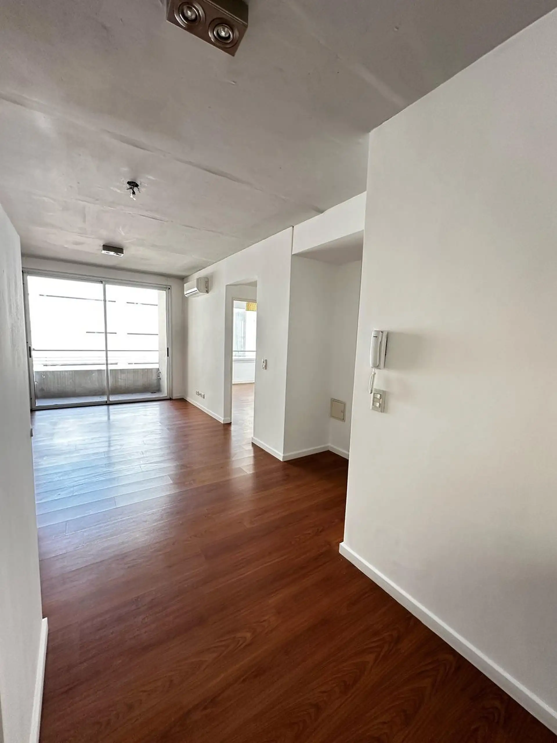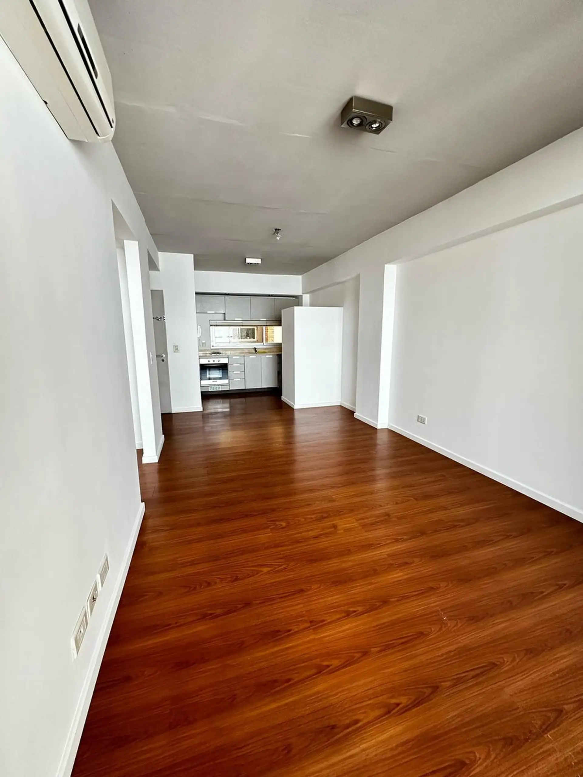 Apartamento de dois ambientes com 1 quarto em Saavedra, sem divisões internas, com cozinha integrada e sala com acesso à varanda. Banheiro completo. O prédio tem salão de festas (SUM) e área de churrasco com varanda, além de água quente central e aquecimento por ar frio/calor.