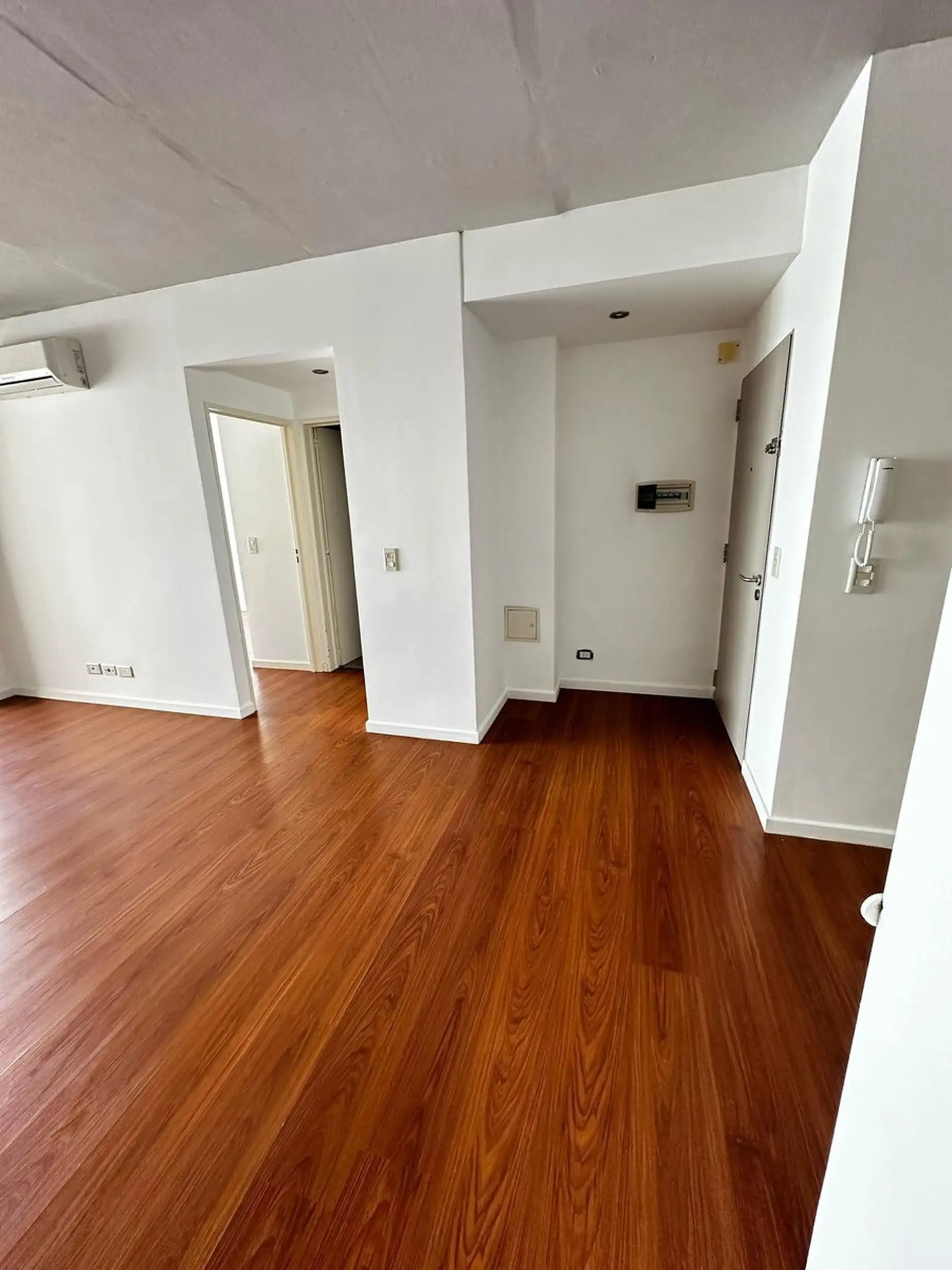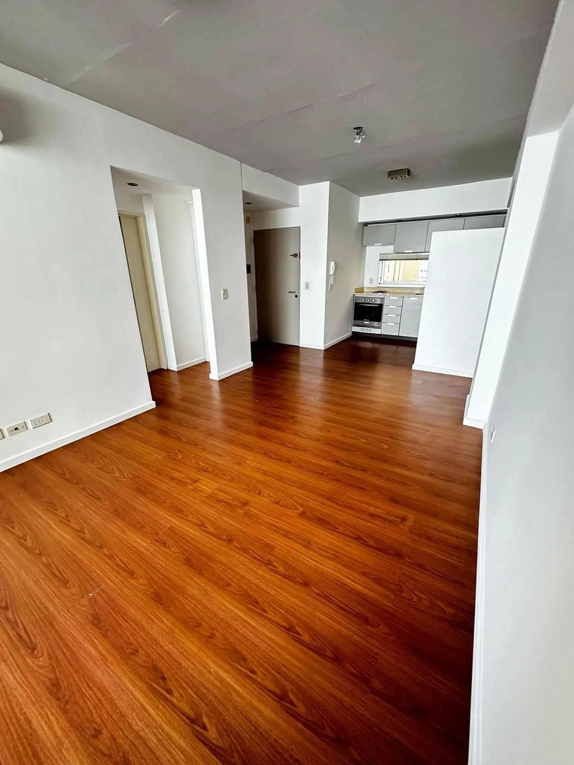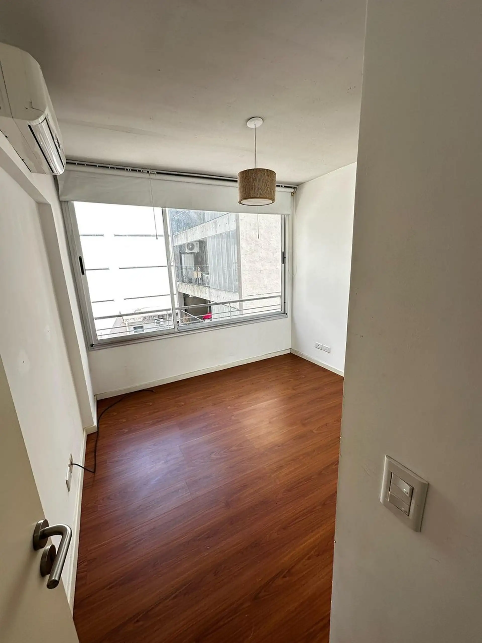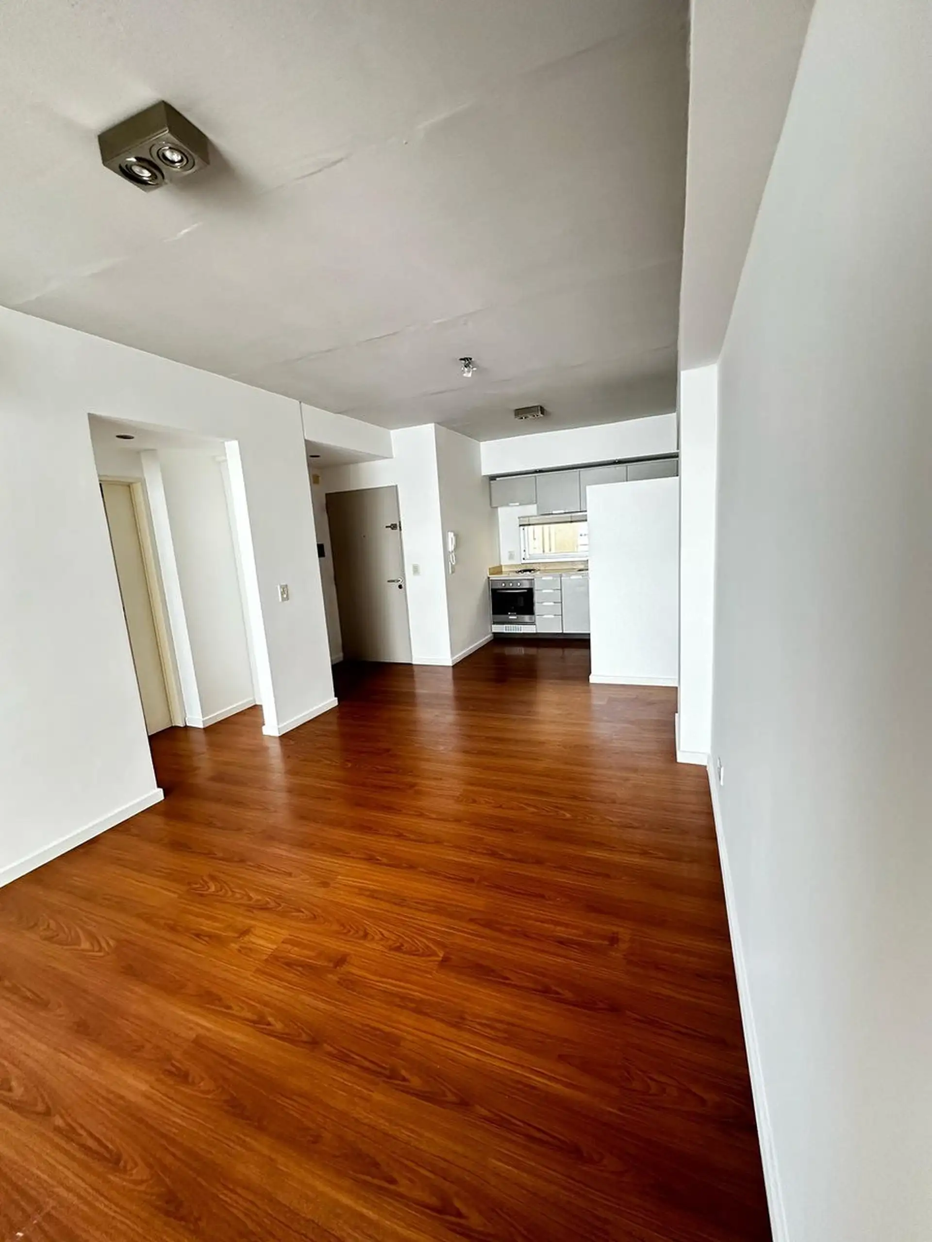 Apartamento de dois ambientes com 1 quarto em Saavedra, sem divisões internas, com cozinha integrada e sala com acesso à varanda. Banheiro completo. O prédio tem salão de festas (SUM) e área de churrasco com varanda, além de água quente central e aquecimento por ar frio/calor.