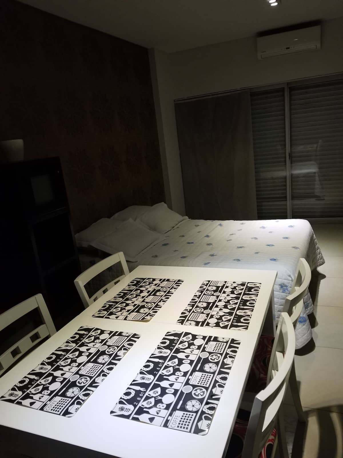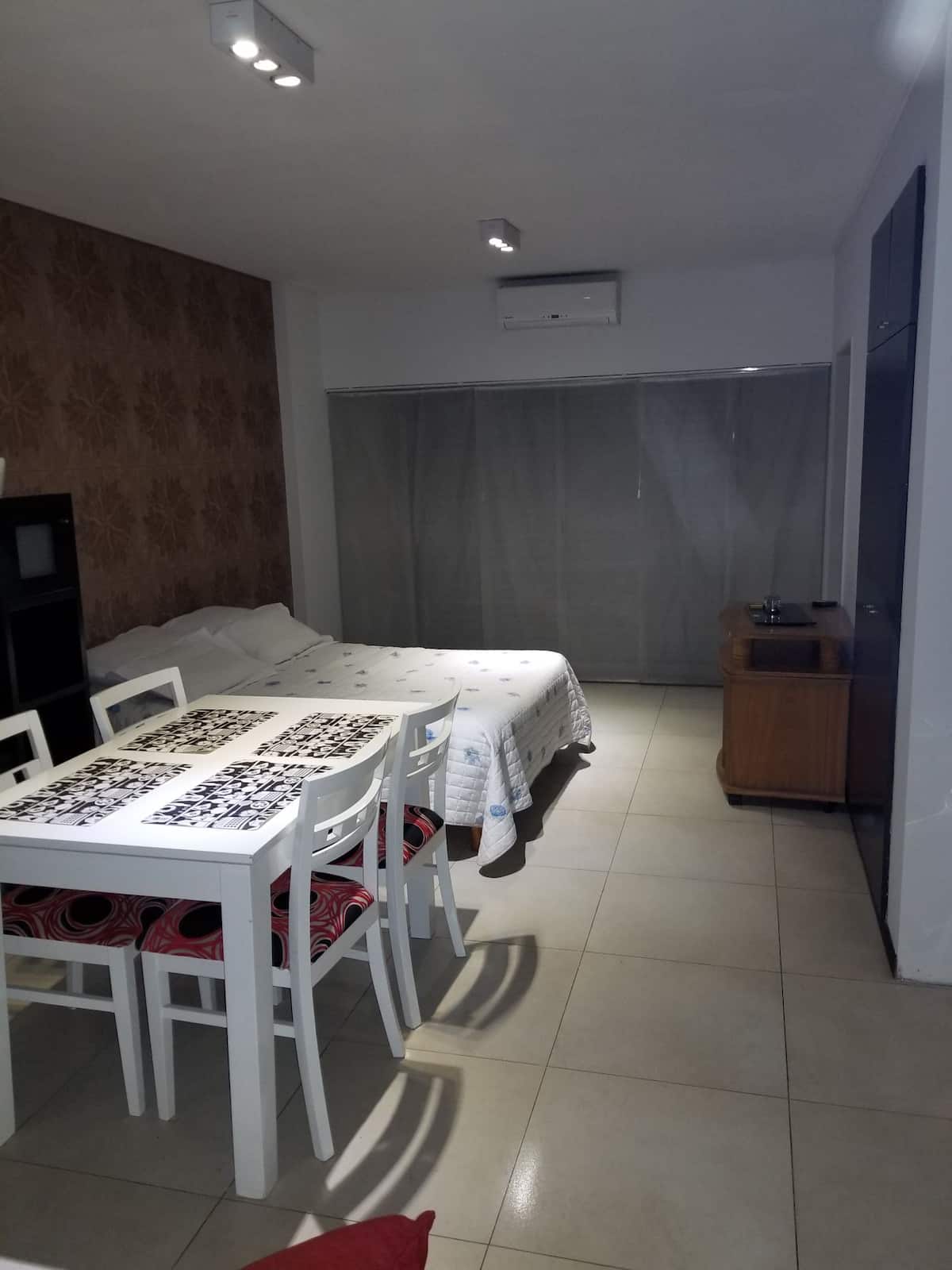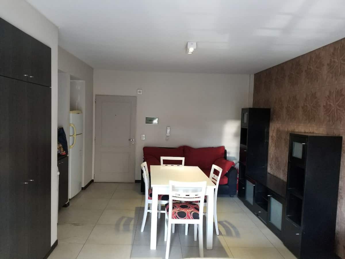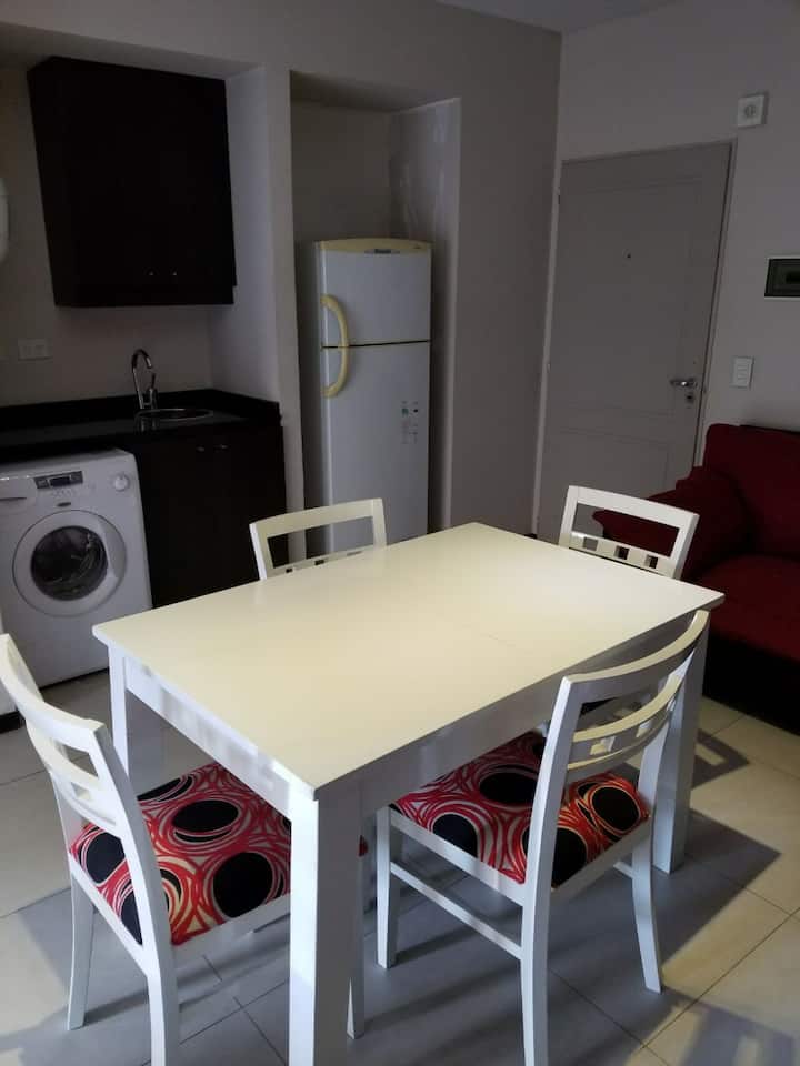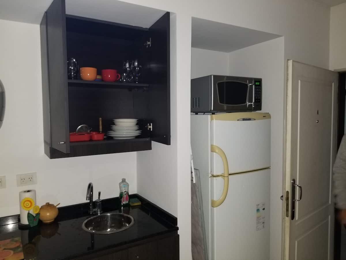 Apartamento com 1 quarto, sala única e varanda, com iluminação única. Está totalmente mobiliado e equipado, com geladeira com congelador, micro-ondas e máquina de lavar. Inclui TV e Wi-Fi. A estadia ocorre em uma localização com acesso a metrô e várias linhas de ônibus.