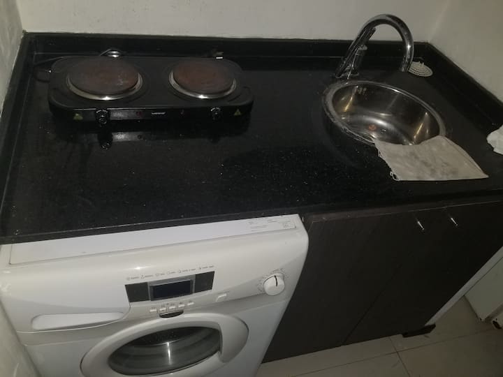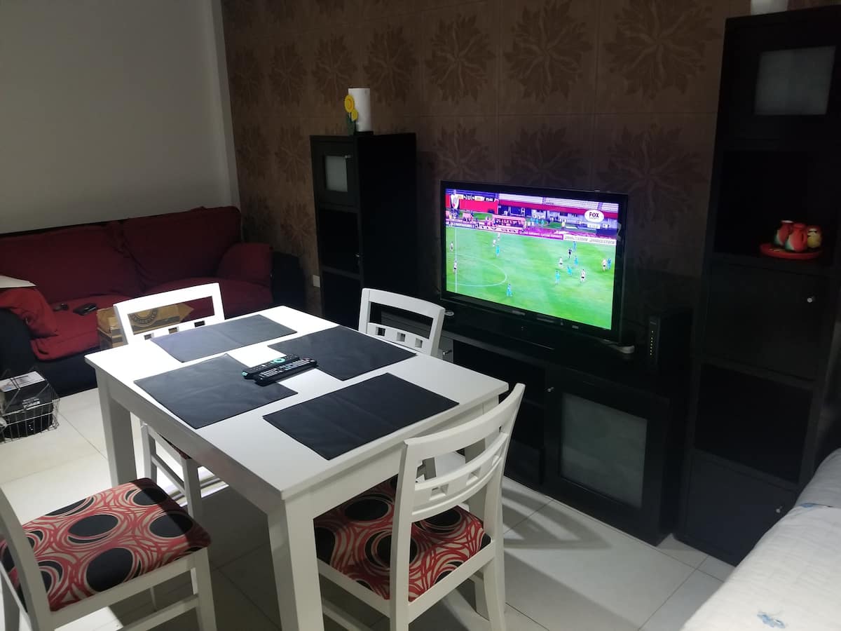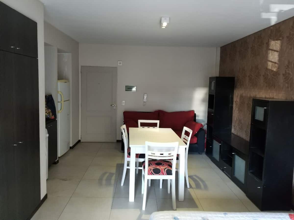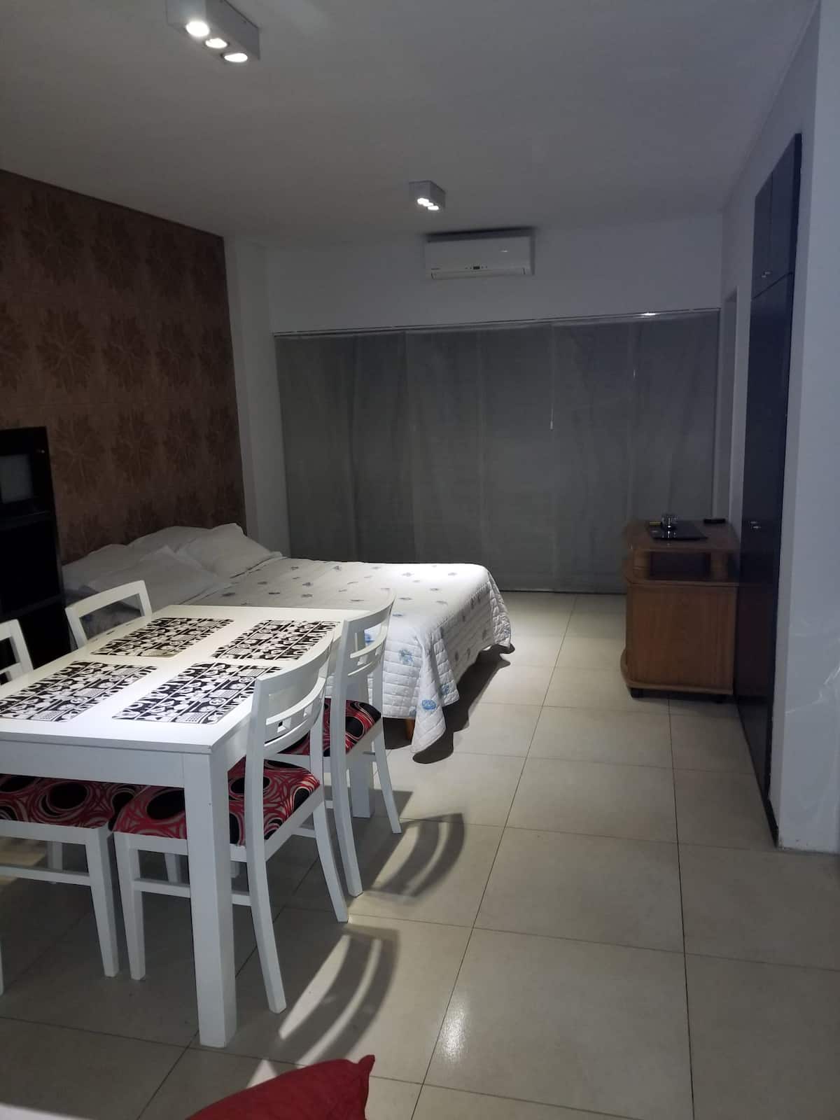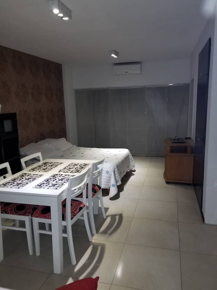 Apartamento com 1 quarto, sala única e varanda, com iluminação única. Está totalmente mobiliado e equipado, com geladeira com congelador, micro-ondas e máquina de lavar. Inclui TV e Wi-Fi. A estadia ocorre em uma localização com acesso a metrô e várias linhas de ônibus.