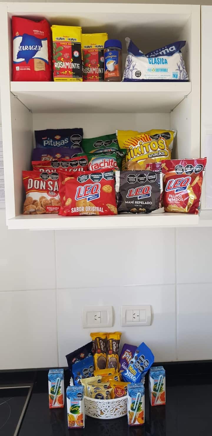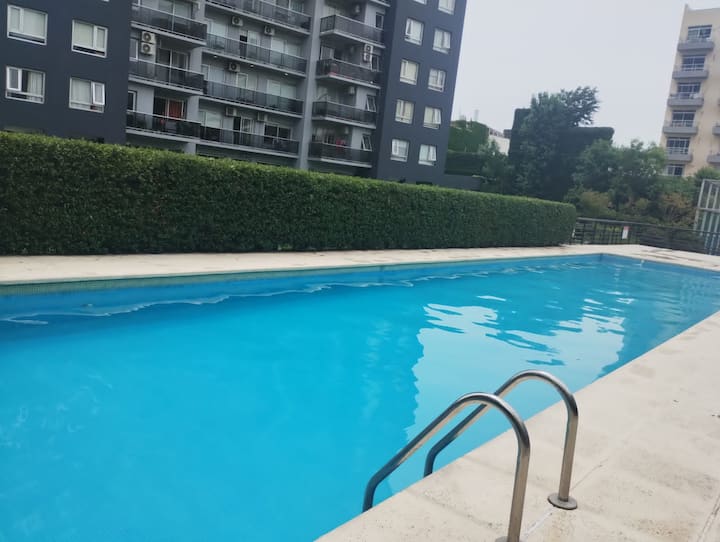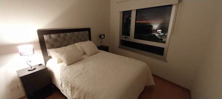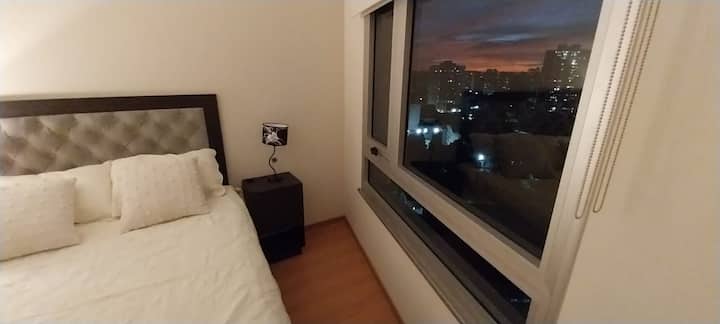 Apartamento de 2 ambientes no 16º andar, com varanda e vista para a cidade, em San Cristóbal. O imóvel tem sala, área de jantar com 2 sofás-cama, cozinha totalmente equipada e 1 quarto com cama de casal e armário. O condomínio oferece piscina para adultos e outra para crianças, área de churrasco, academia, quadra esportiva, espaço infantil, área verde, lavanderia, além de segurança 24 horas com câmeras.