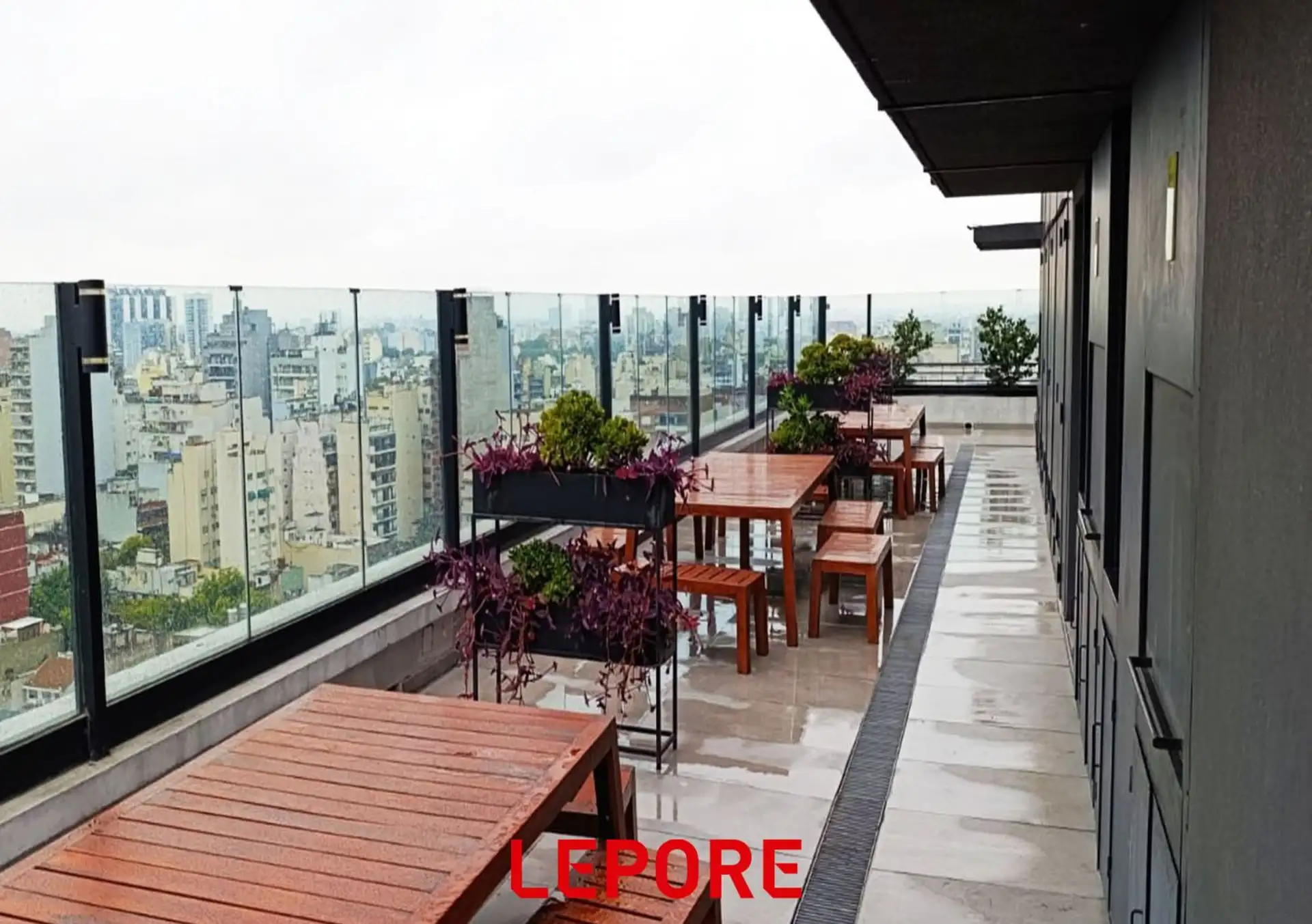 Apartamento de 2 ambientes em San Cristóbal, com 1 quarto, balcão de frente e cozinha integrada. Inclui sala de estar e jantar, dormitório com armário e banheiro completo. O edifício tem piscina, jardim com área de recreação, terraço com vista panorâmica e área de churrasco.