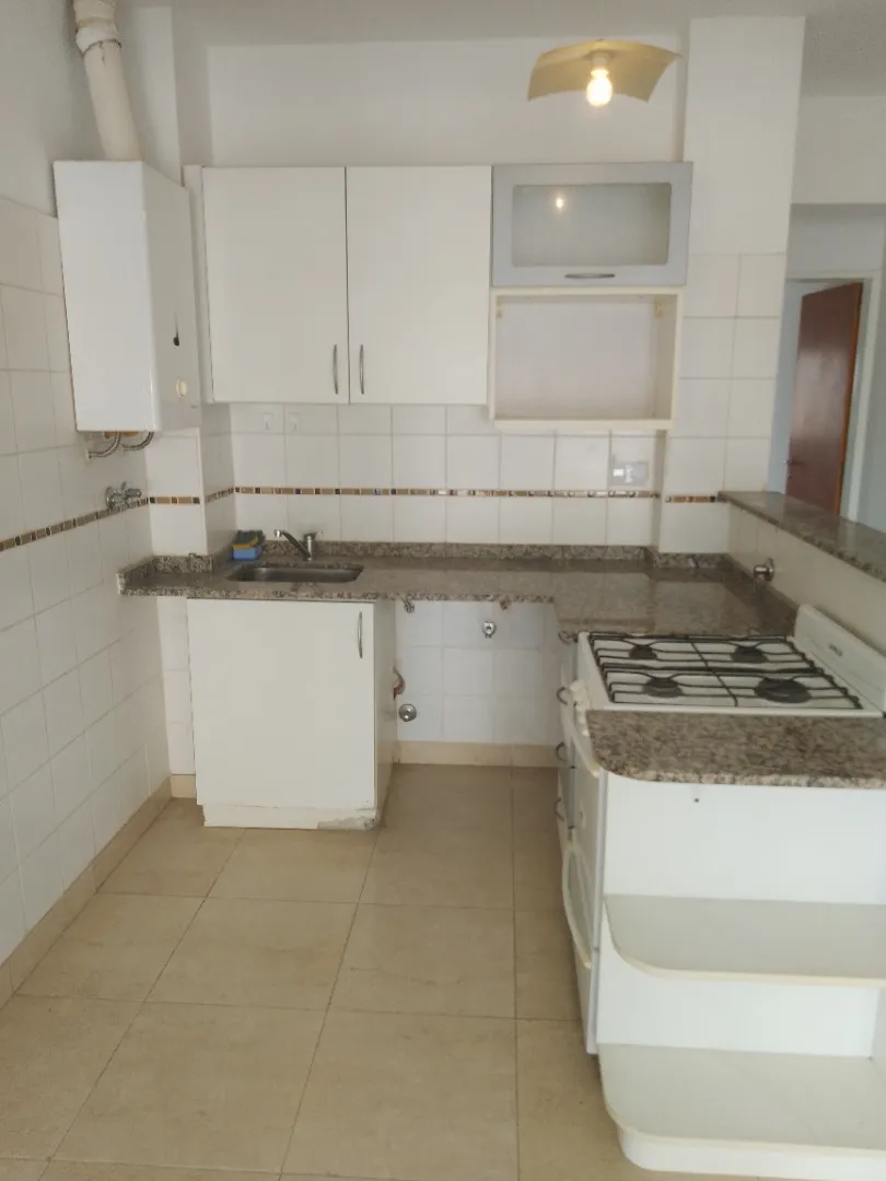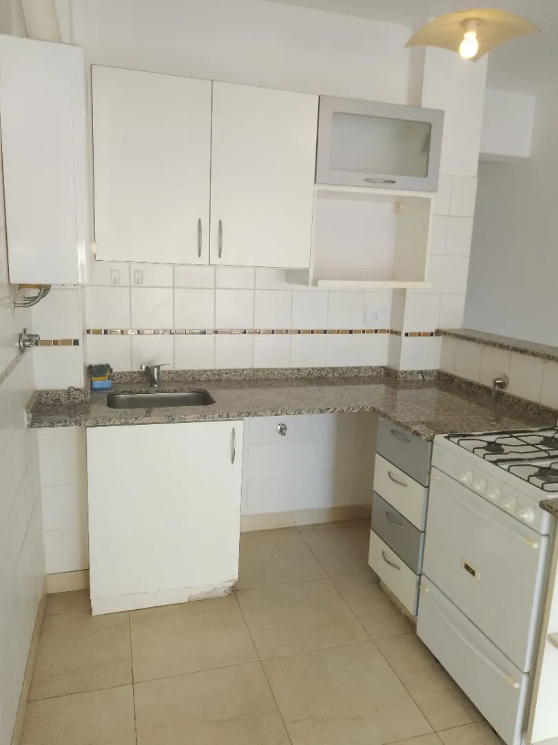 Apartamento de dois ambientes com 1 quarto, sala de estar e jantar com saída para varanda de 4 m. Cozinha integrada à sala, com barra, e dormitório com armário embutido, além de outro armário no hall. Banheiro completo. Contrato de aluguel de 2 anos com reajuste trimestral pelo IPC, e localização central próxima à Plaza e à estação.