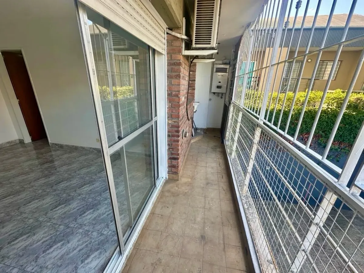 Apartamento de 2 ambientes em San Fernando, com 1 quarto, situado na rua Presidente Perón. Fica em um edifício de poucas plantas, com fachada em tijolo aparente e acesso por portão e saguão comum. Possui living com ar-condicionado instalado e aquecedor, piso cerâmico e varanda de frente com grades de proteção. A cozinha é independente, com fogão a gás, armários inferiores, prateleiras e janela para o exterior. O dormitório tem armário embutido do piso ao teto, e há banheiro completo com banheira