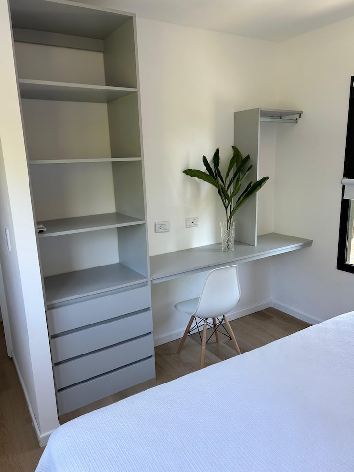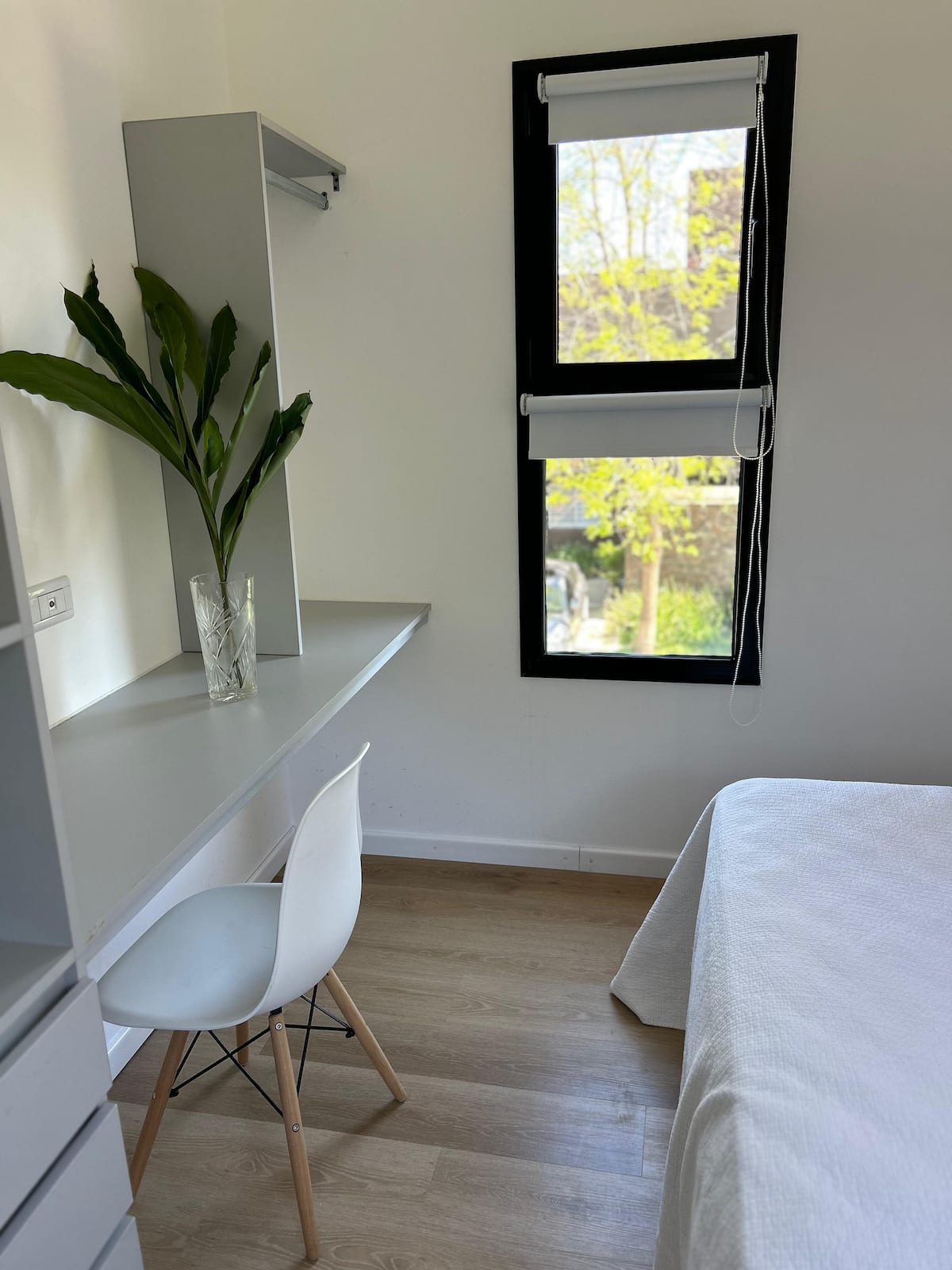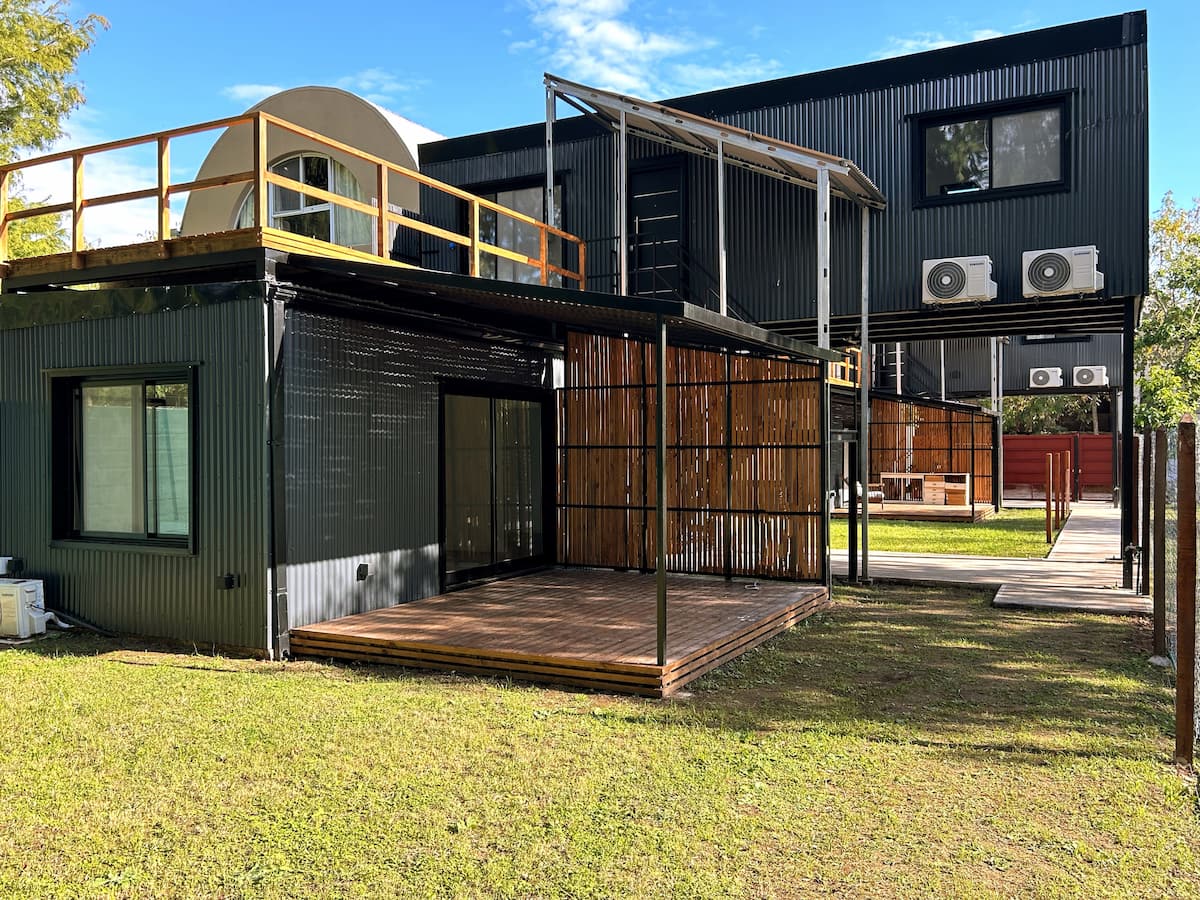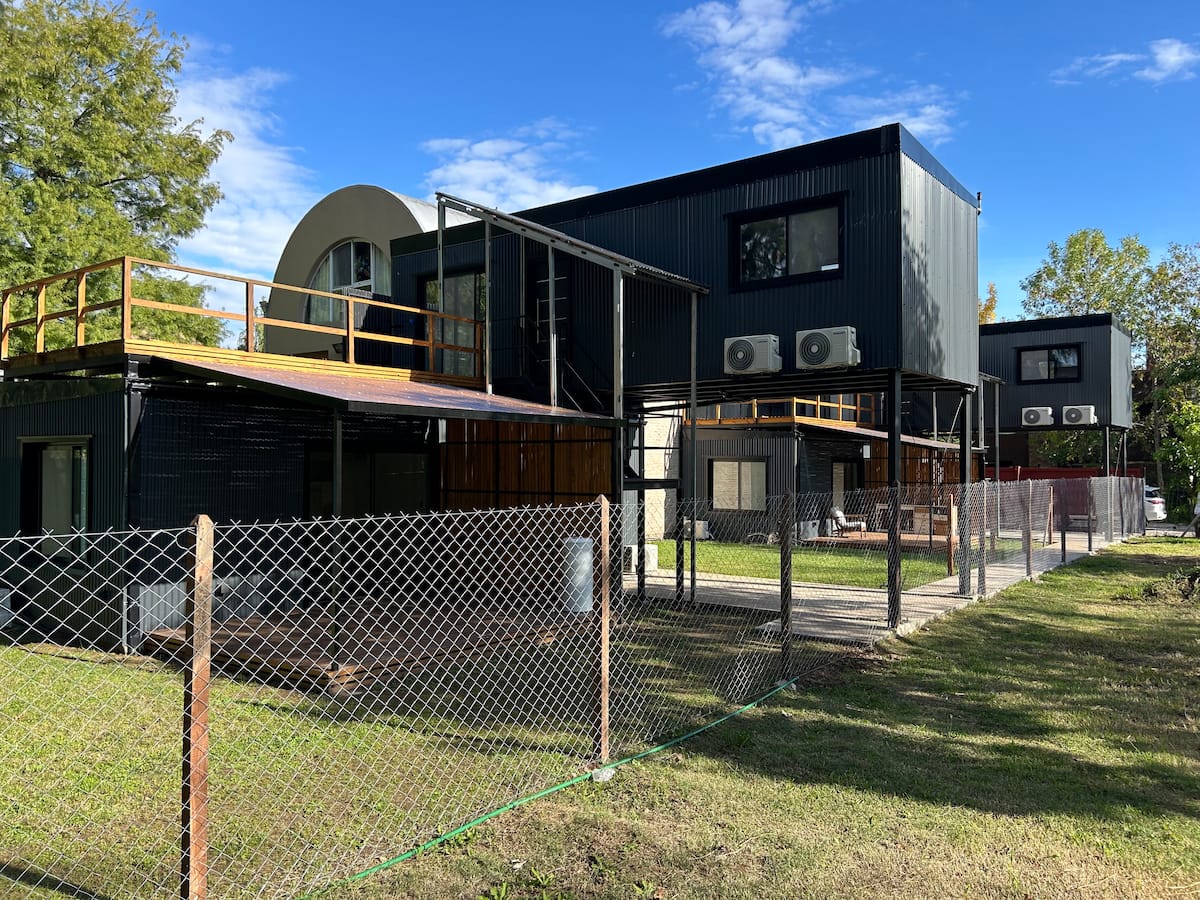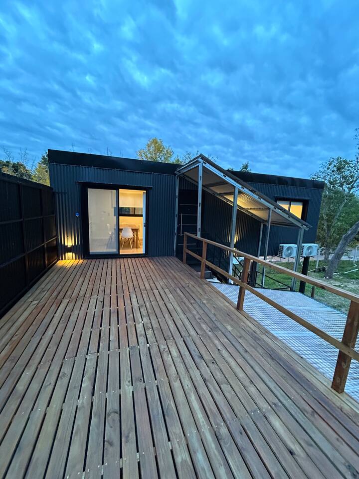 Apartamento em módulo independente de dois ambientes no EcoCampus Residence, com 1 quarto, cozinha e 1 banheiro, com acesso direto ao EcoParque San Fernando e deck no jardim. O apartamento é mobiliado e equipado com camas, mesa, cadeiras, poltronas e itens de cozinha.