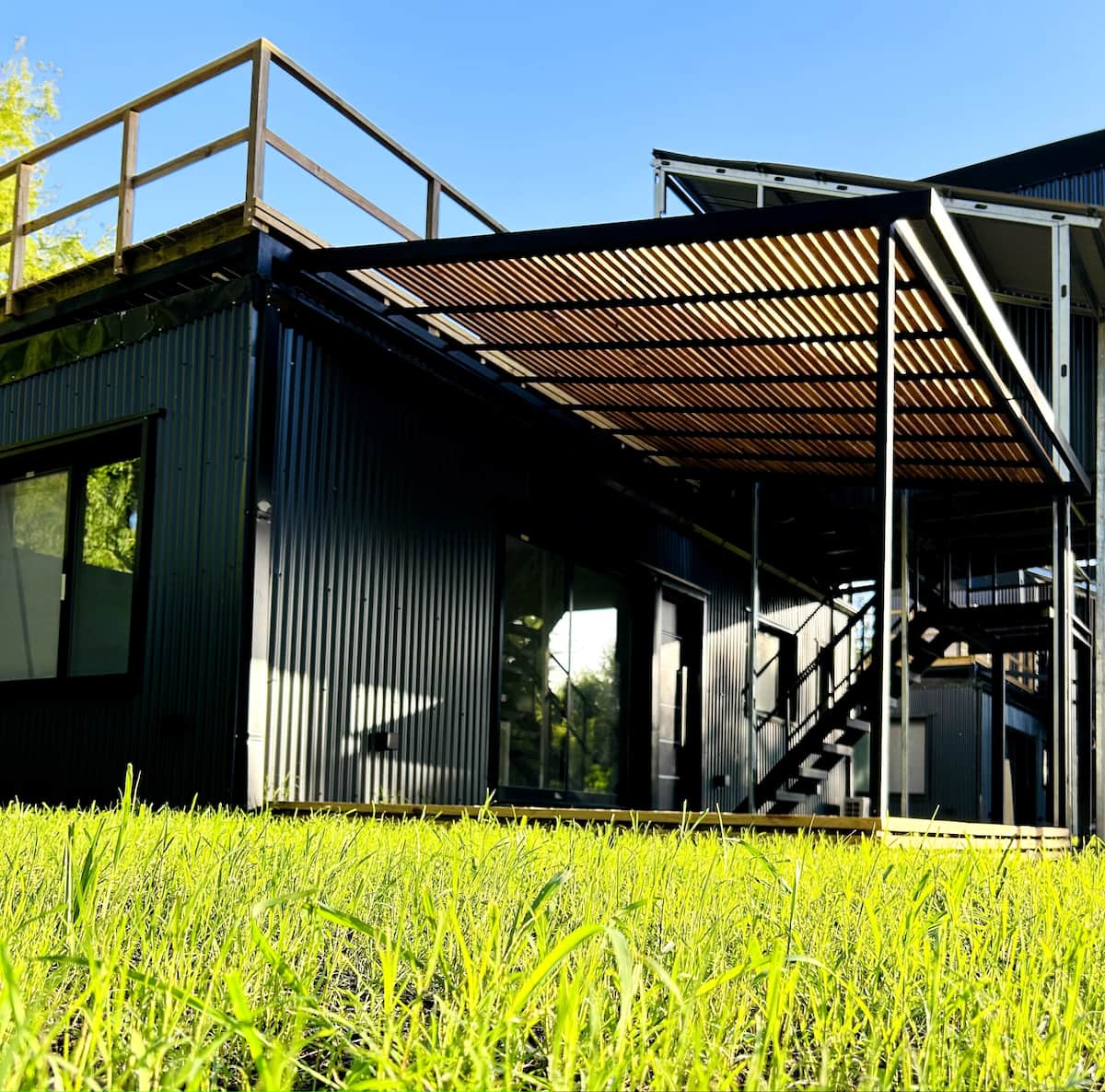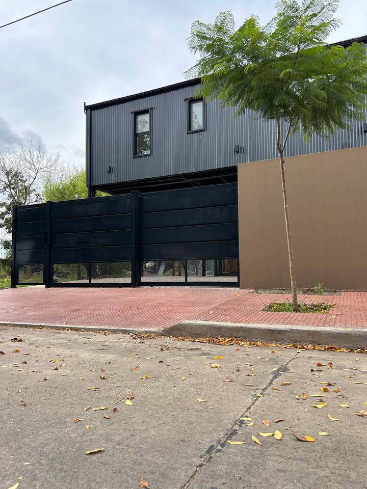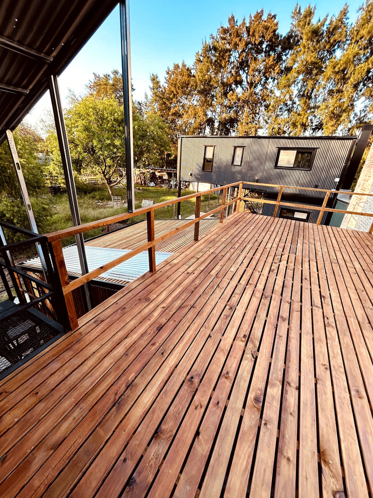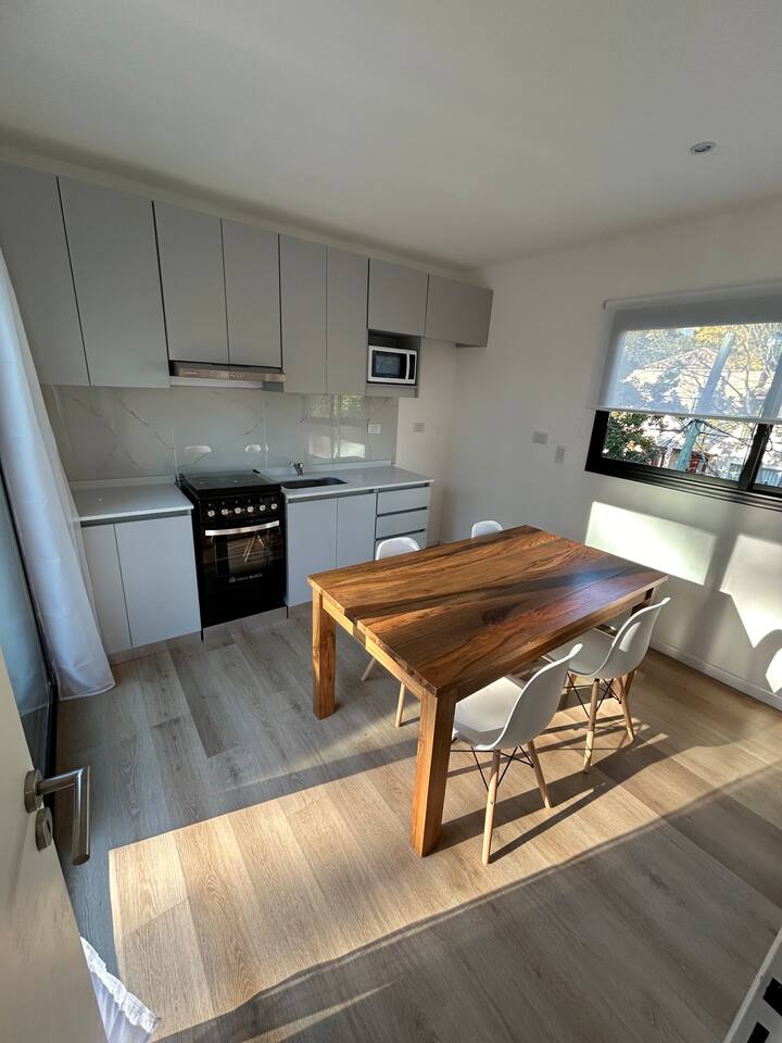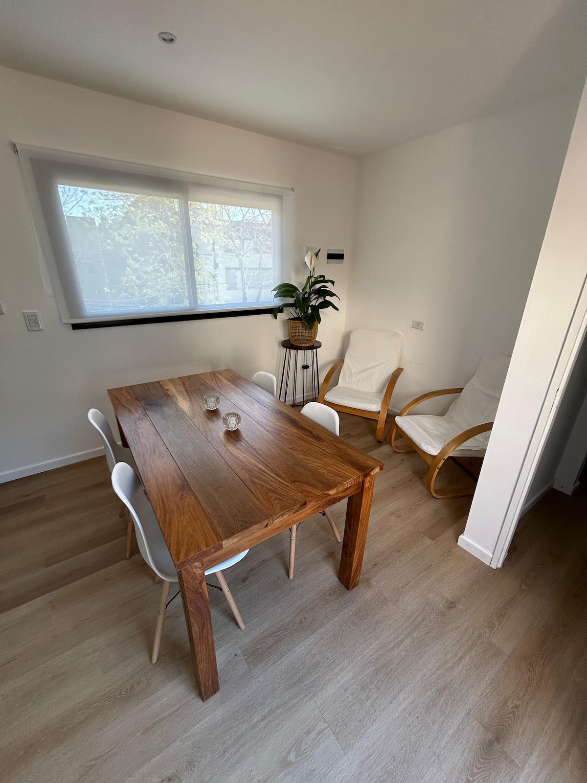 Apartamento em módulo independente de dois ambientes no EcoCampus Residence, com 1 quarto, cozinha e 1 banheiro, com acesso direto ao EcoParque San Fernando e deck no jardim. O apartamento é mobiliado e equipado com camas, mesa, cadeiras, poltronas e itens de cozinha.