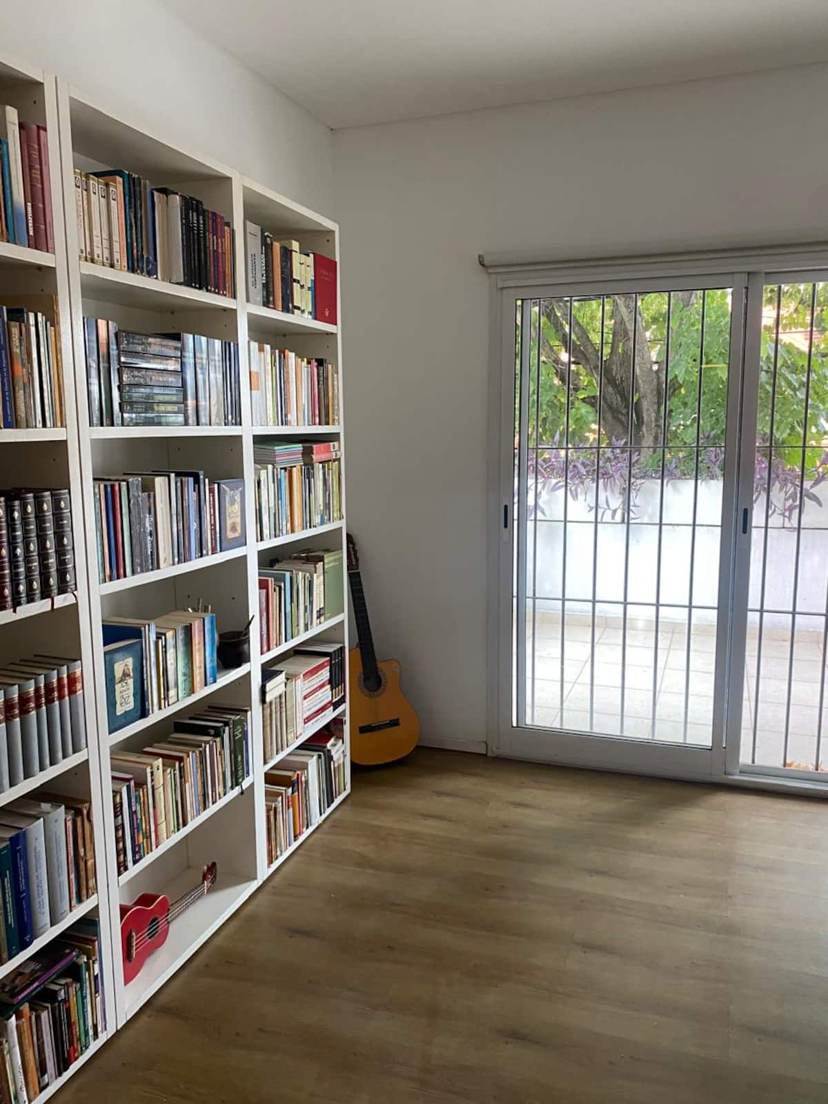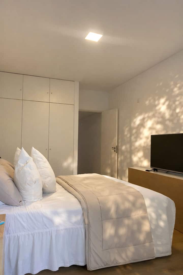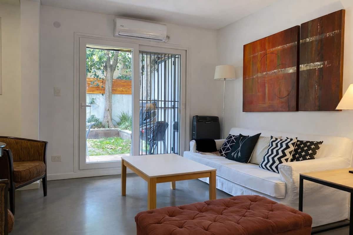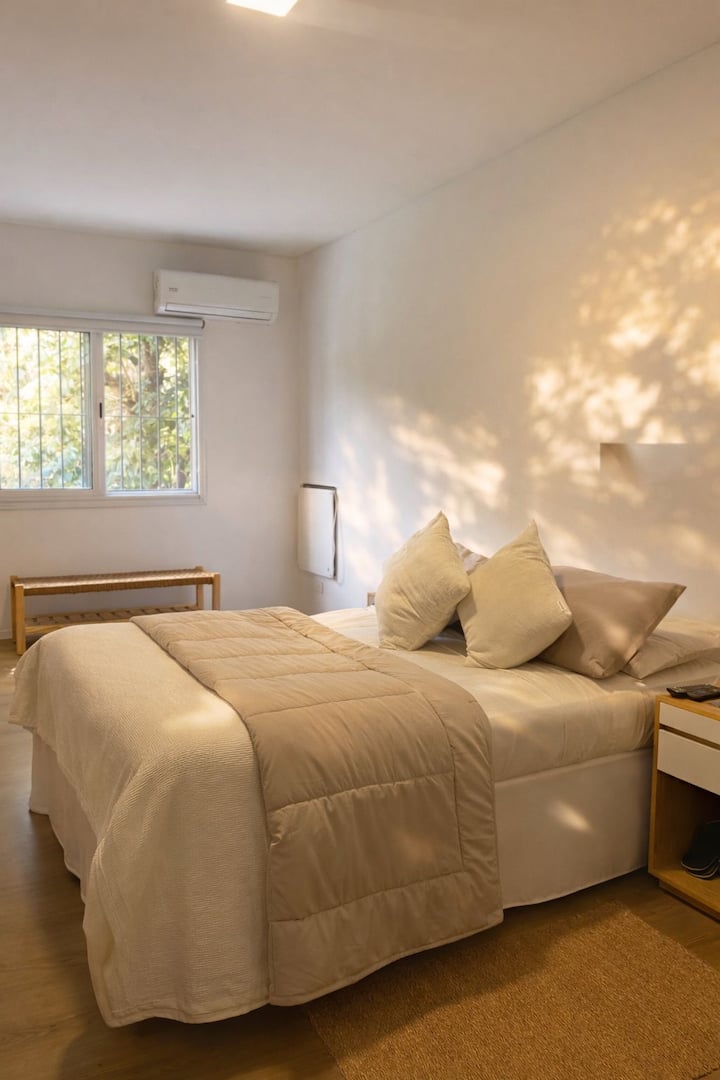 Casa de dois andares com entrada independente em San Fernando. No piso térreo: cozinha e sala de jantar, lavabo e sala de estar com vista para um jardim de 5x4 m com árvores. No andar superior: dormitório em suíte com cama de casal, espaço de leitura/escritório com biblioteca e terraço privativo. Há Wi‑Fi, TV, máquina de lavar e janelas com vidro duplo (DVH). A 1,5 quarteirão da estação Mitre e a 5 quarteirões da praça principal.