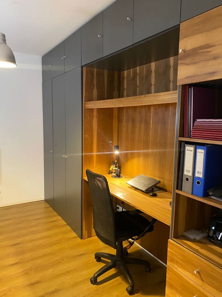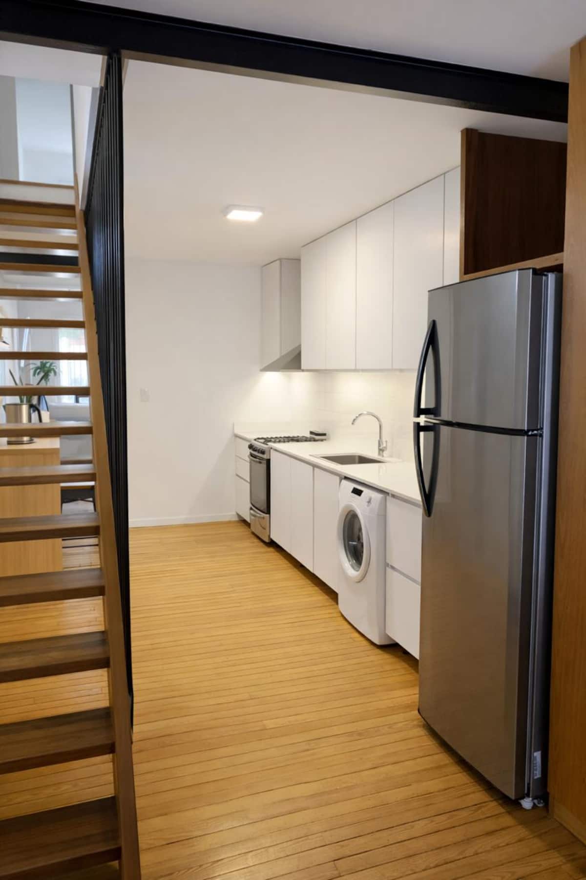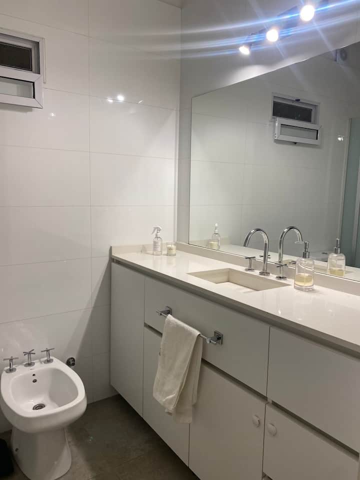 Casa de dois andares com entrada independente em San Fernando. No piso térreo: cozinha e sala de jantar, lavabo e sala de estar com vista para um jardim de 5x4 m com árvores. No andar superior: dormitório em suíte com cama de casal, espaço de leitura/escritório com biblioteca e terraço privativo. Há Wi‑Fi, TV, máquina de lavar e janelas com vidro duplo (DVH). A 1,5 quarteirão da estação Mitre e a 5 quarteirões da praça principal.