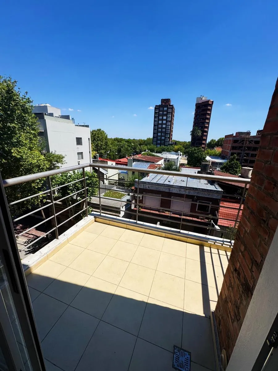 Apartamento de 2 ambientes em San Fernando, com sala de estar e jantar com ventilação cruzada e 2 varandas. Cozinha integrada e mobiliada, com banheiro de recepção. O quarto em suíte tem armários e acesso à varanda da frente. A unidade é 100% elétrica e aceita animal de pequeno porte. No último andar, há terraço com jacuzzi de uso comum, além de elevador e sistema de segurança no edifício.