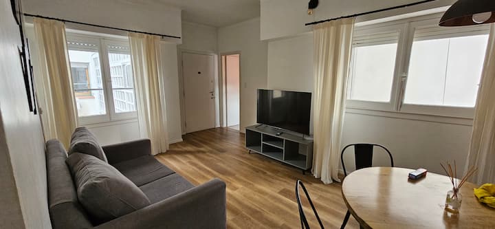 Apartamento de 2 ambientes em San Nicolás, em Buenos Aires. O imóvel tem cozinha funcional, 2 TVs, WiFi de alta velocidade e máquina de lavar. Há ar-condicionado no quarto e banheiro completo. Está a poucos metros da Av. Callao, da Av. Córdoba e da Av. Corrientes.