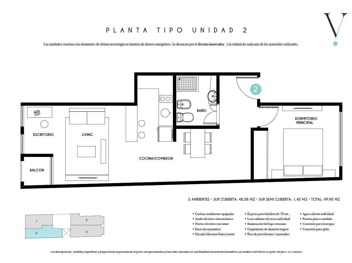Apartamento de 2 ambientes (1 quarto) novo (nunca habitado), de frente para a rua, no 2º piso. Cozinha equipada e banheiro completo com box de vidro; aquecimento de água individual por termotanque elétrico Longvie. Aquecimento por piso radiante elétrico com termostatos individuais por ambiente e 2 ar-condicionados, além de acesso digital na unidade. O prédio tem controle de acesso 24h e câmeras; área de terraço com piscina, solário, área de churrasco, laundry e bicicletário. Localizado em Viamon