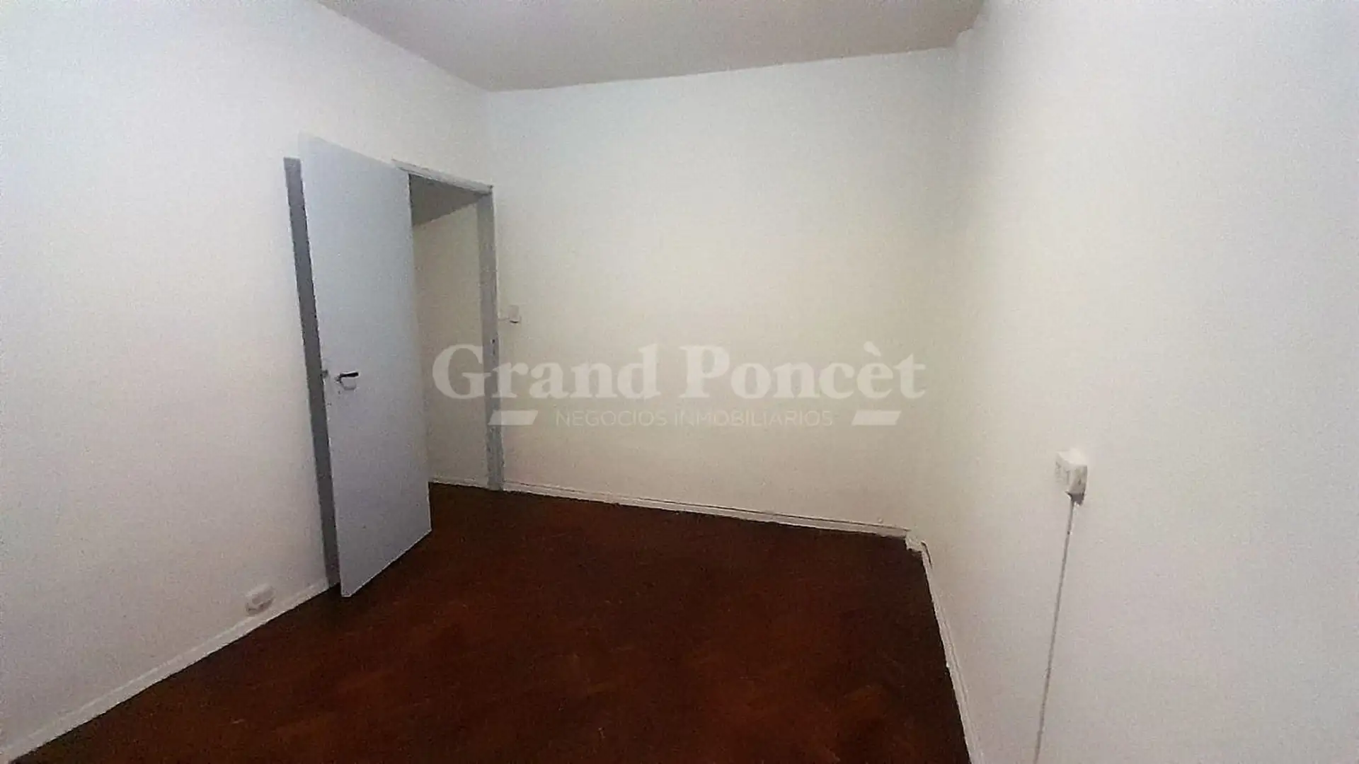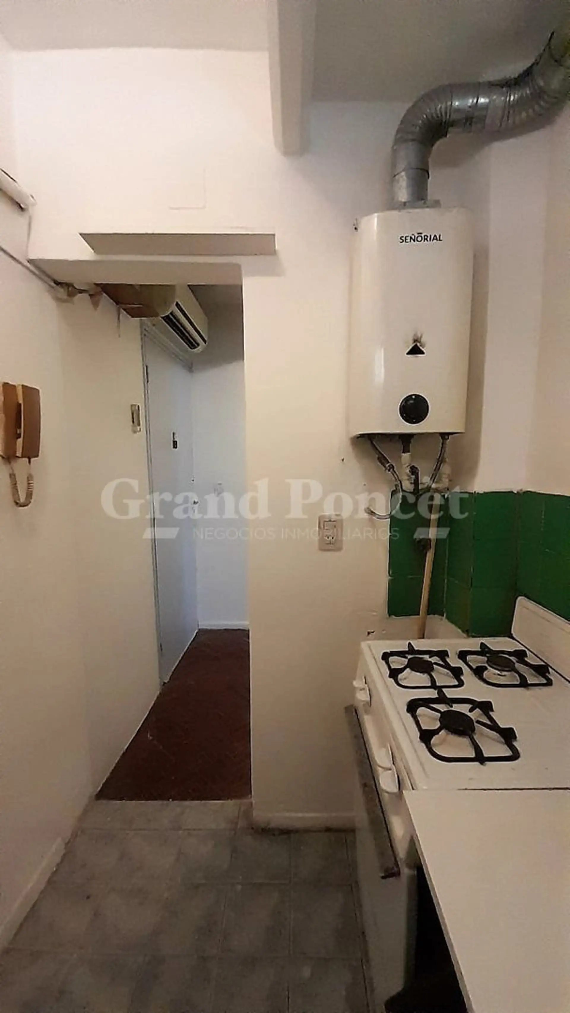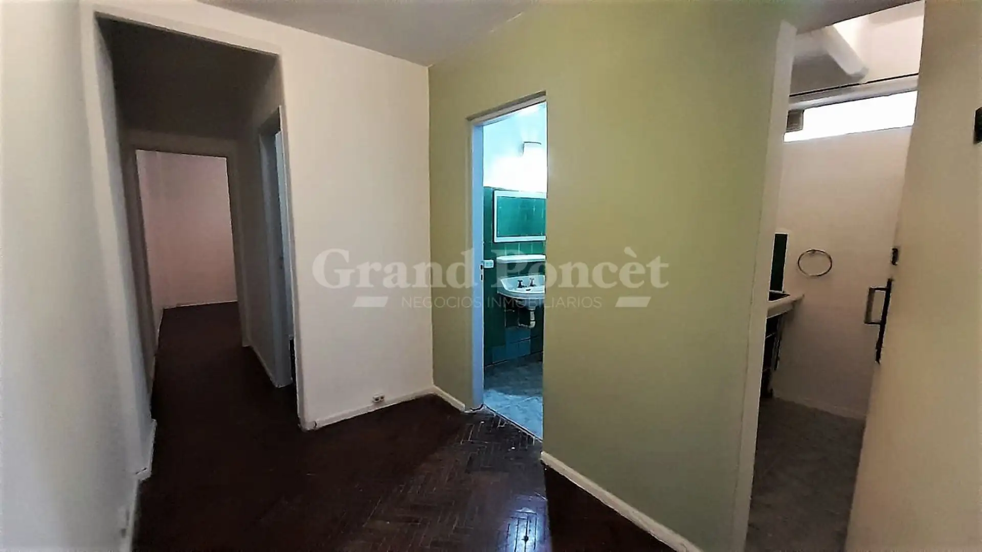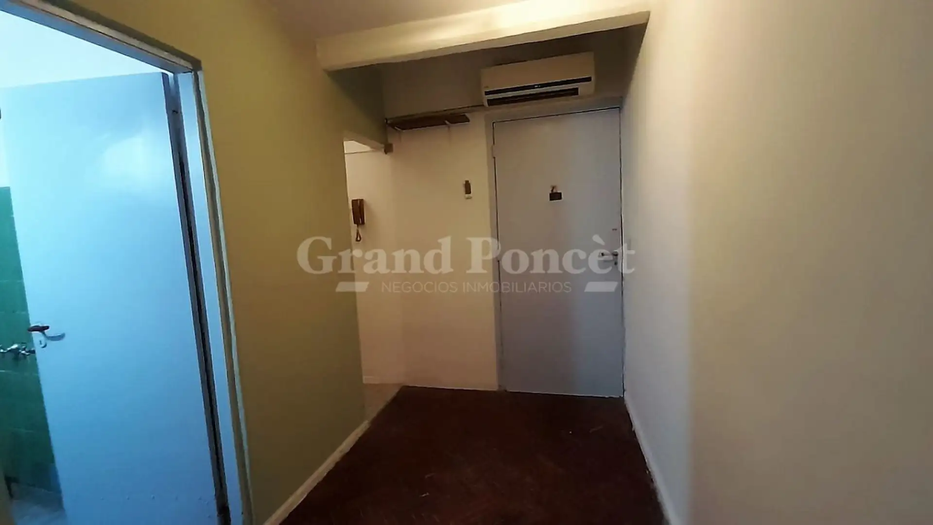 Apartamento com dois ambientes e meio, no térreo de frente, em San Telmo. Possui hall de entrada, cozinha, banheiro com box, corredor e 2 dormitórios. Tem 30 m² totais, com pisos de parquet e apto para uso profissional, com linha telefônica.