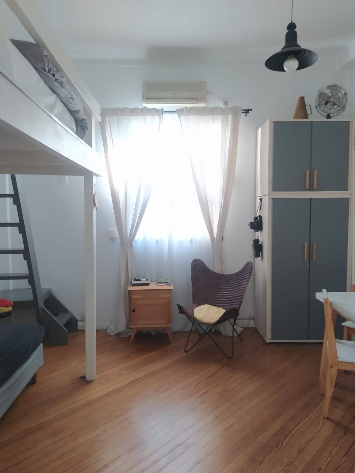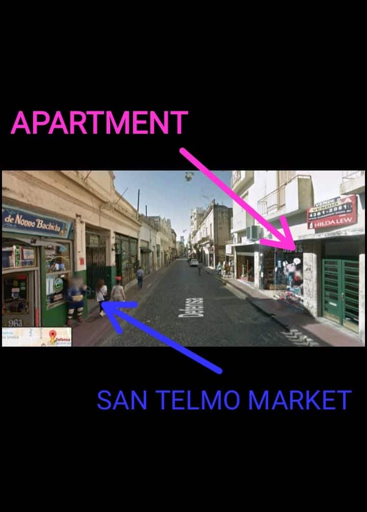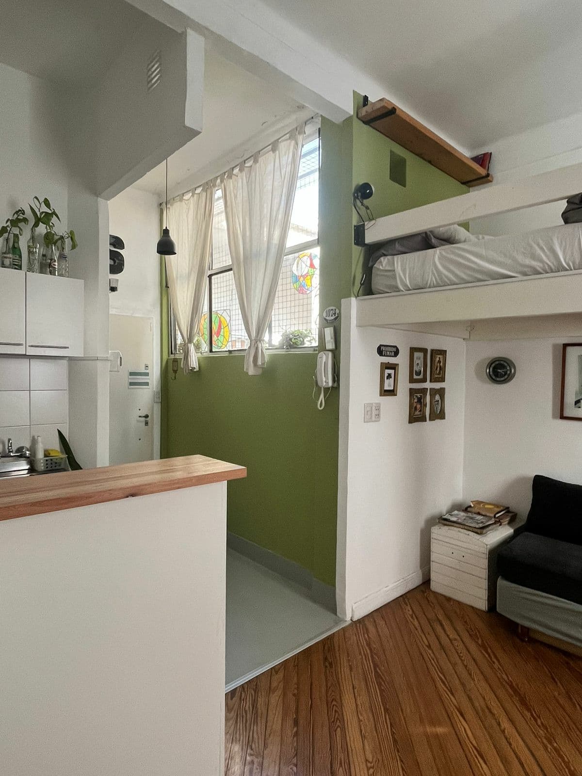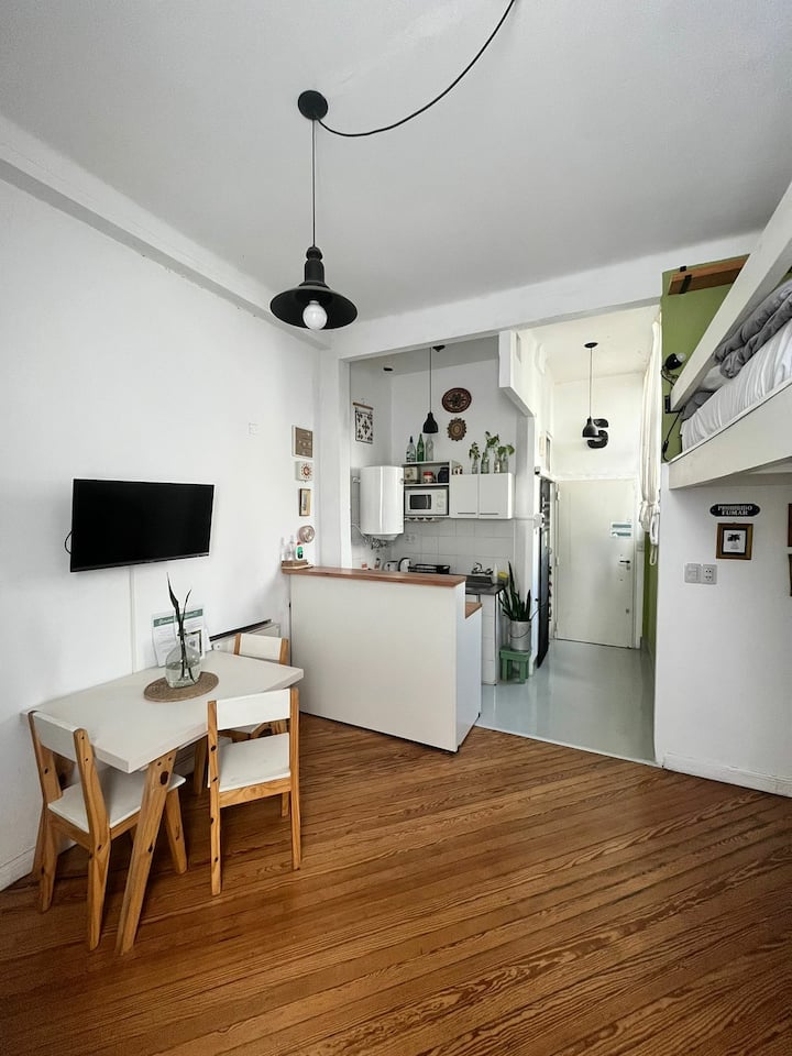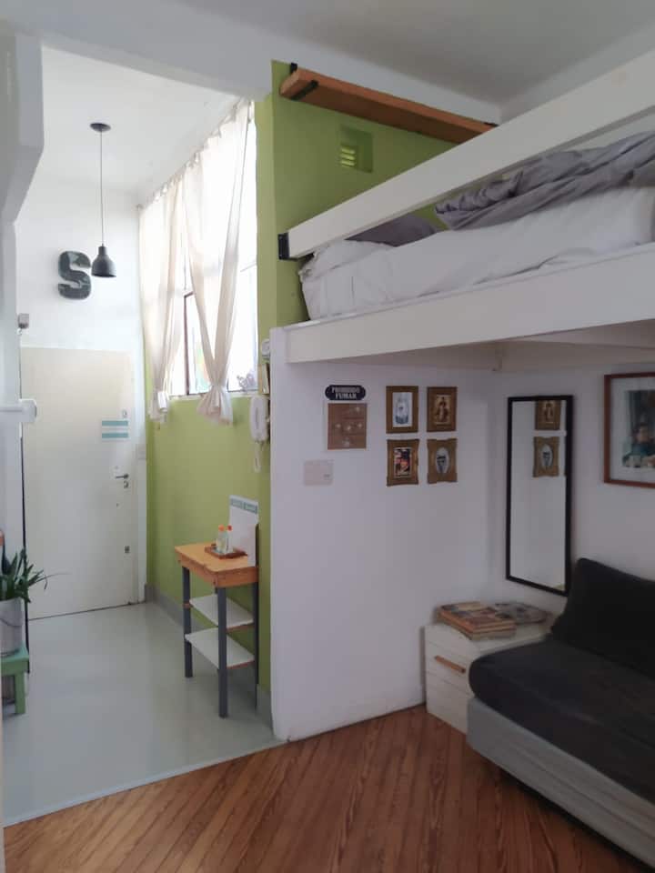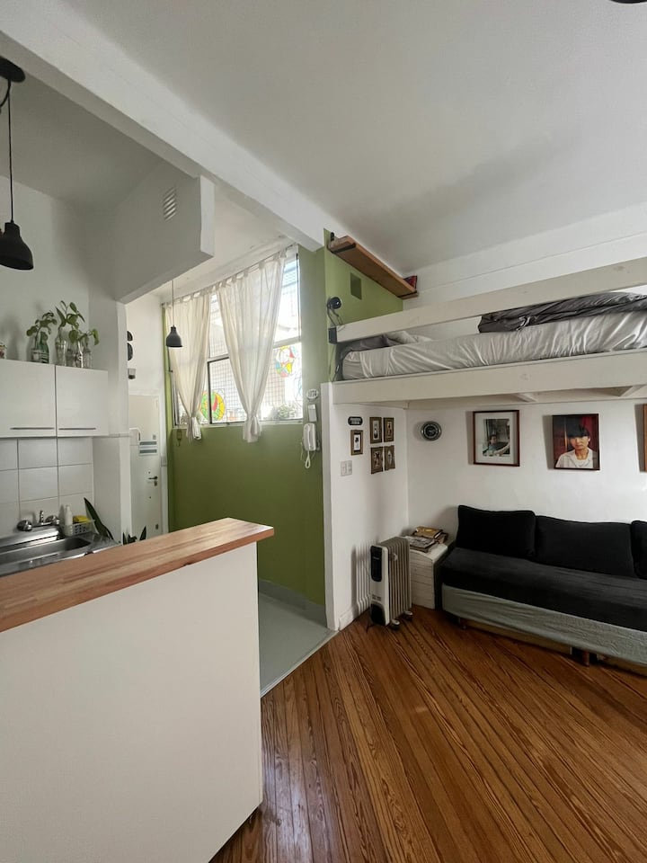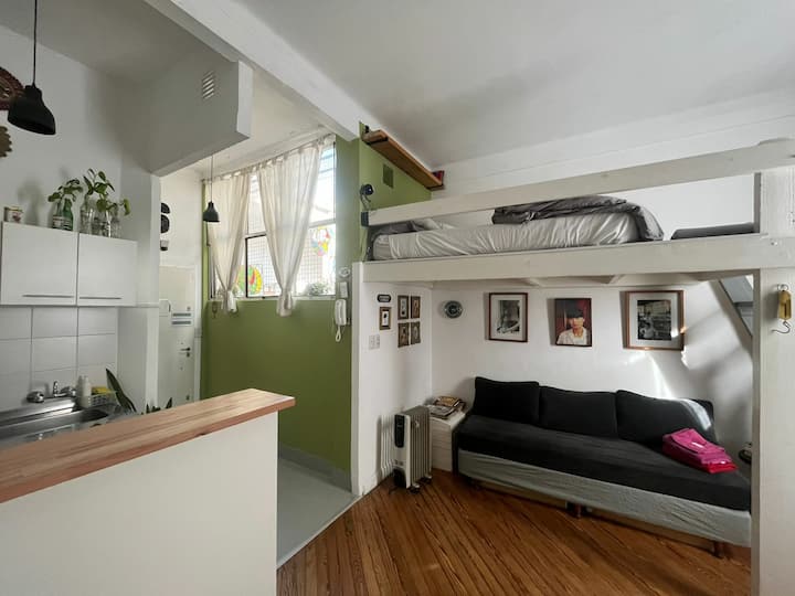 Apartamento tipo loft em San Telmo, recentemente reformado, em segundo andar acessado por escadas. Possui 1 cama de casal em mezanino e 1 cama de solteiro, com capacidade máxima de 3 pessoas, além de água quente 24 horas. Inclui TV LED, Wi-Fi, cozinha equipada com micro-ondas e geladeira, ar-condicionado (quente e frio), aquecimento, porta de segurança, roupas de cama e toalhas. É possível solicitar check-in antecipado e check-out tardio mediante custo adicional de US$12 cada, sujeito à disponib