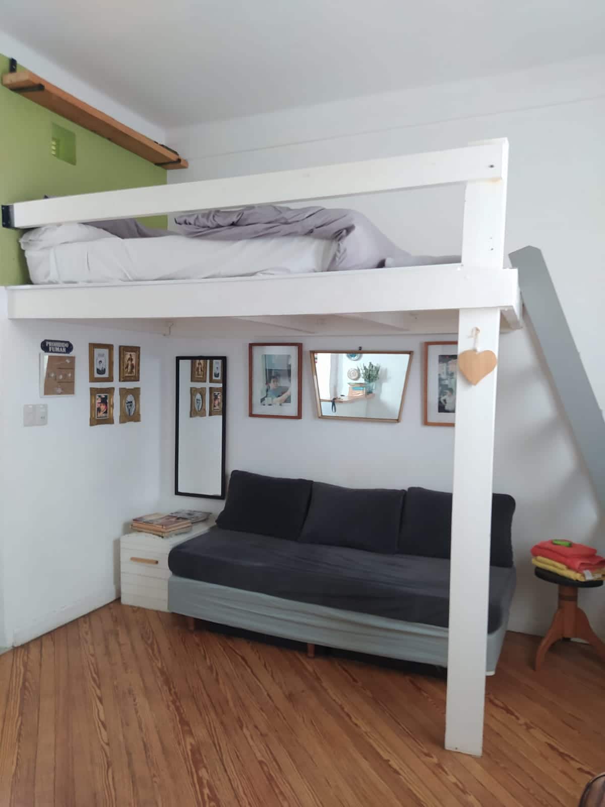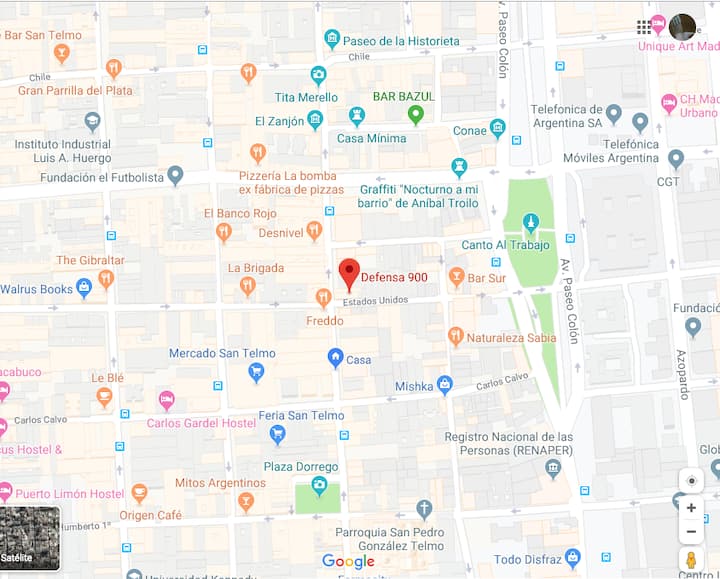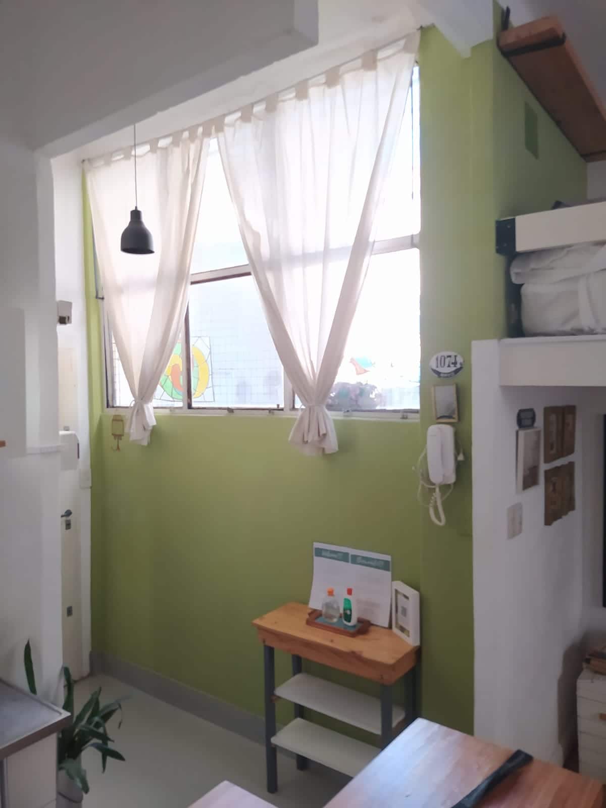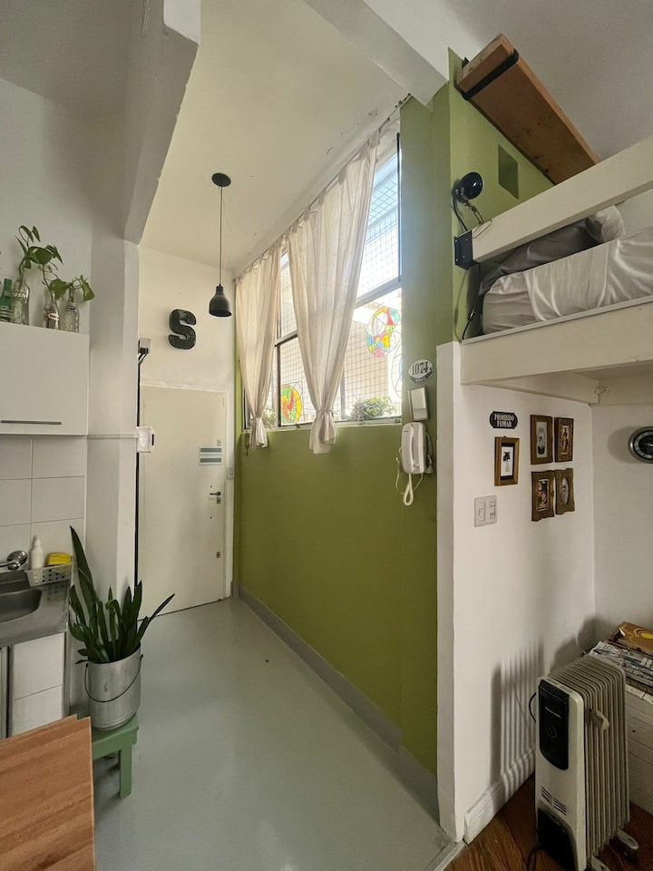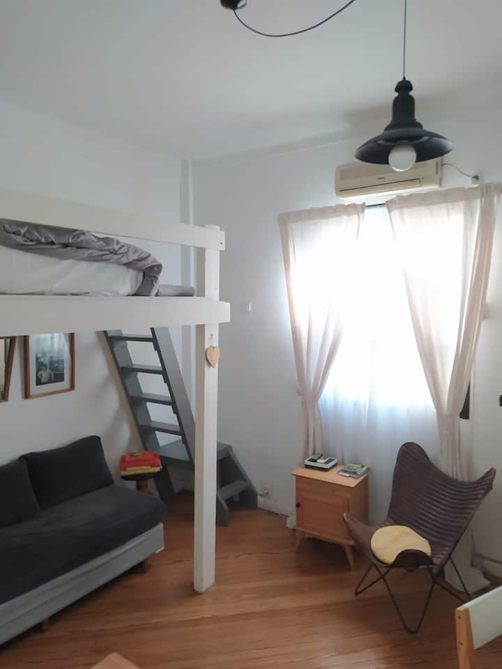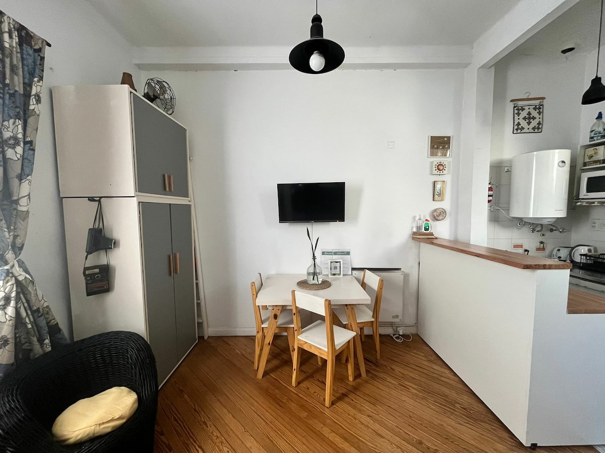Apartamento tipo loft em San Telmo, recentemente reformado, em segundo andar acessado por escadas. Possui 1 cama de casal em mezanino e 1 cama de solteiro, com capacidade máxima de 3 pessoas, além de água quente 24 horas. Inclui TV LED, Wi-Fi, cozinha equipada com micro-ondas e geladeira, ar-condicionado (quente e frio), aquecimento, porta de segurança, roupas de cama e toalhas. É possível solicitar check-in antecipado e check-out tardio mediante custo adicional de US$12 cada, sujeito à disponib