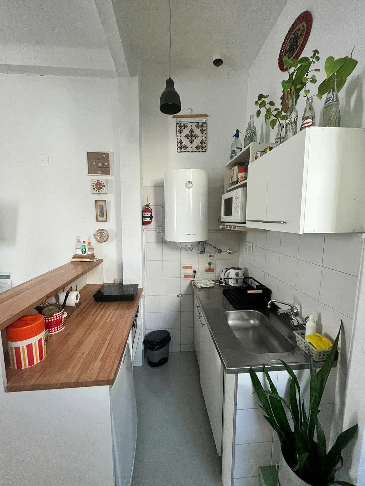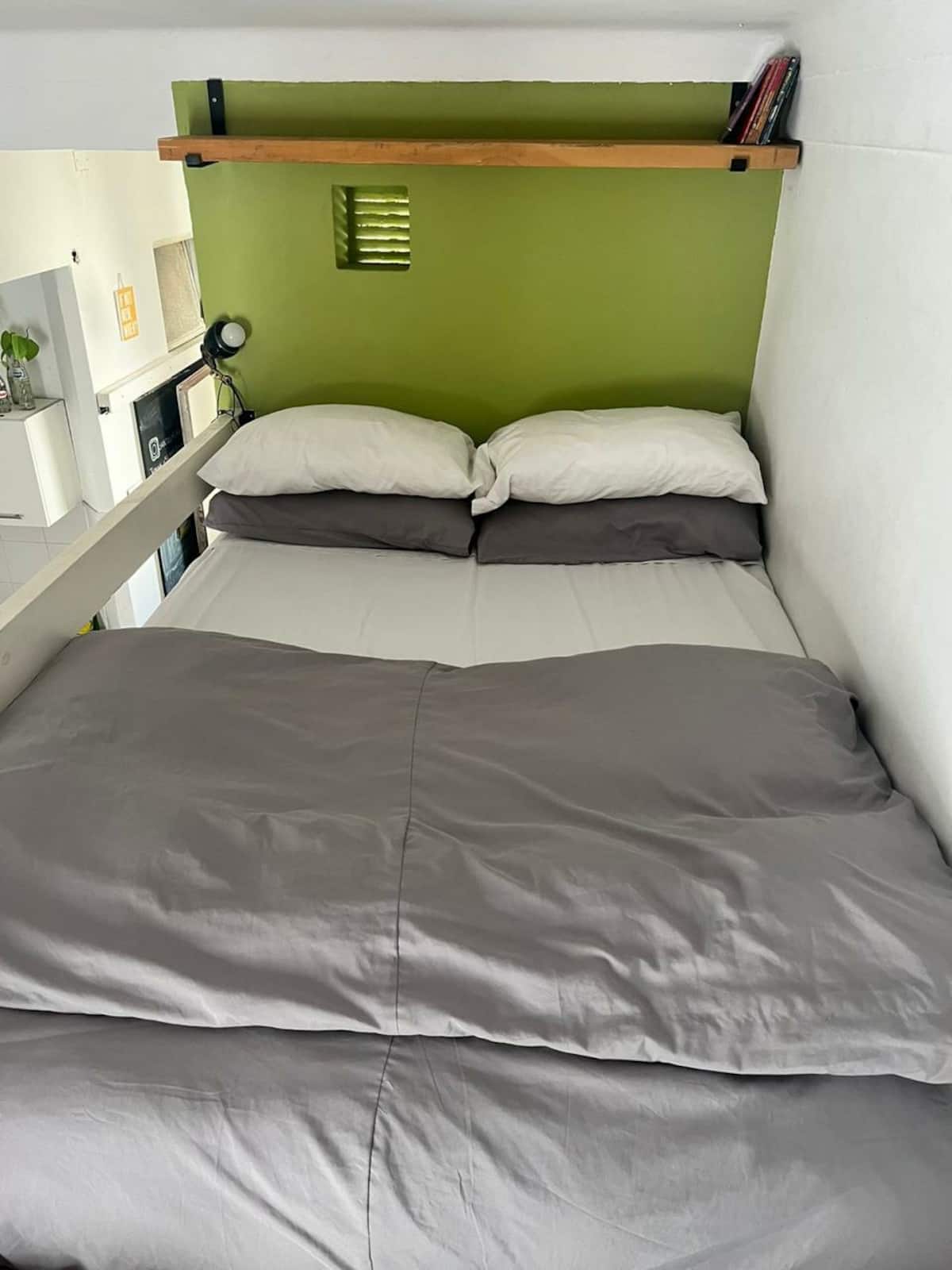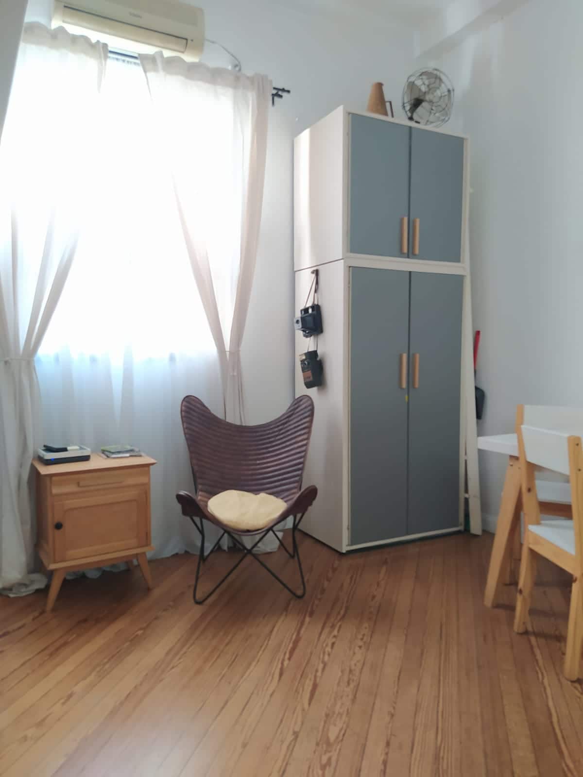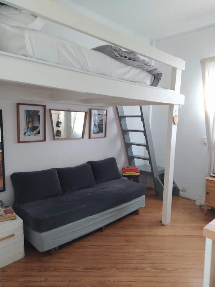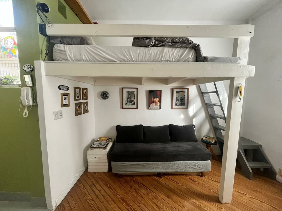 Apartamento tipo loft em San Telmo, recentemente reformado, em segundo andar acessado por escadas. Possui 1 cama de casal em mezanino e 1 cama de solteiro, com capacidade máxima de 3 pessoas, além de água quente 24 horas. Inclui TV LED, Wi-Fi, cozinha equipada com micro-ondas e geladeira, ar-condicionado (quente e frio), aquecimento, porta de segurança, roupas de cama e toalhas. É possível solicitar check-in antecipado e check-out tardio mediante custo adicional de US$12 cada, sujeito à disponib