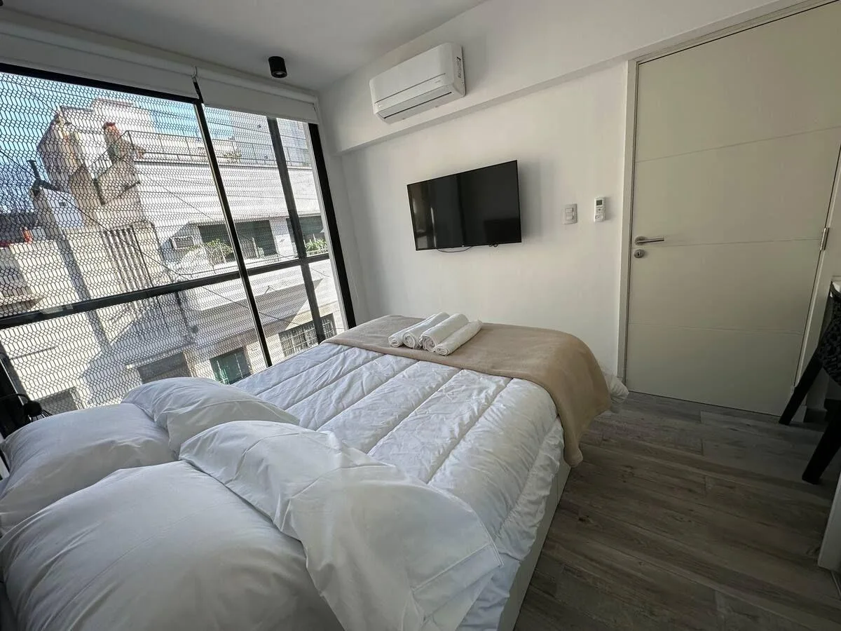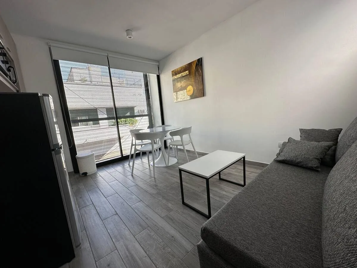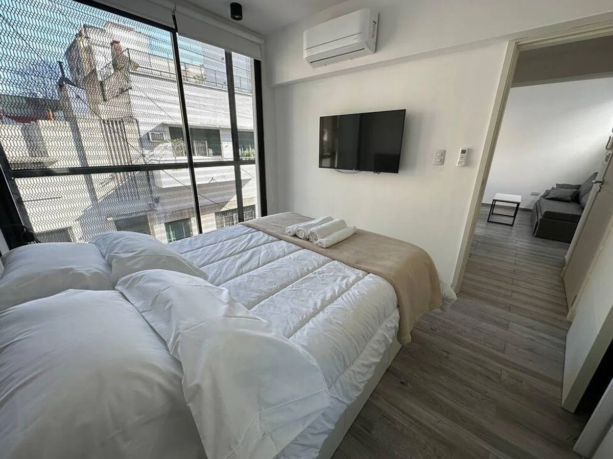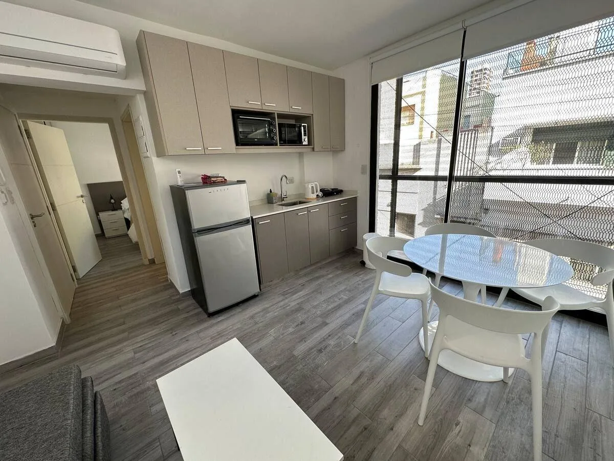 Apartamento de 1 quarto em San Telmo, mobiliado e equipado. Inclui cama de casal, mesa com cadeiras, sofá-cama, banheiro completo e ar-condicionado tipo split frio-quente. Cozinha equipada. Não há vaga de garagem. O valor anunciado é final e inclui condomínio, ABL, internet, luz e demais serviços. Requer 1 mês de depósito e 1 mês de fiança de aluguel. O aluguel é pago mensalmente antecipadamente em dólar bilhete.