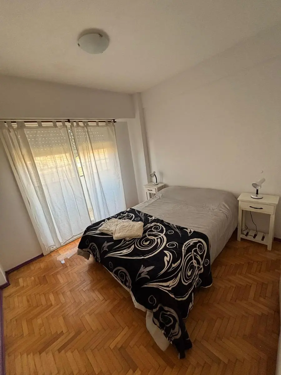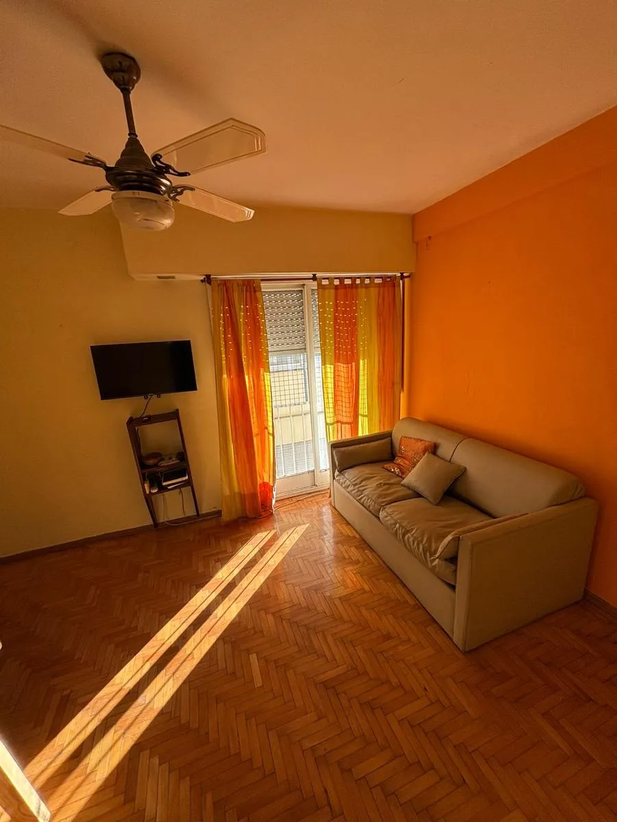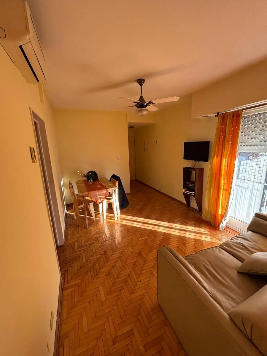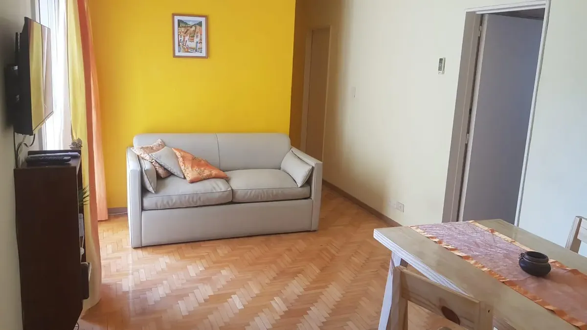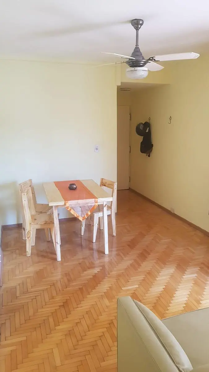Apartamento de 2 ambientes com 45 m², varanda de fundos e vista lateral. Mobiliado e equipado, com pisos de parquet plastificados e ar-condicionado frio/quente. A unidade dispõe de sala com sofá-cama, TV de 32" e ventilador no quarto, além de cozinha com termotanque elétrico, fogão de 4 bocas com forno, micro-ondas, geladeira e cafeteira. O aluguel temporário é para até 2 pessoas e inclui água, Wi-Fi e condomínio; gás e luz ficam a cargo do inquilino. Disponível a partir de setembro de 2026.