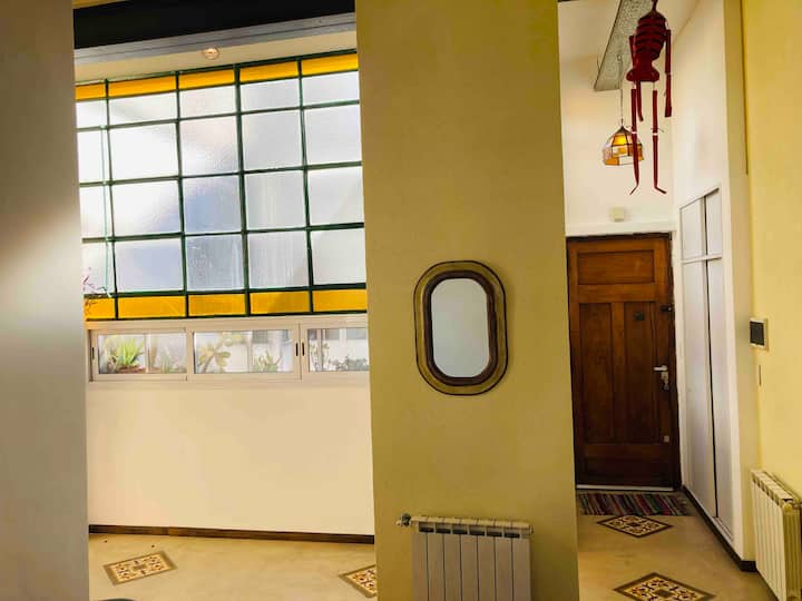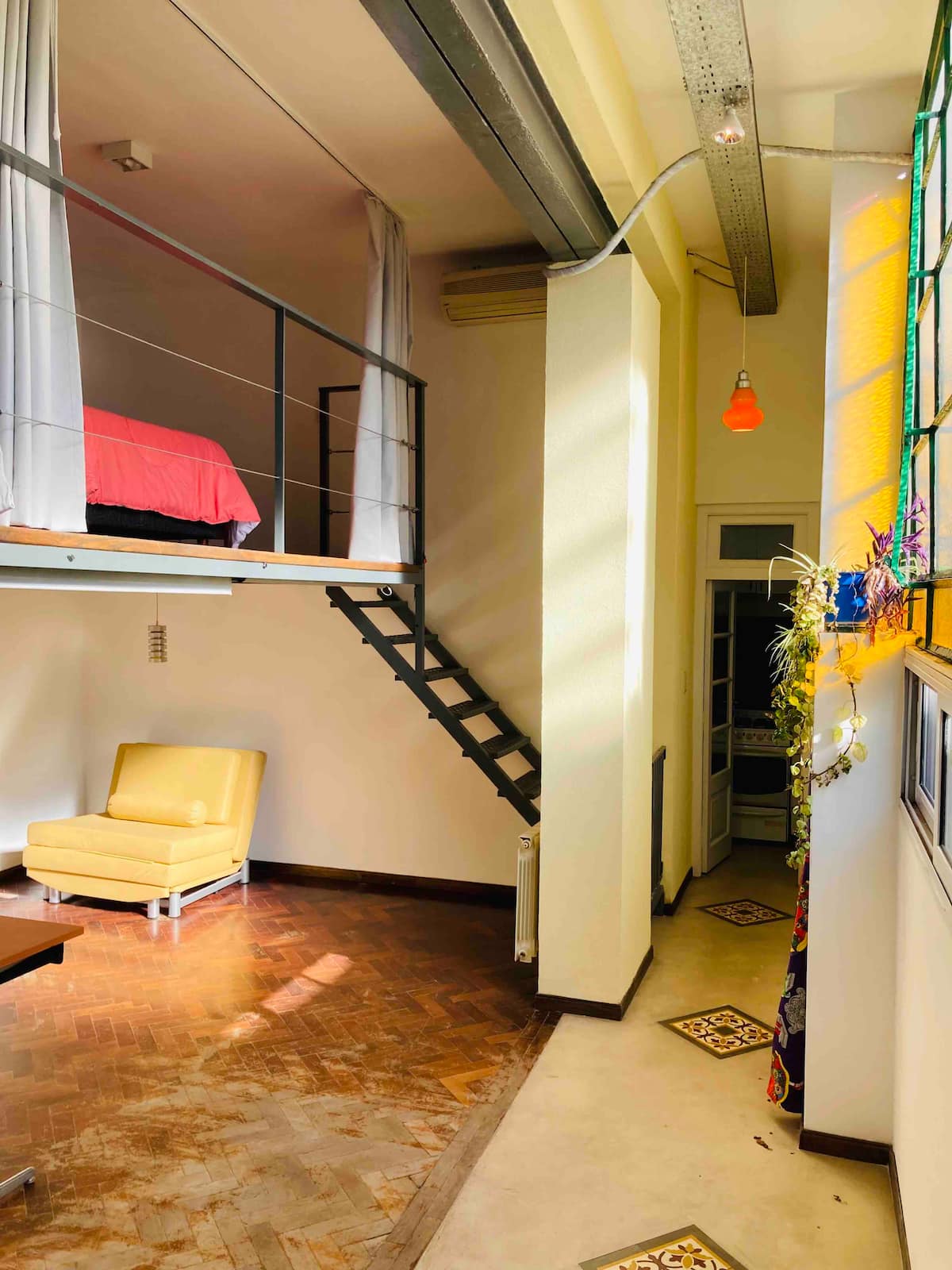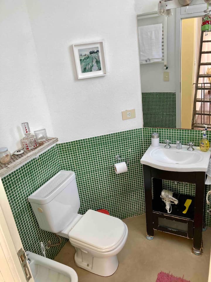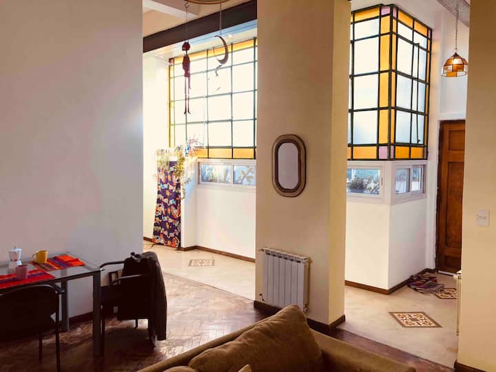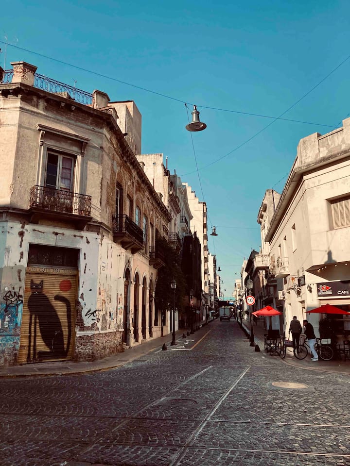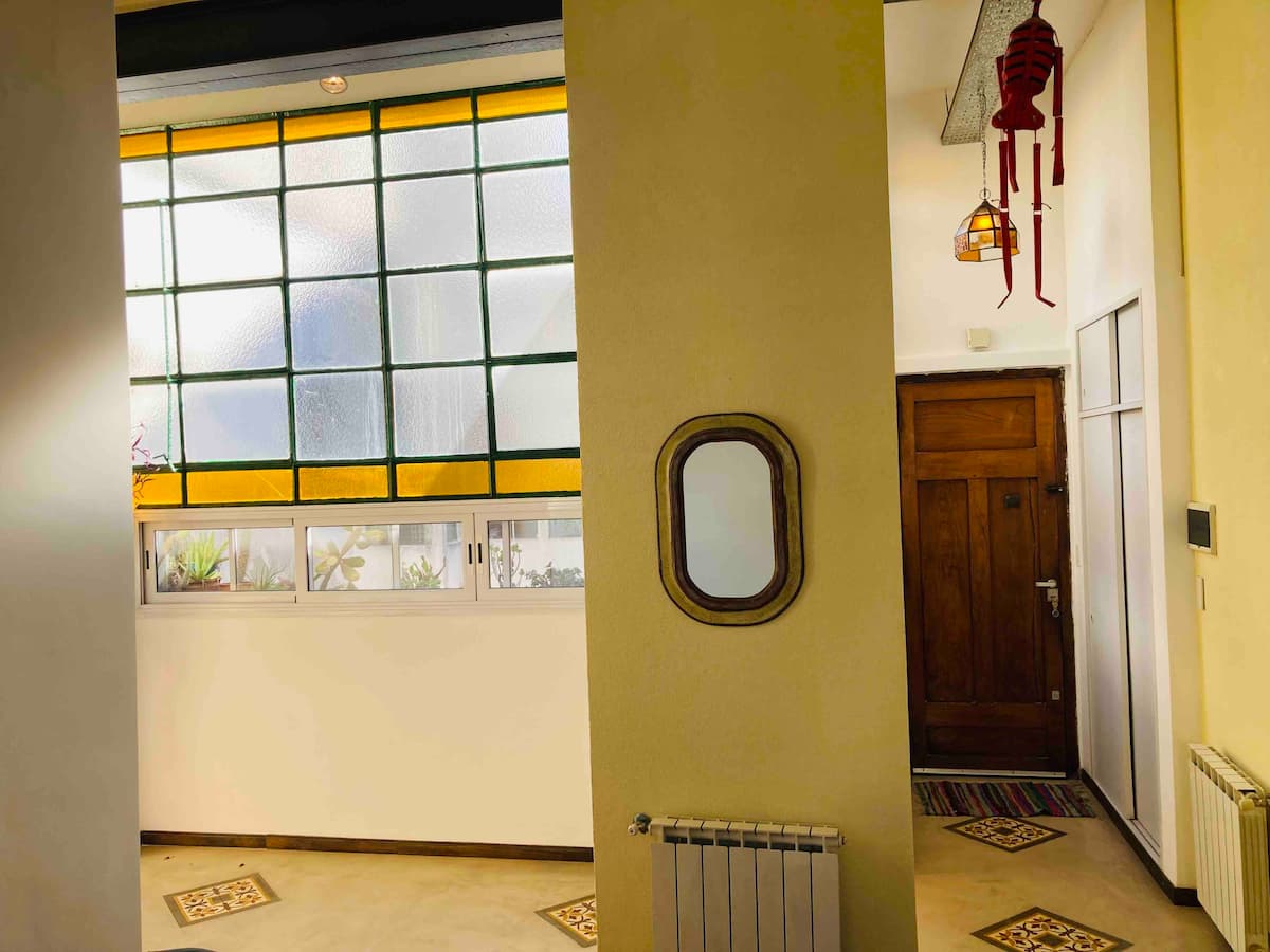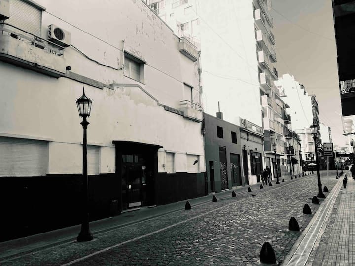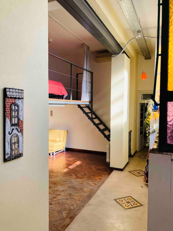 Loft em San Telmo com 45 m², além de 10 m² de mezanino, situado no 1º andar por escada. A área do mezanino abriga o quarto, com cortina blackout. Possui cozinha equipada, banheiro completo com banheira e bidê, aquecimento a boiler e ar-condicionado. Conta com janela grande com vidro colorido e uma ponte externa com plantas. Fica a 100 m da Plaza Dorrego e do Museu de Arte Moderna, a 150 m do Mercado de San Telmo e a 500 m do Parque Lezama, em rua de paralelepípedos, em edifício antigo com térreo