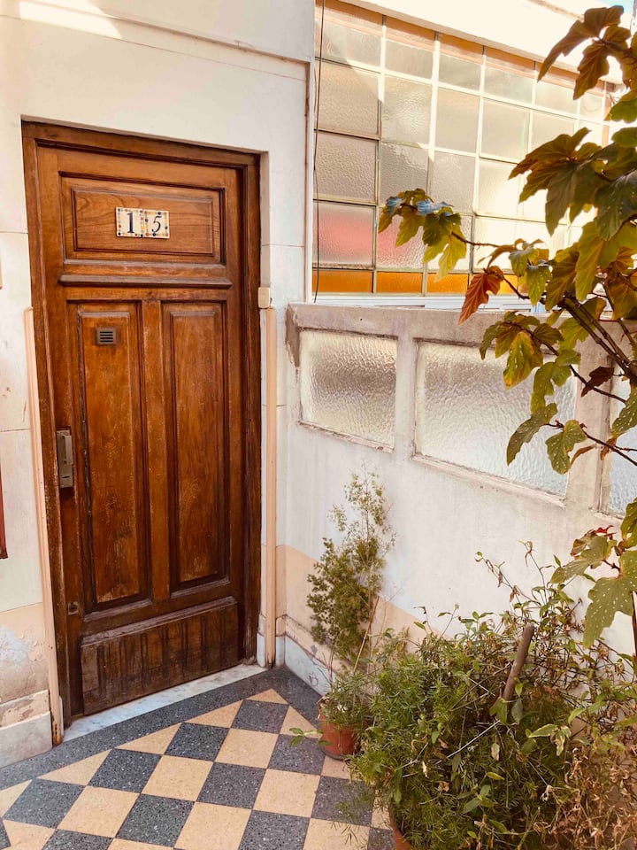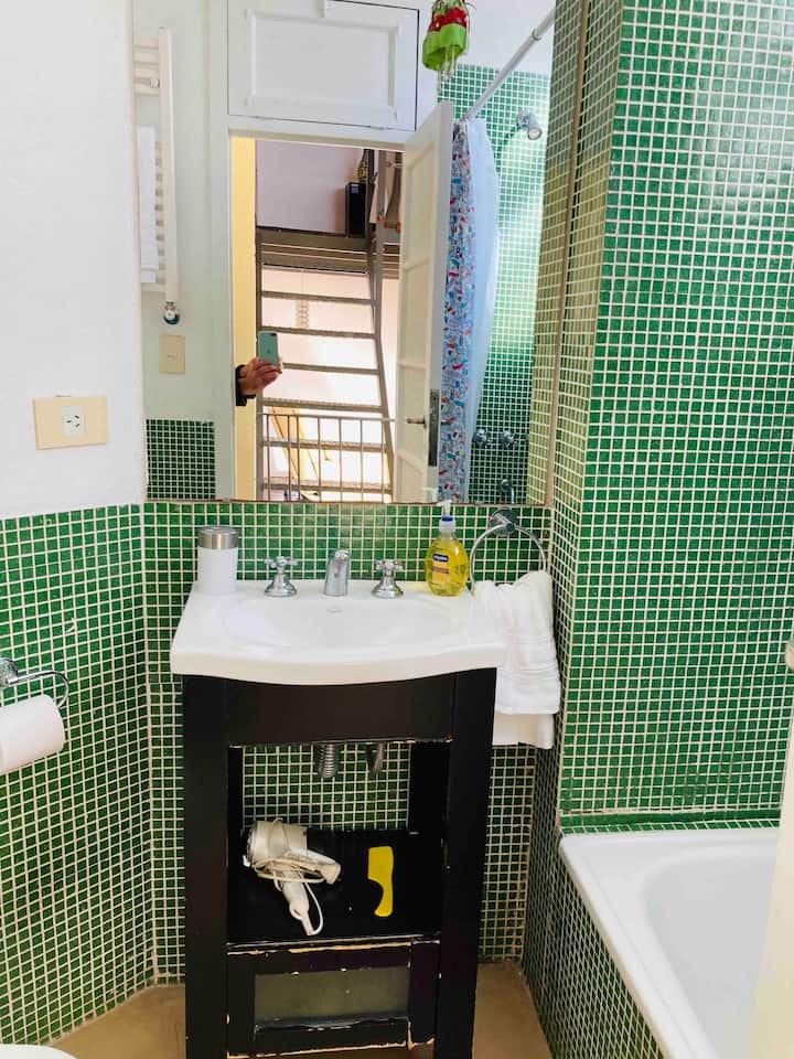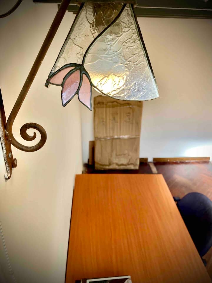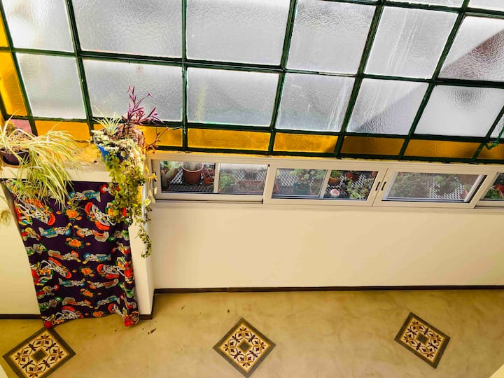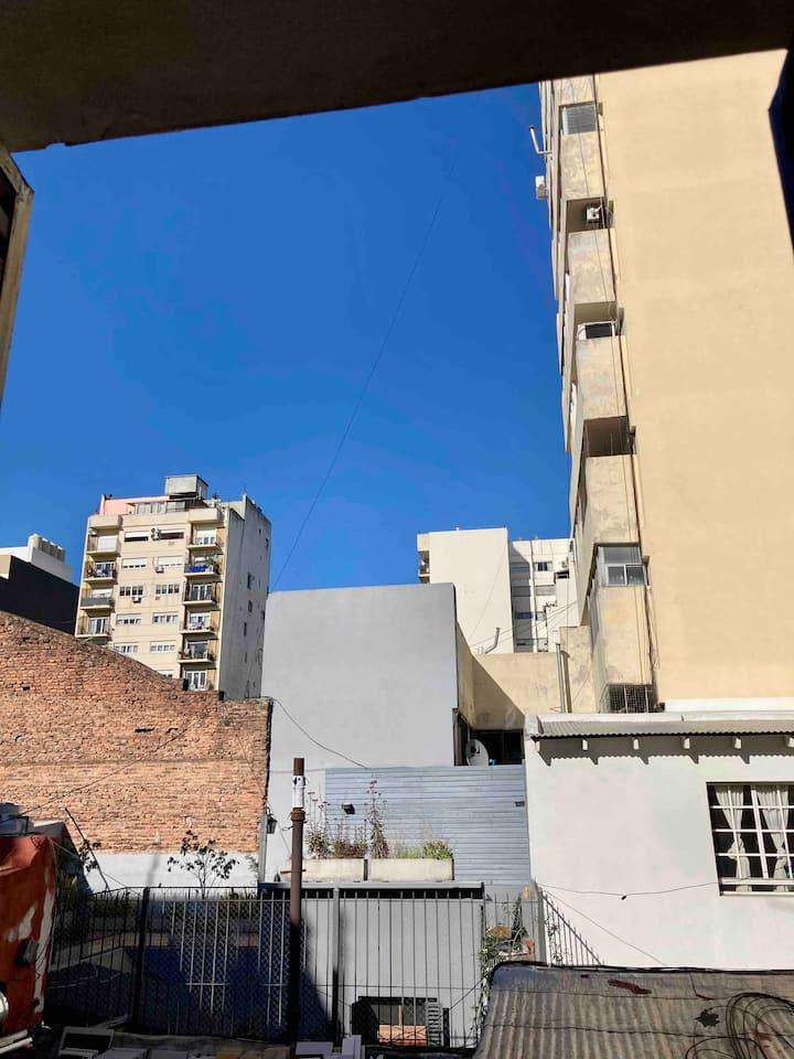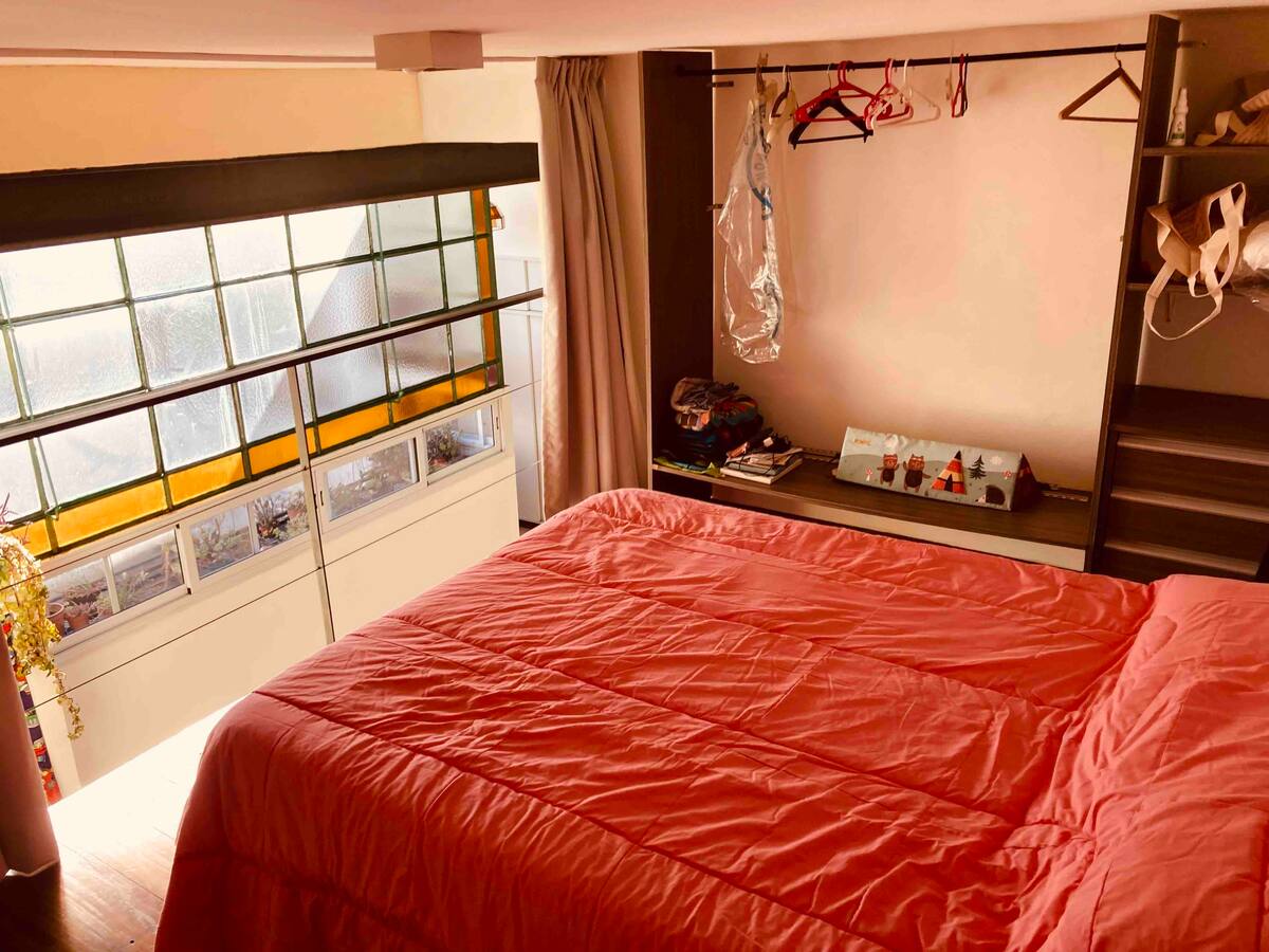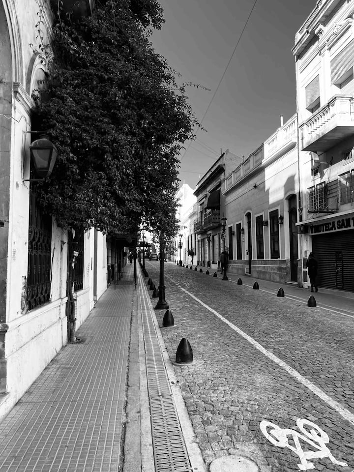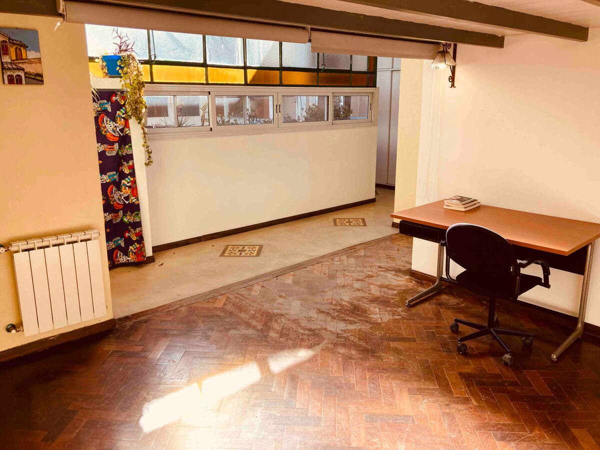 Loft em San Telmo com 45 m², além de 10 m² de mezanino, situado no 1º andar por escada. A área do mezanino abriga o quarto, com cortina blackout. Possui cozinha equipada, banheiro completo com banheira e bidê, aquecimento a boiler e ar-condicionado. Conta com janela grande com vidro colorido e uma ponte externa com plantas. Fica a 100 m da Plaza Dorrego e do Museu de Arte Moderna, a 150 m do Mercado de San Telmo e a 500 m do Parque Lezama, em rua de paralelepípedos, em edifício antigo com térreo