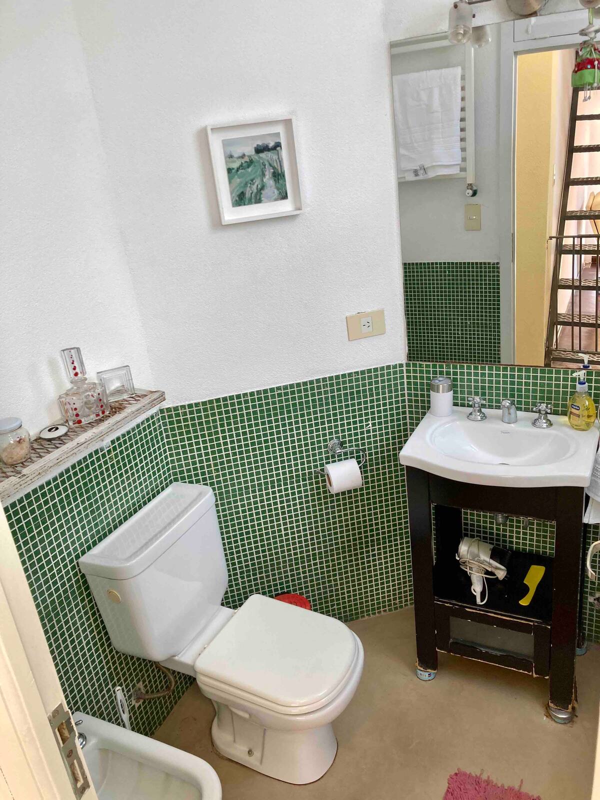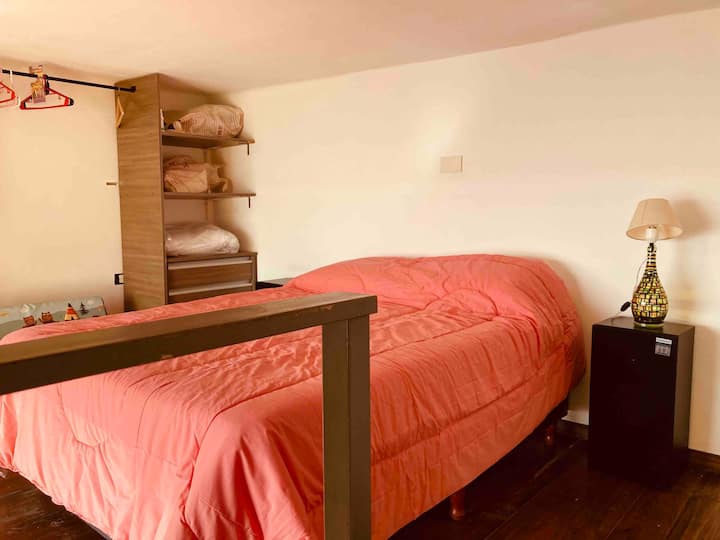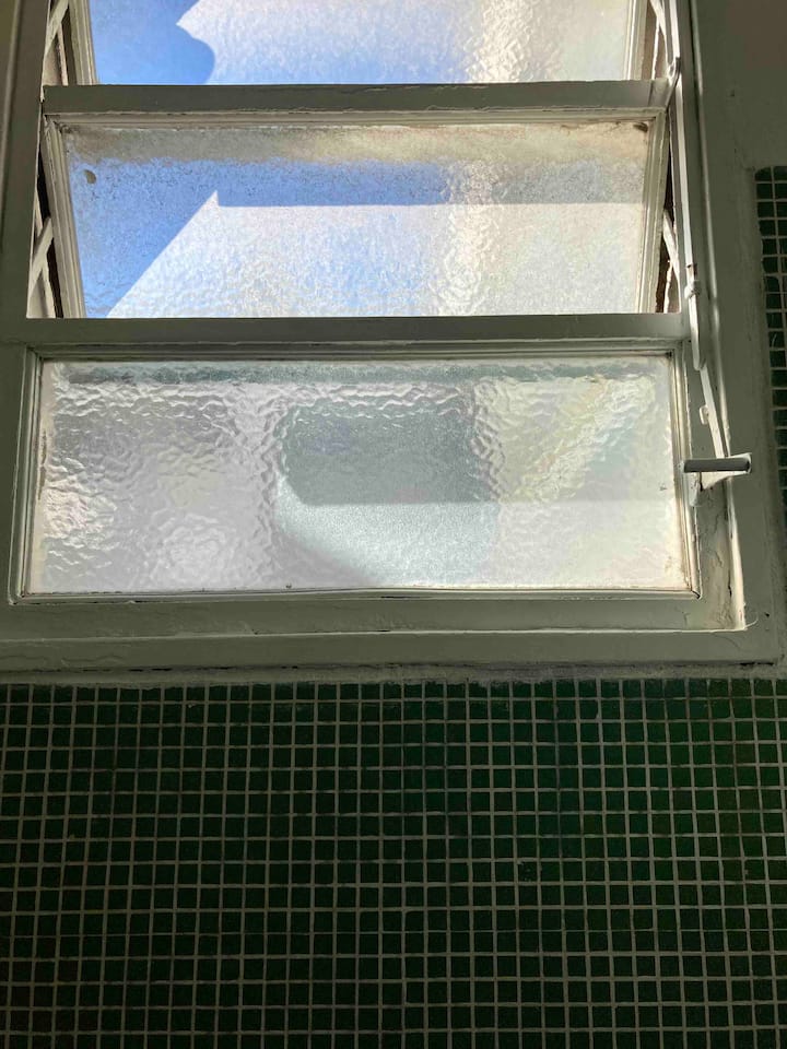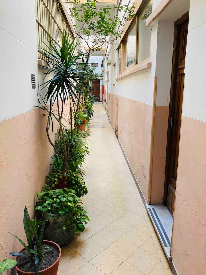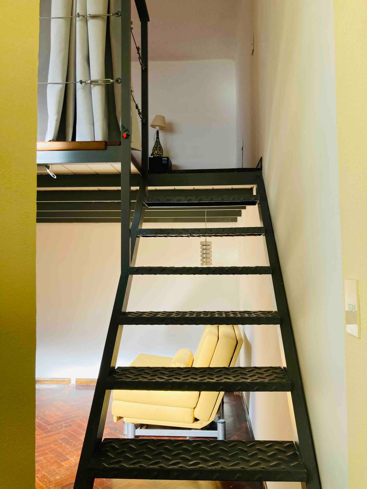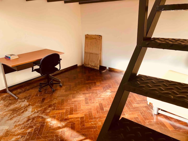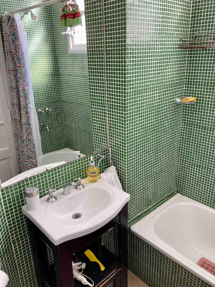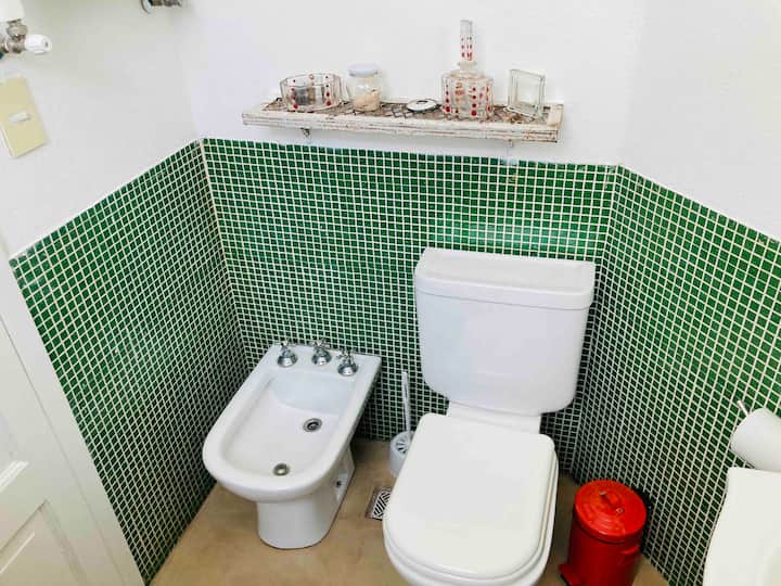 Loft em San Telmo com 45 m², além de 10 m² de mezanino, situado no 1º andar por escada. A área do mezanino abriga o quarto, com cortina blackout. Possui cozinha equipada, banheiro completo com banheira e bidê, aquecimento a boiler e ar-condicionado. Conta com janela grande com vidro colorido e uma ponte externa com plantas. Fica a 100 m da Plaza Dorrego e do Museu de Arte Moderna, a 150 m do Mercado de San Telmo e a 500 m do Parque Lezama, em rua de paralelepípedos, em edifício antigo com térreo