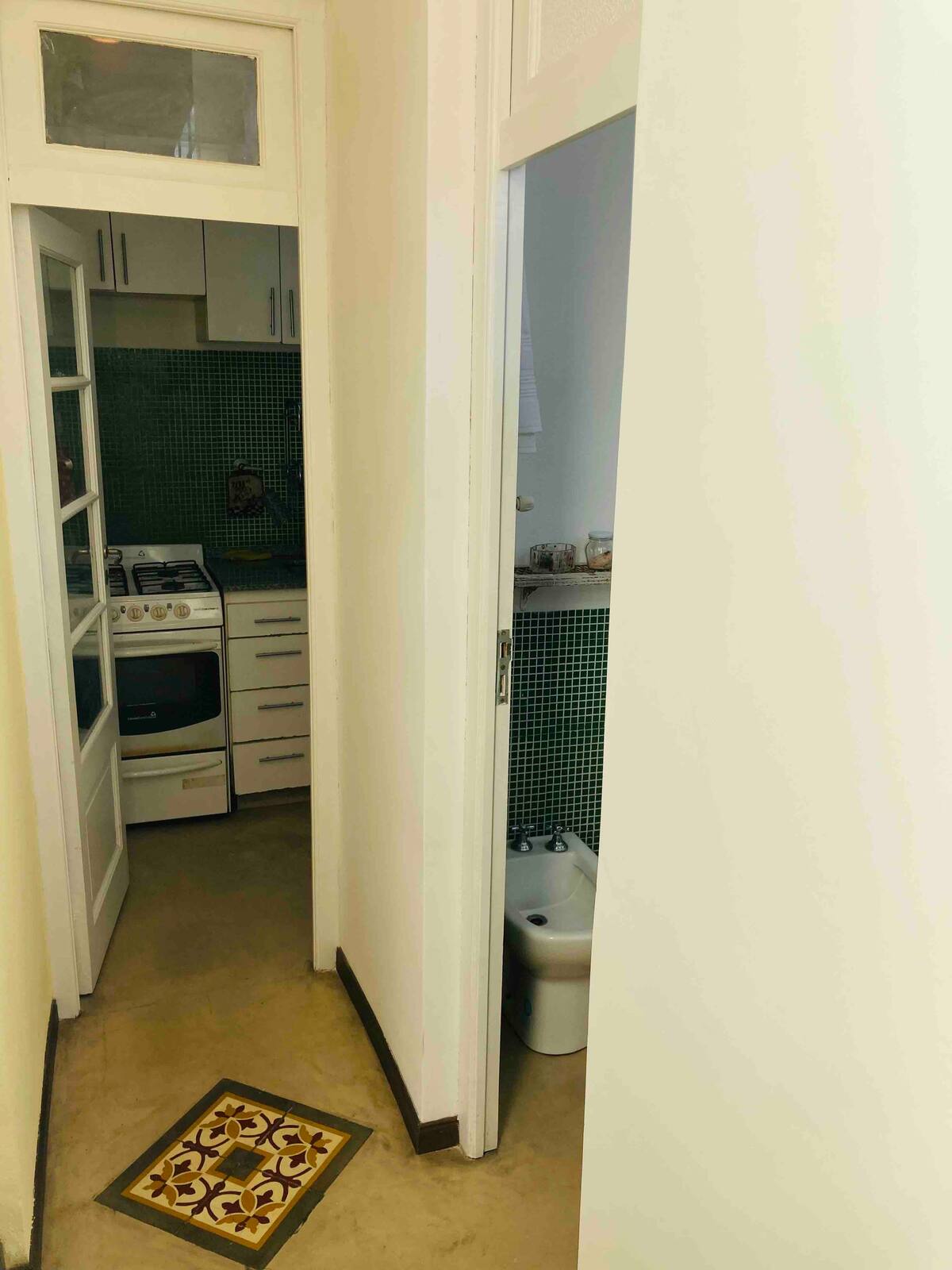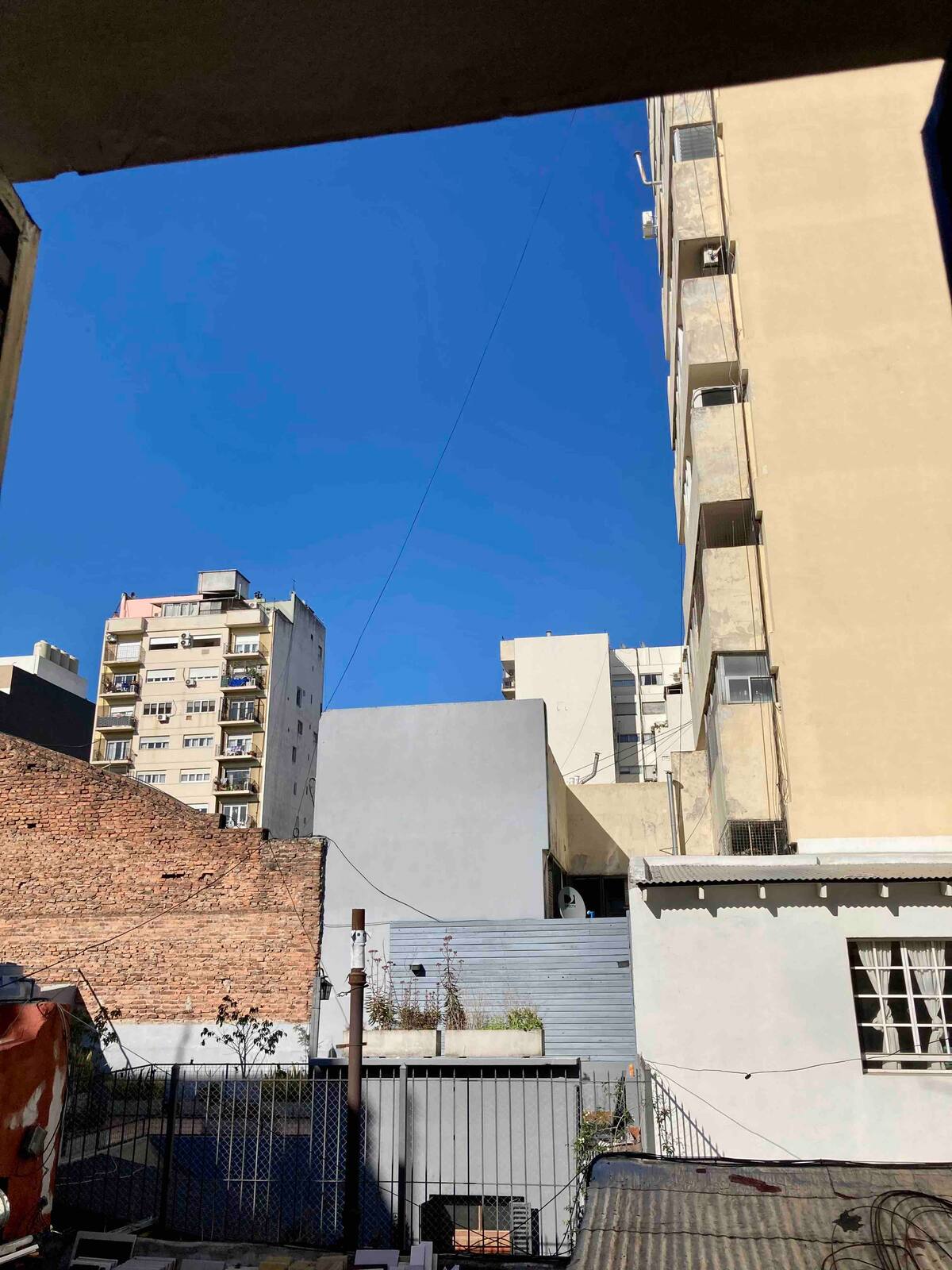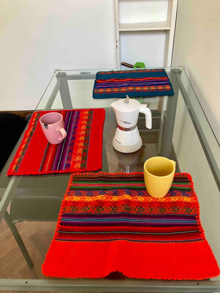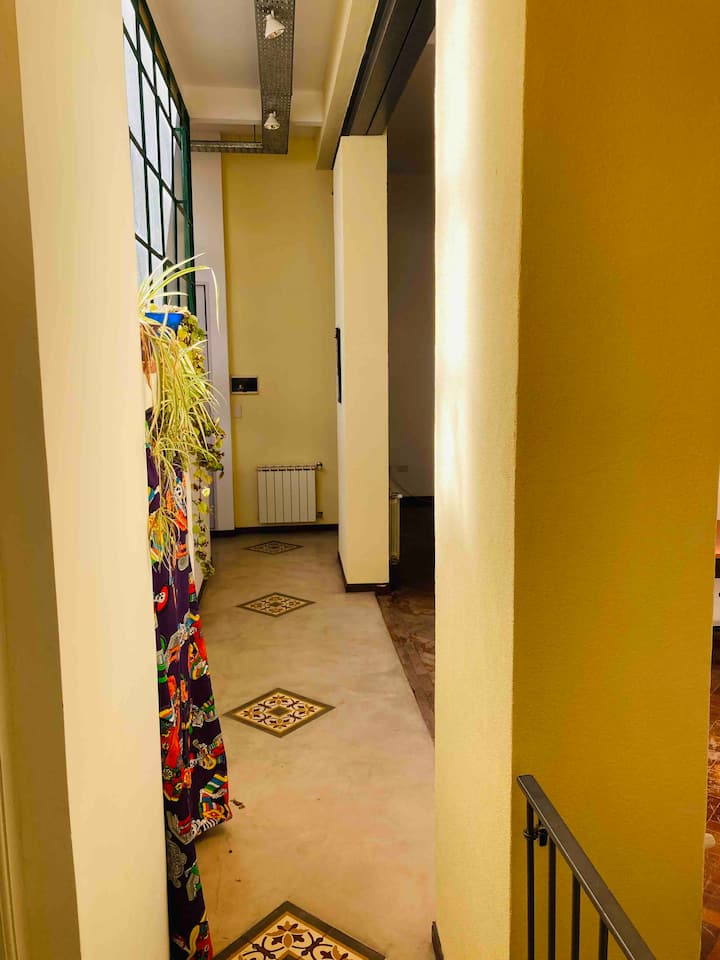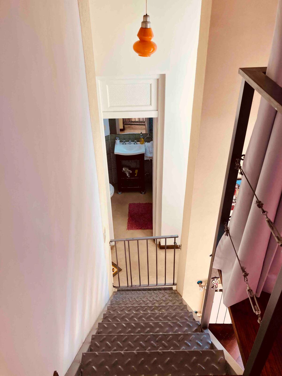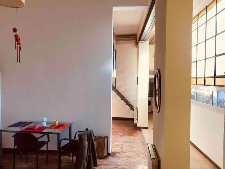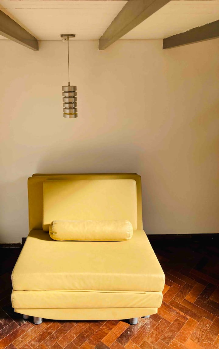 Loft em San Telmo com 45 m², além de 10 m² de mezanino, situado no 1º andar por escada. A área do mezanino abriga o quarto, com cortina blackout. Possui cozinha equipada, banheiro completo com banheira e bidê, aquecimento a boiler e ar-condicionado. Conta com janela grande com vidro colorido e uma ponte externa com plantas. Fica a 100 m da Plaza Dorrego e do Museu de Arte Moderna, a 150 m do Mercado de San Telmo e a 500 m do Parque Lezama, em rua de paralelepípedos, em edifício antigo com térreo