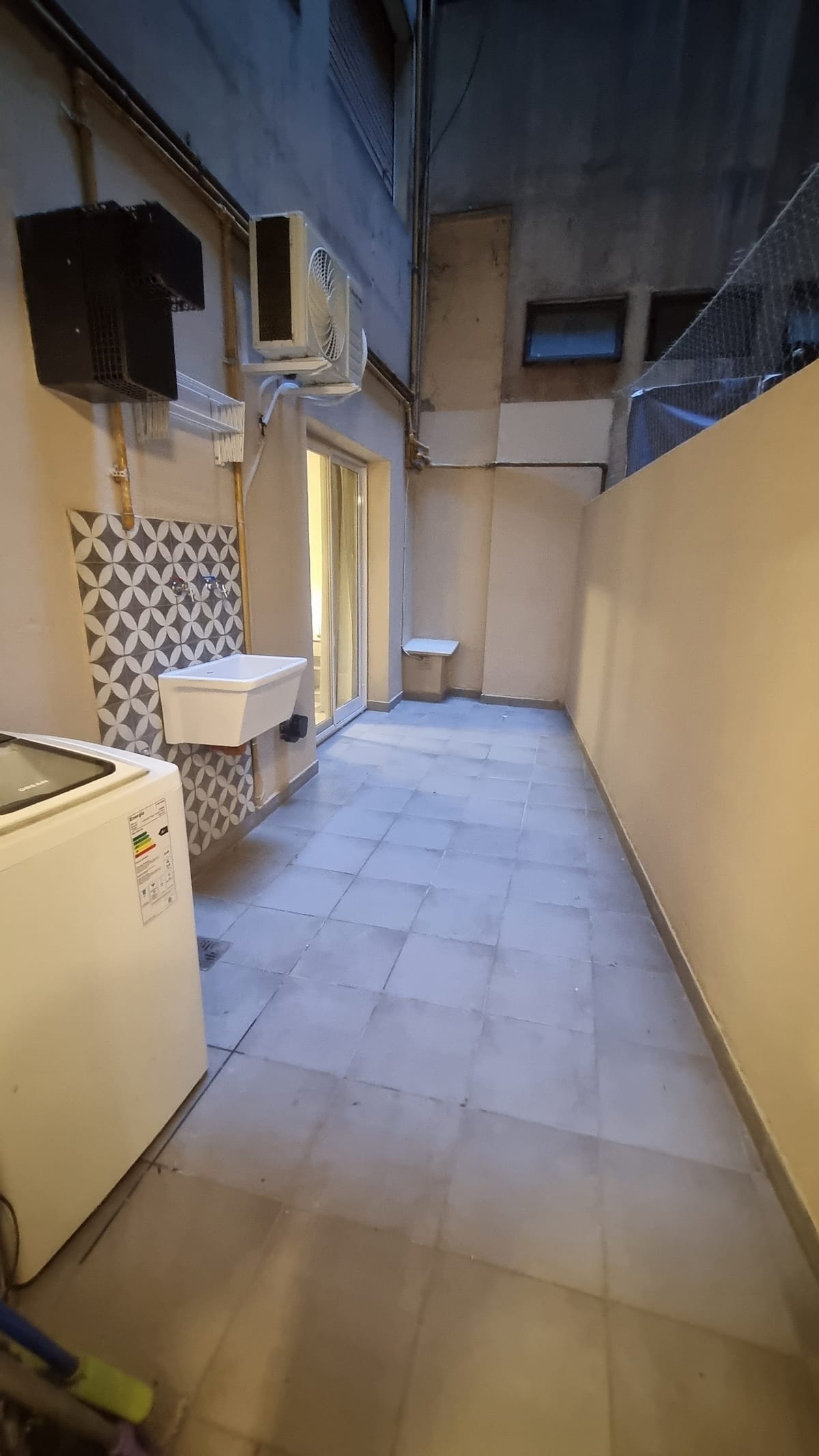 Apartamento em San Telmo com 1 quarto e pátio privativo. O texto não informa metragem, andar, estado de mobiliário ou itens de cozinha e climatização.