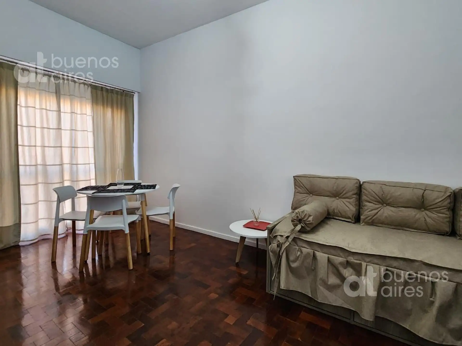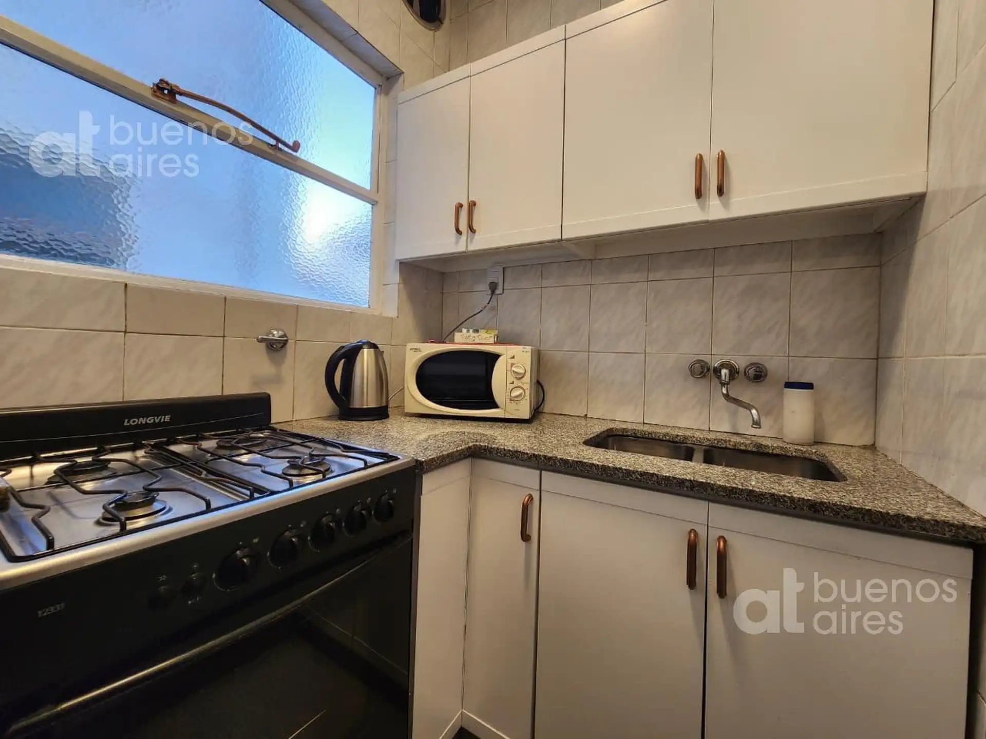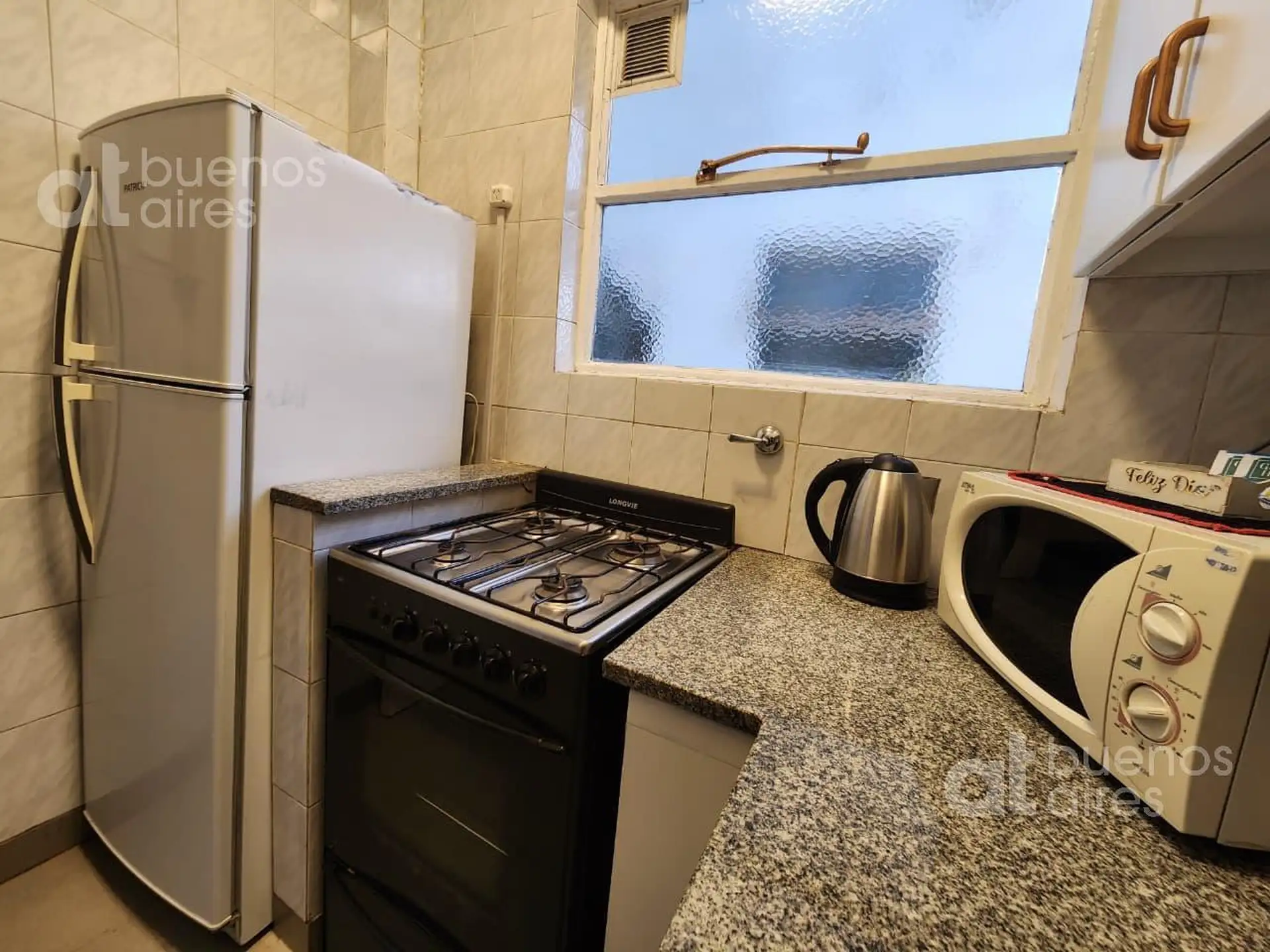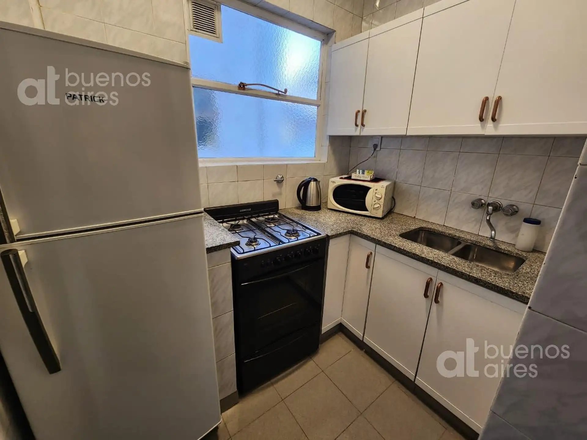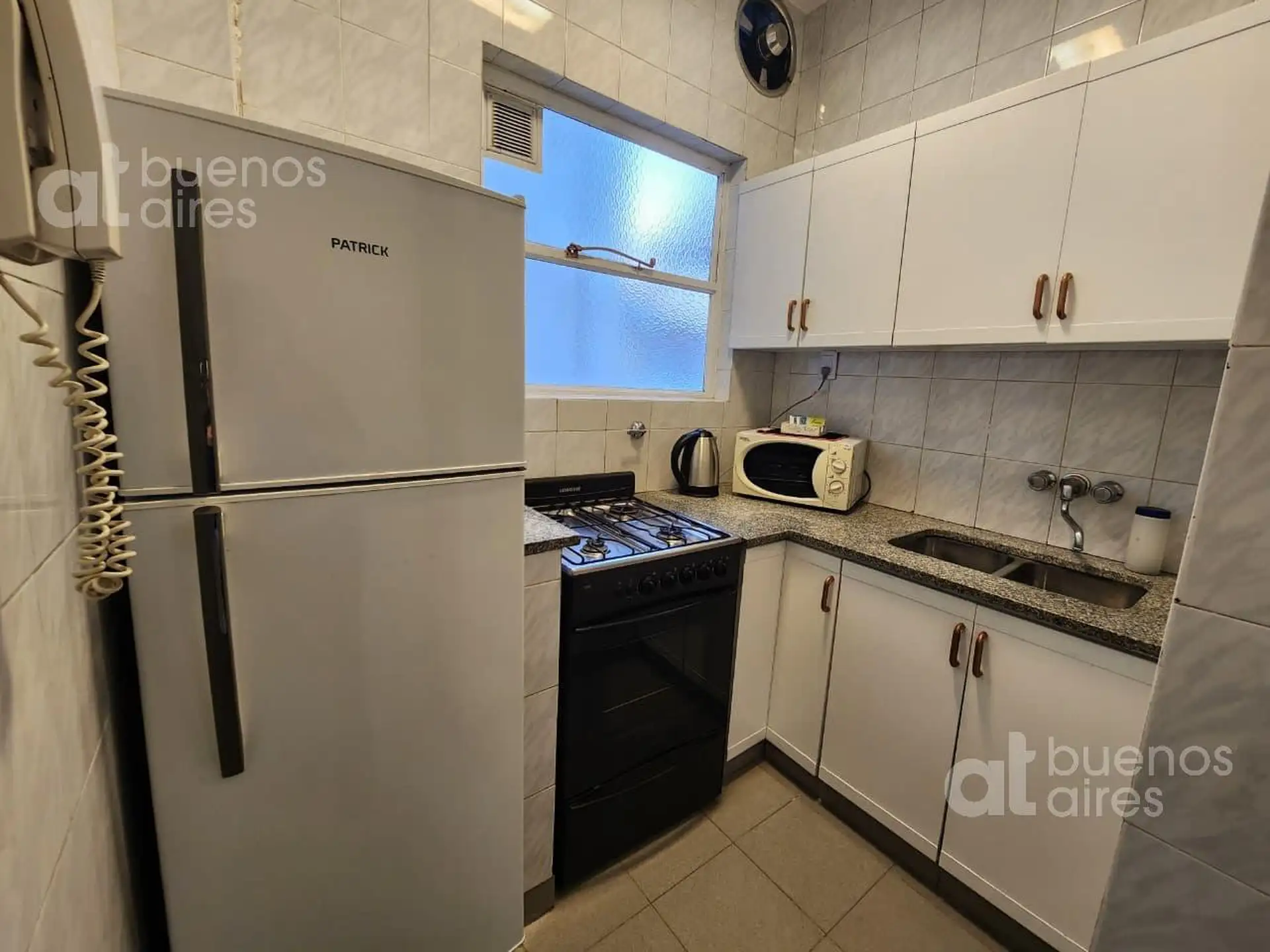Apartamento de dois ambientes, de fundos (contrafrente), mobiliado e totalmente equipado, com 1 quarto e capacidade para 3 pessoas. O imóvel tem sala e sala de jantar com grande janela, ventilador de teto no dormitório e armário embutido. A cozinha é independente, com geladeira com freezer, forno, fogão a gás, micro-ondas e armários; há 1 banheiro completo. Disponível a partir de 10/04/2026. O valor anunciado é “tudo incluído”, com exceção de luz e gás, que ficam a cargo do inquilino.