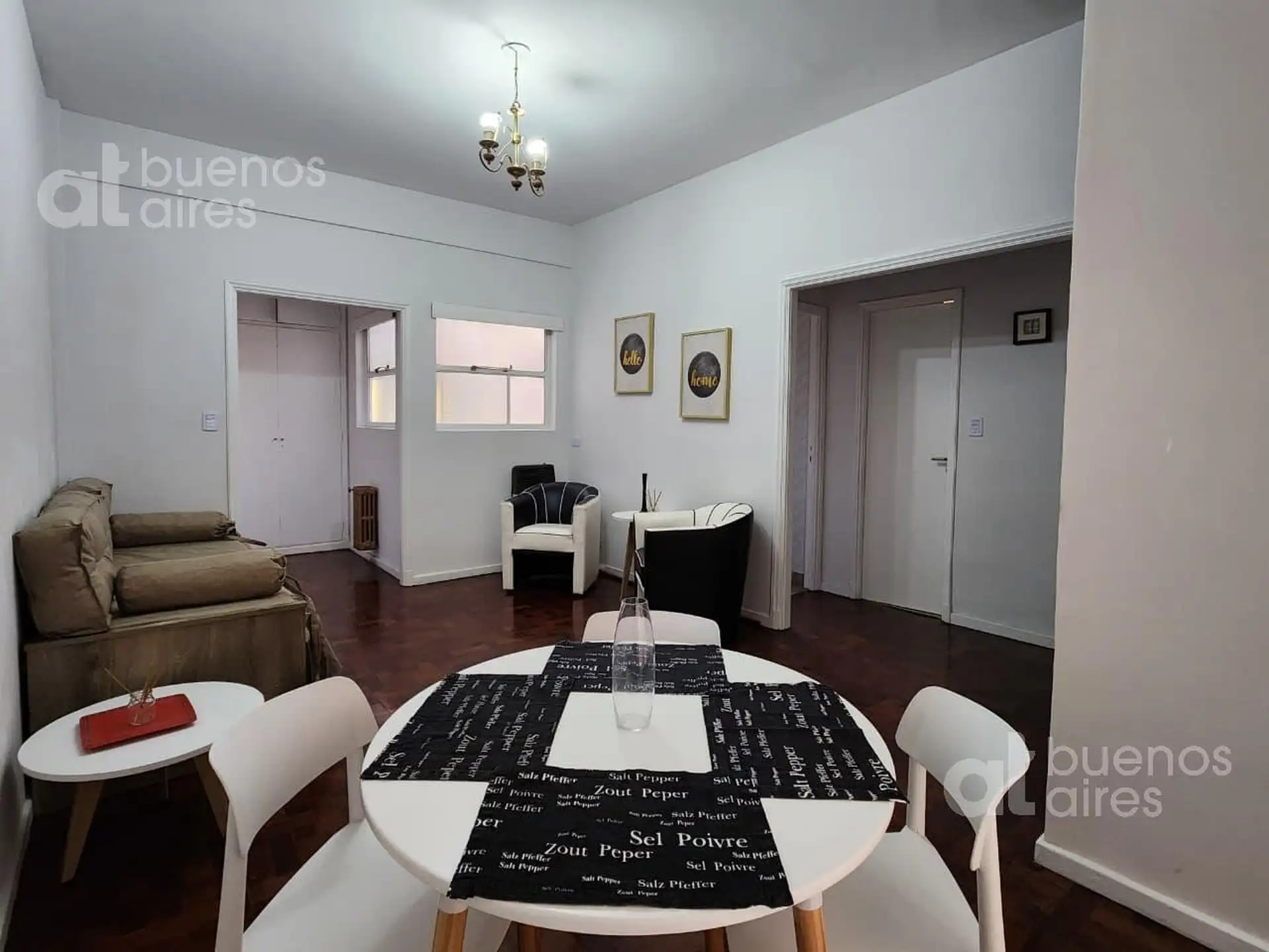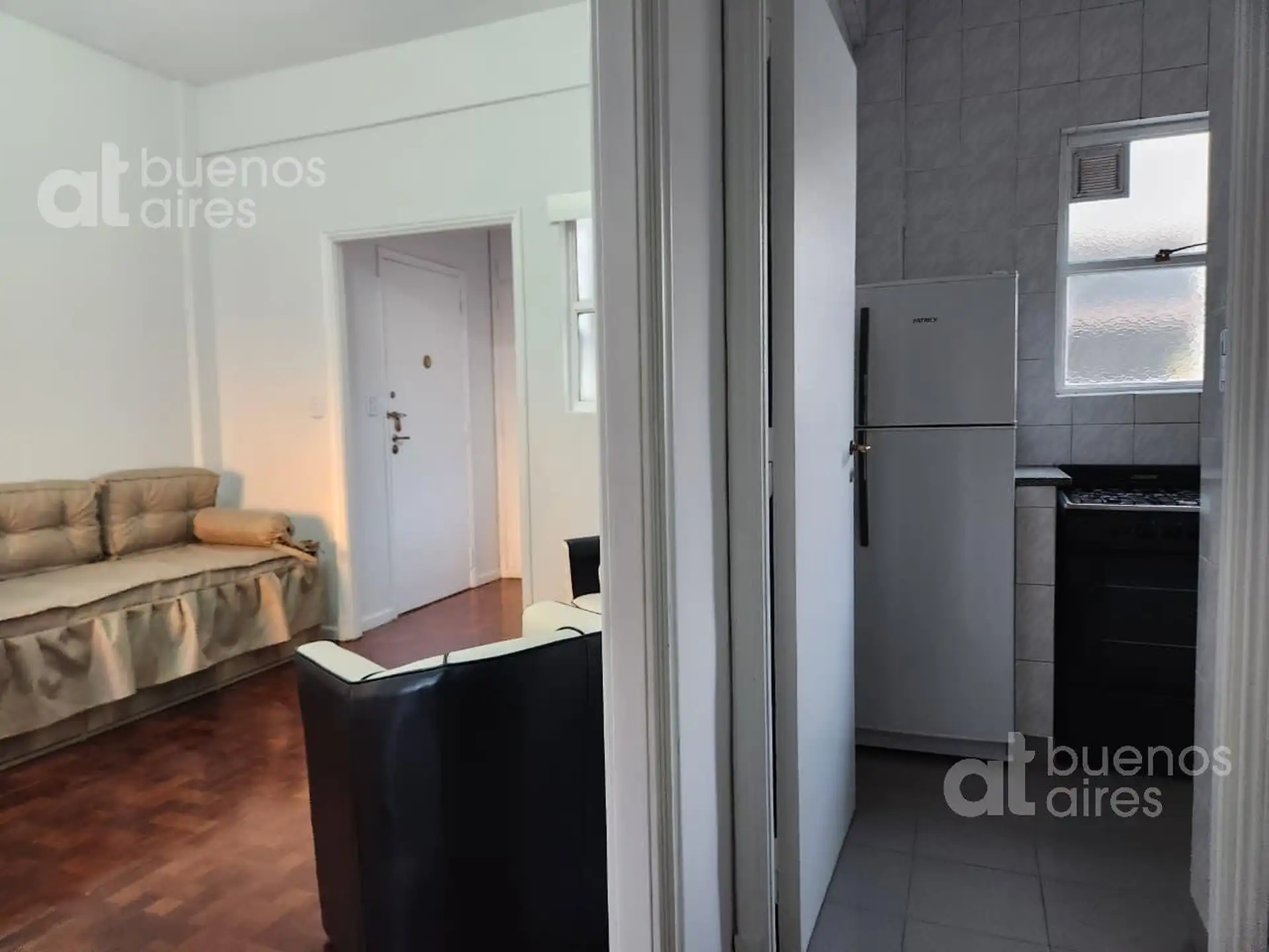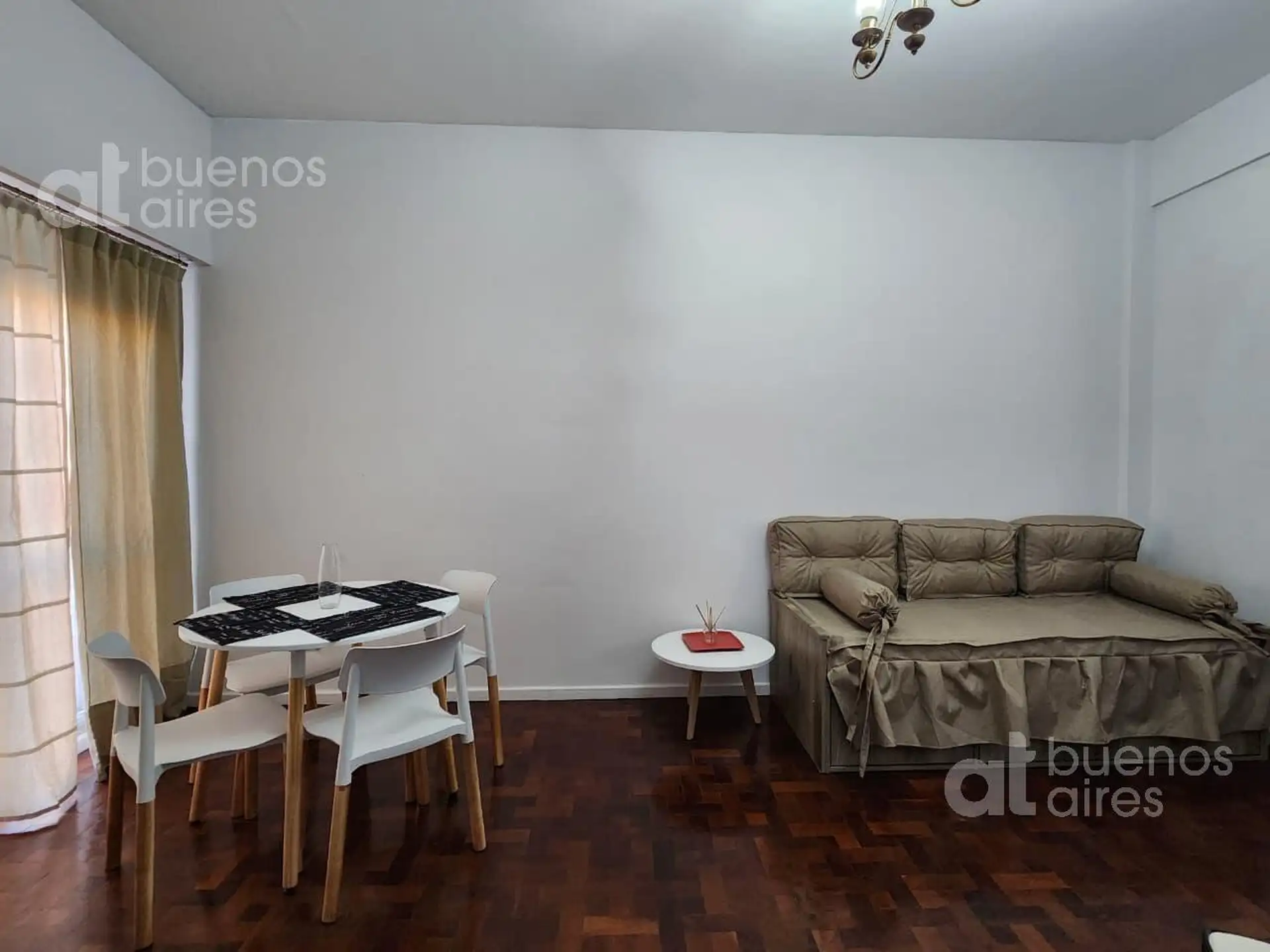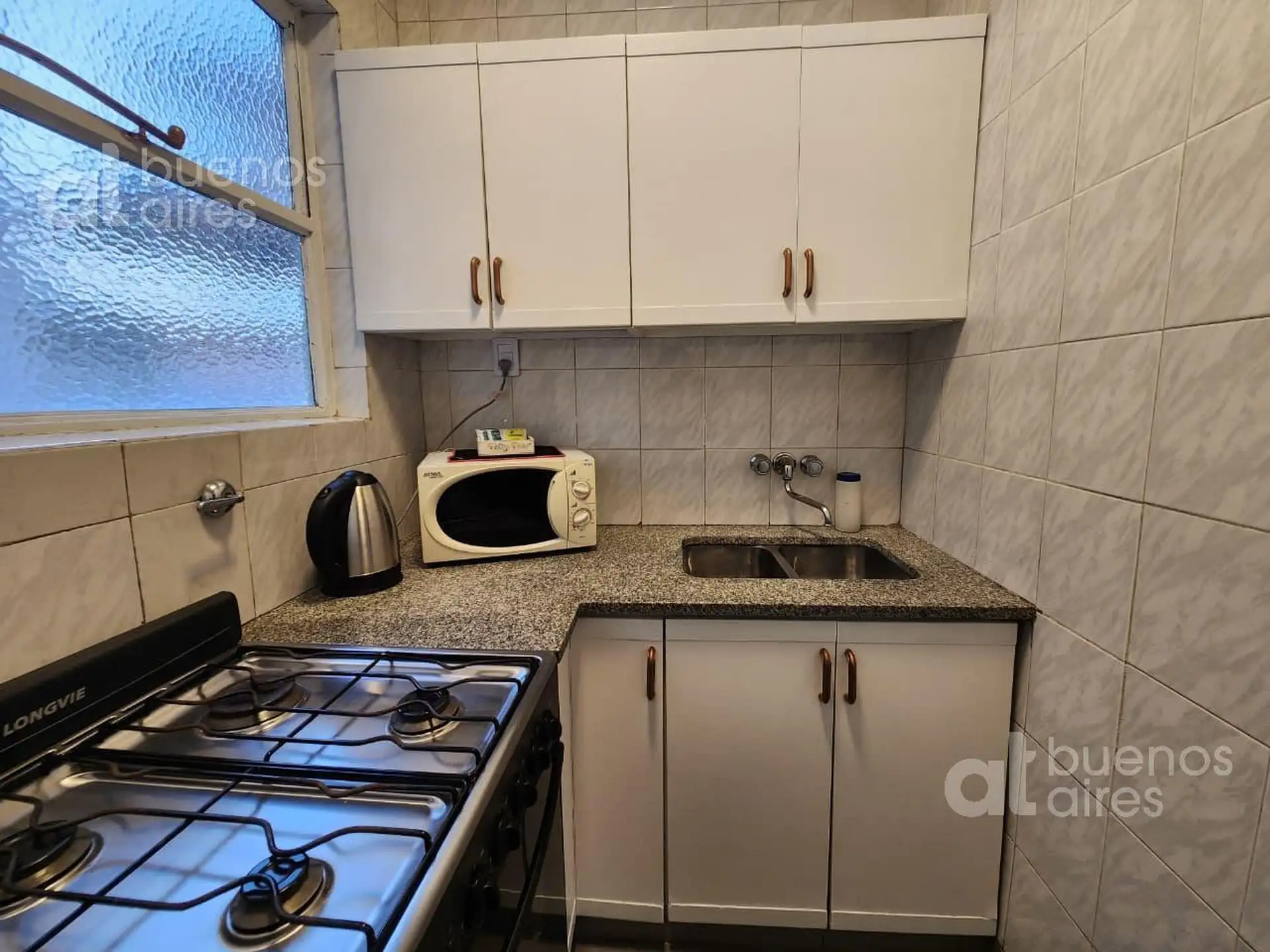 Apartamento de dois ambientes, de fundos (contrafrente), mobiliado e totalmente equipado, com 1 quarto e capacidade para 3 pessoas. O imóvel tem sala e sala de jantar com grande janela, ventilador de teto no dormitório e armário embutido. A cozinha é independente, com geladeira com freezer, forno, fogão a gás, micro-ondas e armários; há 1 banheiro completo. Disponível a partir de 10/04/2026. O valor anunciado é “tudo incluído”, com exceção de luz e gás, que ficam a cargo do inquilino.