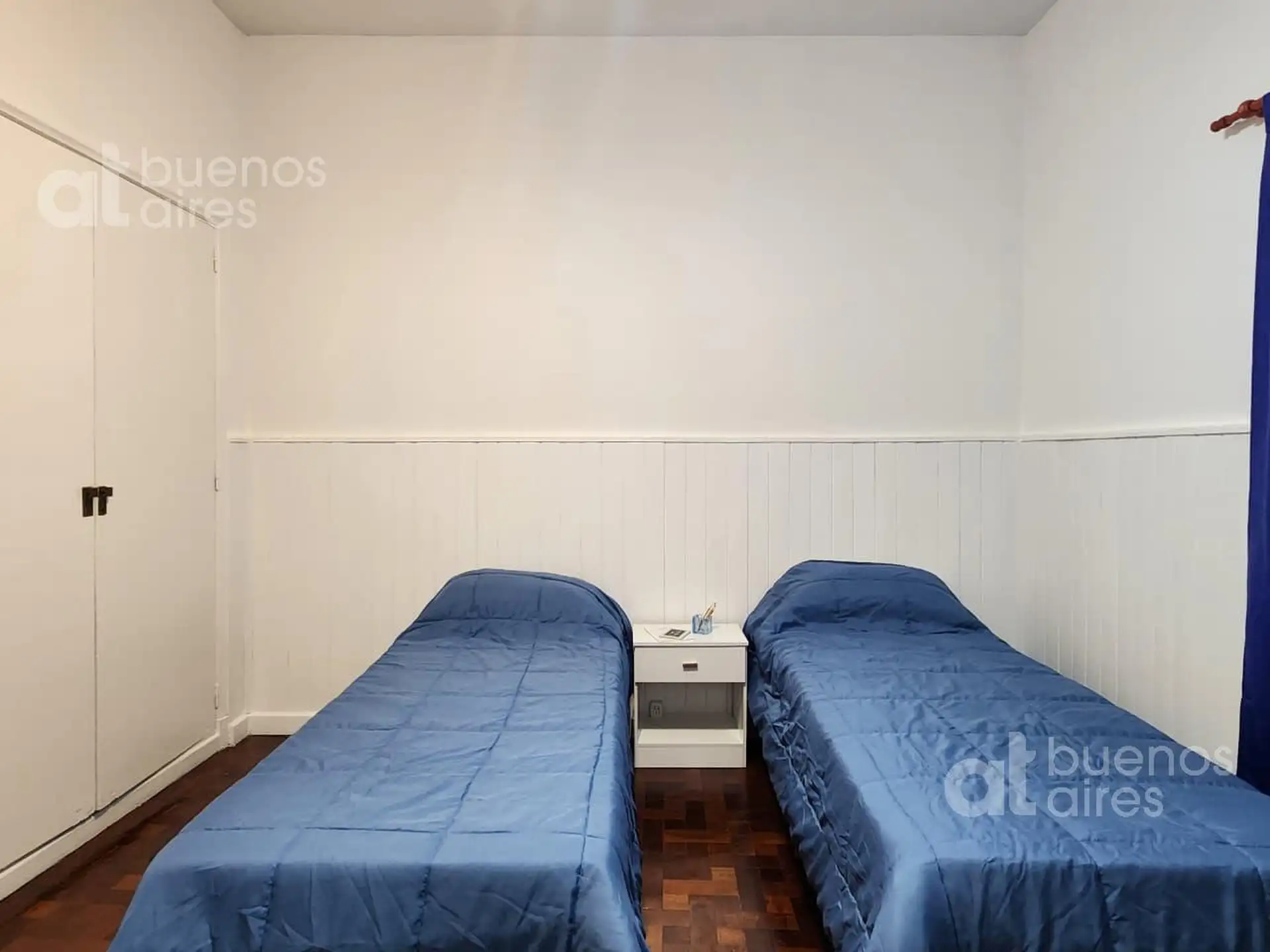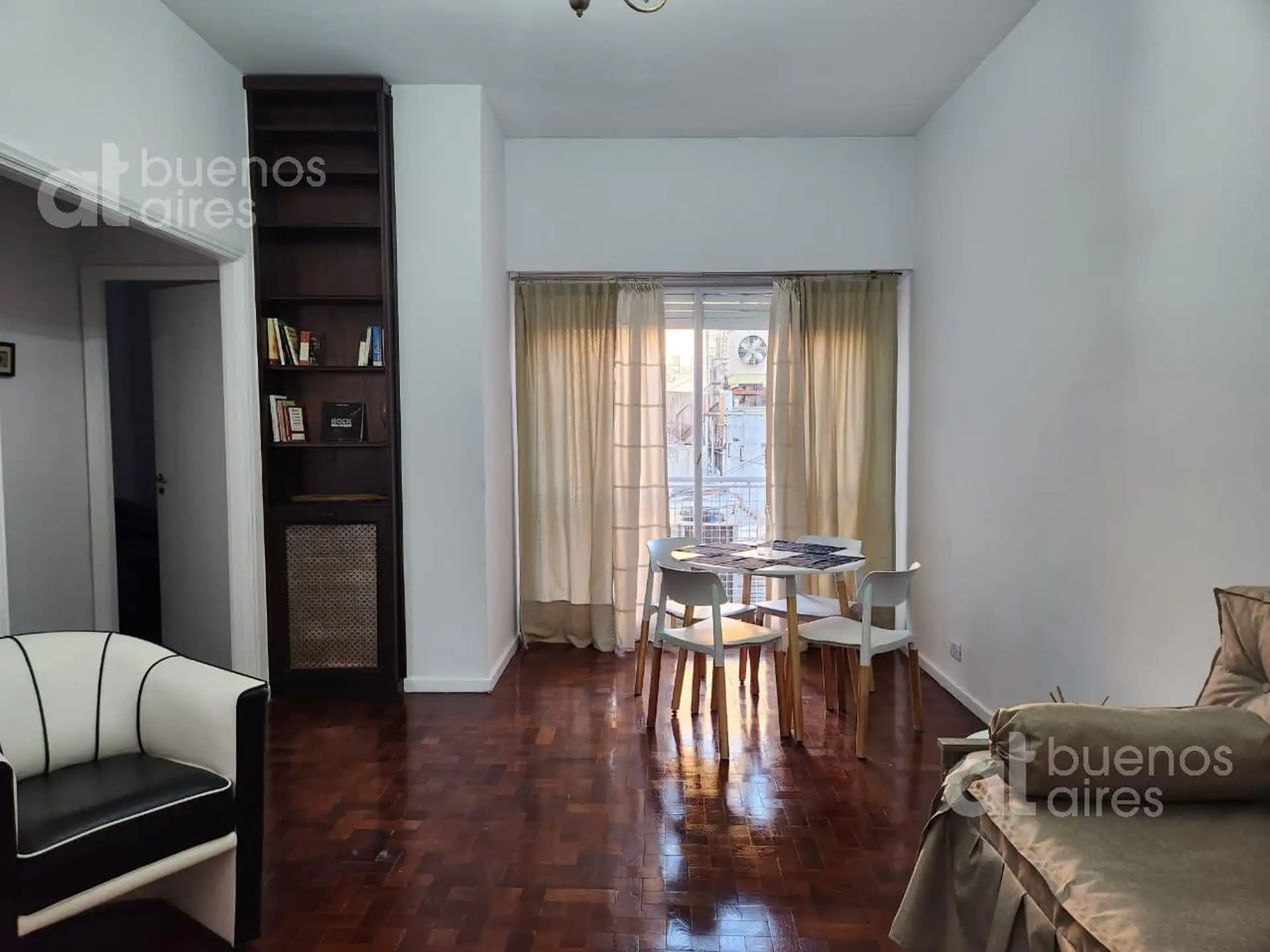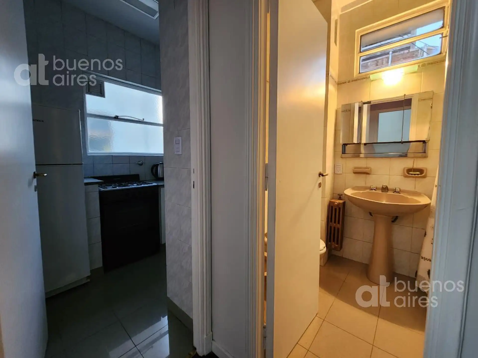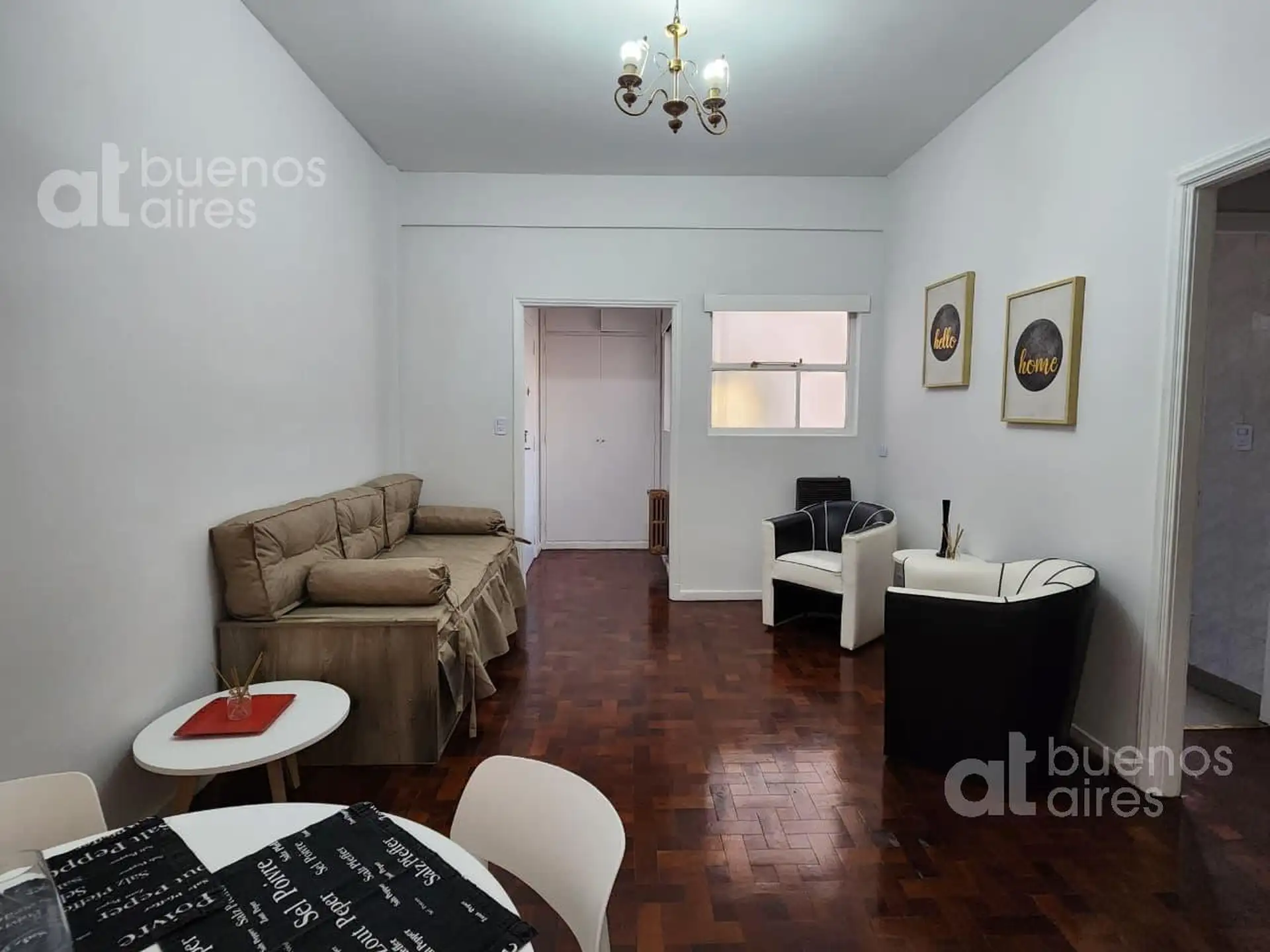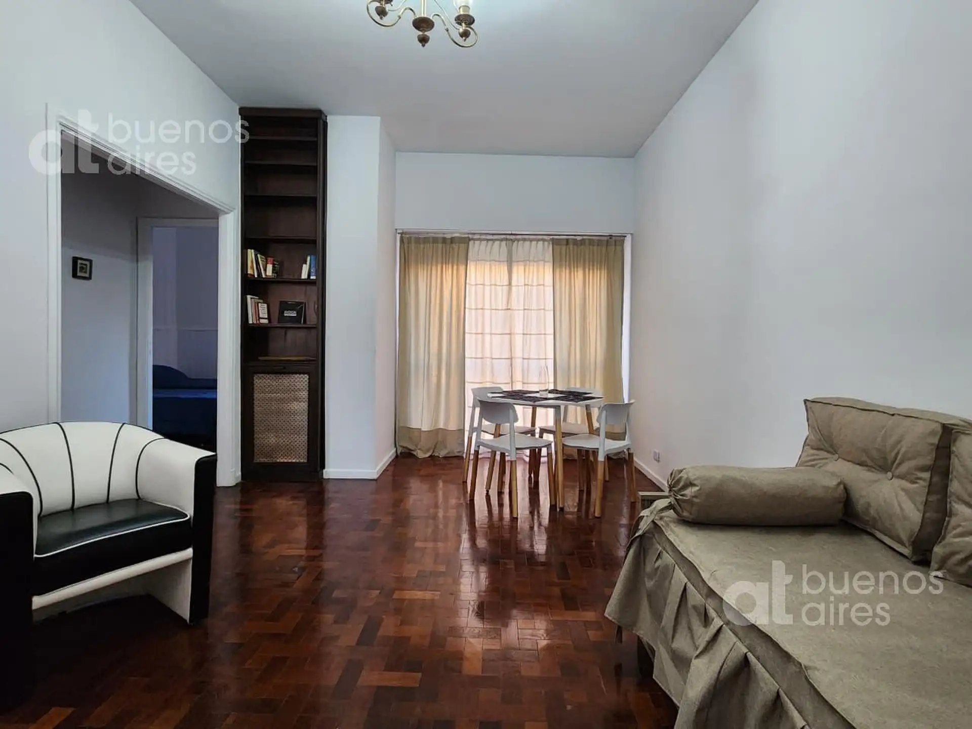 Apartamento de dois ambientes, de fundos (contrafrente), mobiliado e totalmente equipado, com 1 quarto e capacidade para 3 pessoas. O imóvel tem sala e sala de jantar com grande janela, ventilador de teto no dormitório e armário embutido. A cozinha é independente, com geladeira com freezer, forno, fogão a gás, micro-ondas e armários; há 1 banheiro completo. Disponível a partir de 10/04/2026. O valor anunciado é “tudo incluído”, com exceção de luz e gás, que ficam a cargo do inquilino.