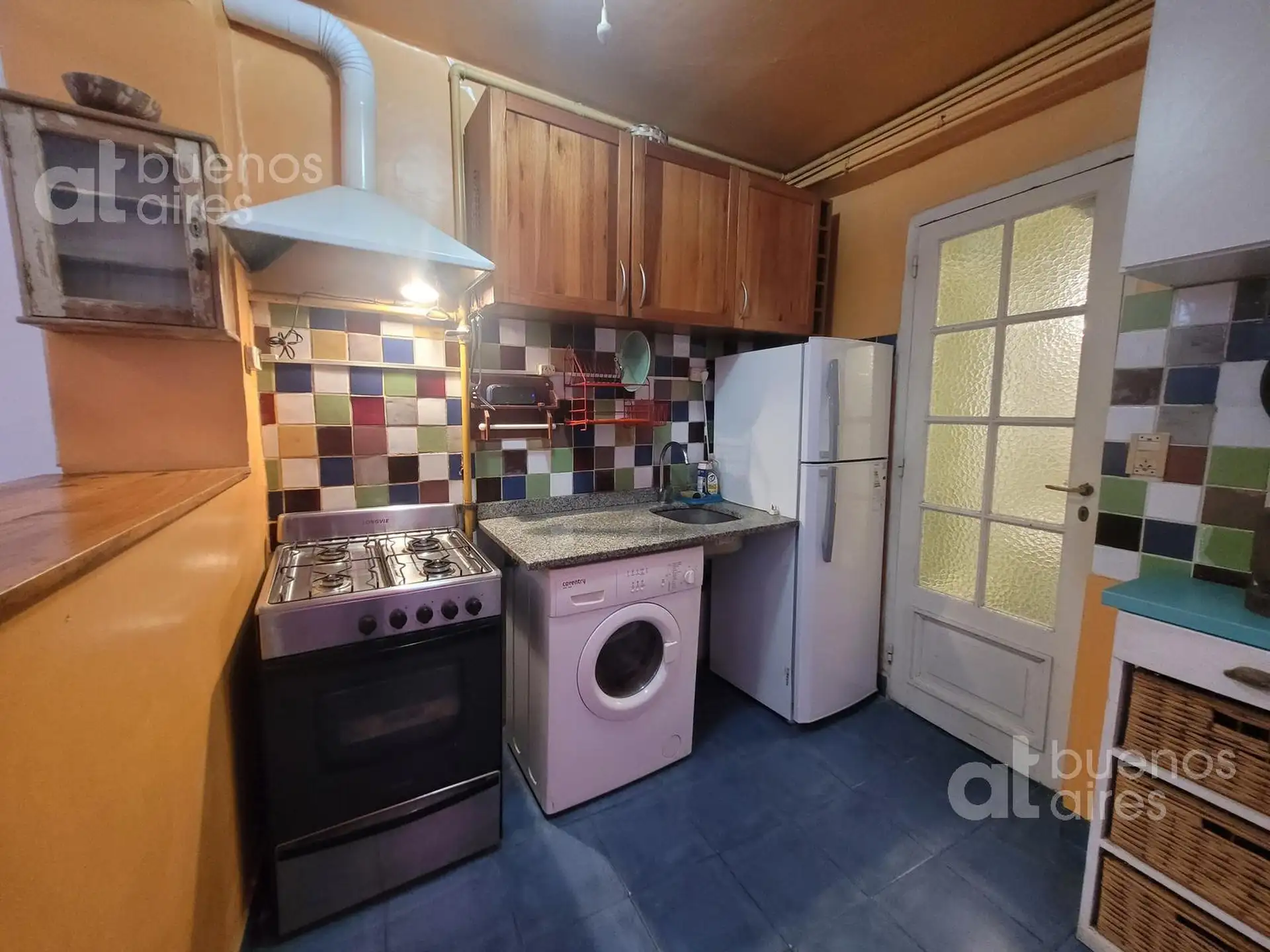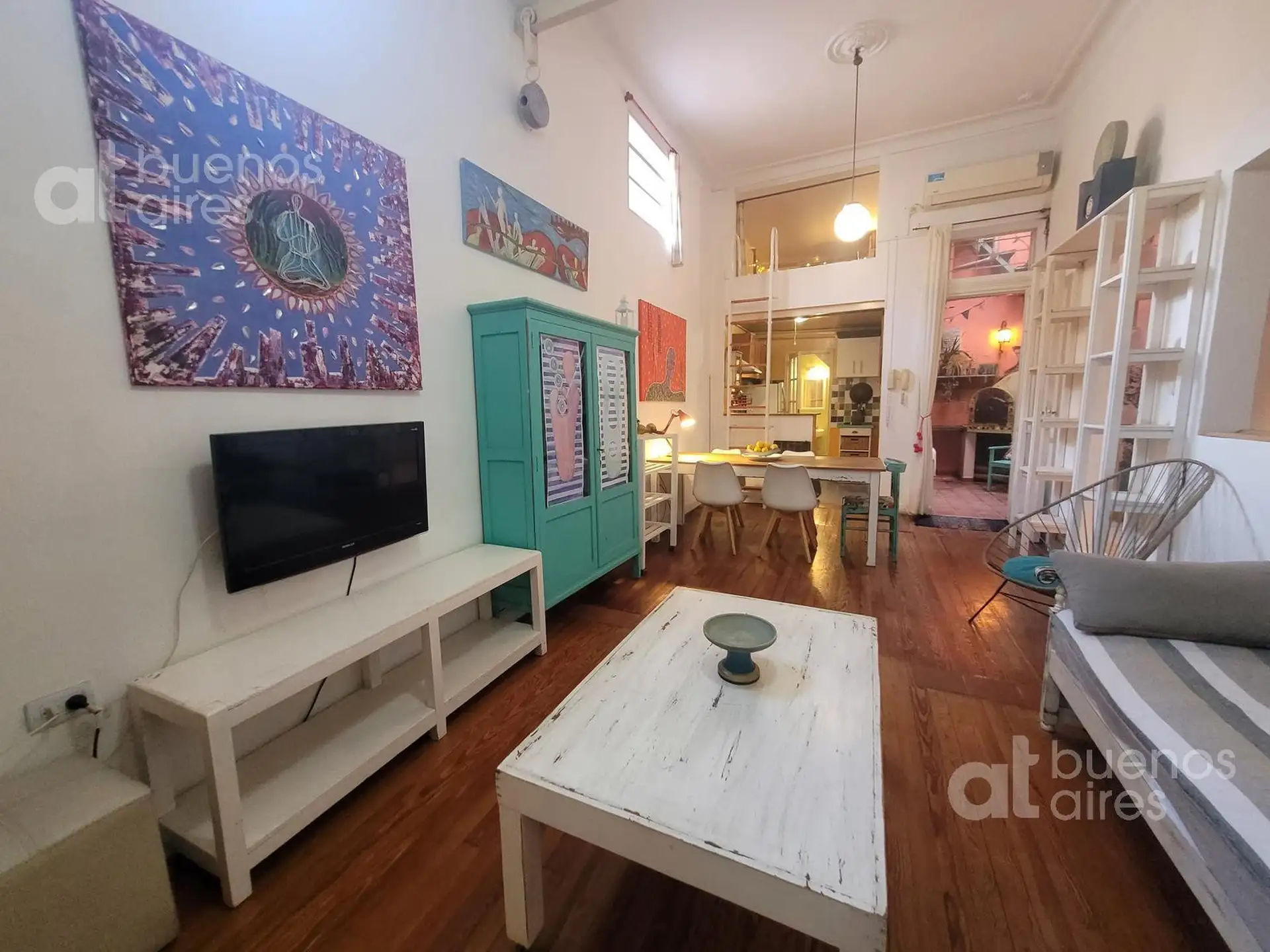 PH em San Telmo, no Casco Histórico, disponível a partir de 10/04/2026. Possui sala de estar e jantar, ar-condicionado e Smart TV de 42", cozinha integrada com lavadora e acesso a um pátio interno com forno a lenha. O dormitório tem cama de casal e armário embutido, além de hall de distribuição e banheiro completo. O valor anunciado é de total incluso, com luz e gás a cargo do inquilino. Para entrar: 1 mês de adiantamento, 1 mês de depósito e taxas administrativas.
