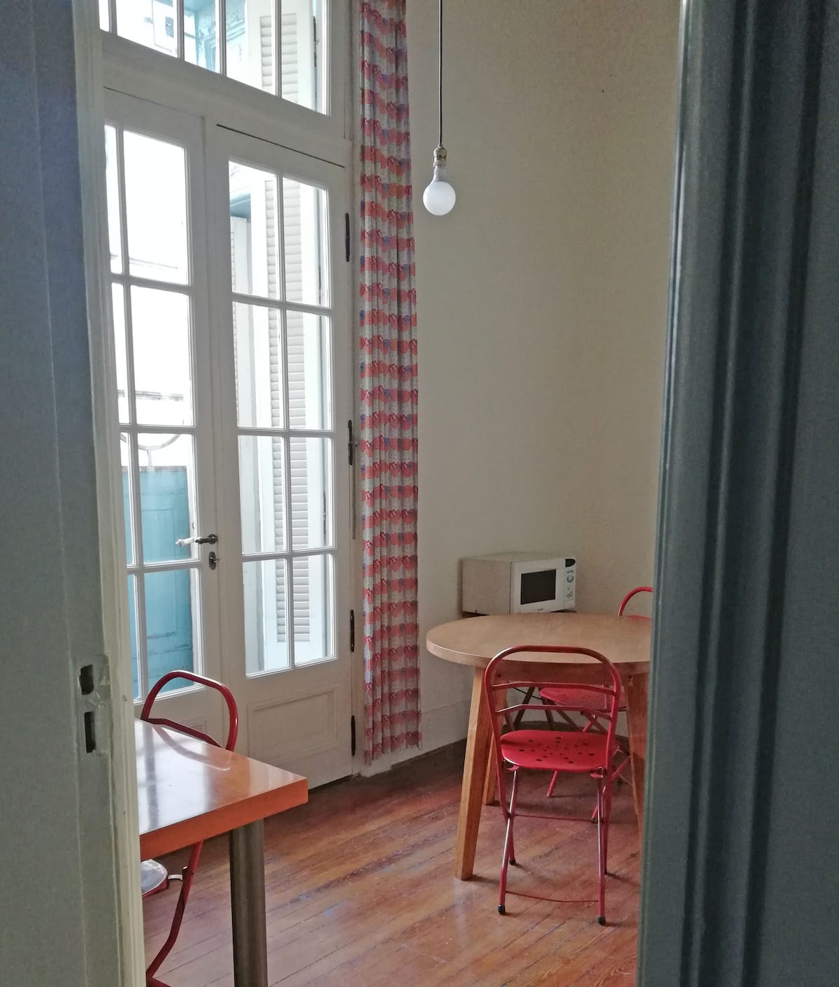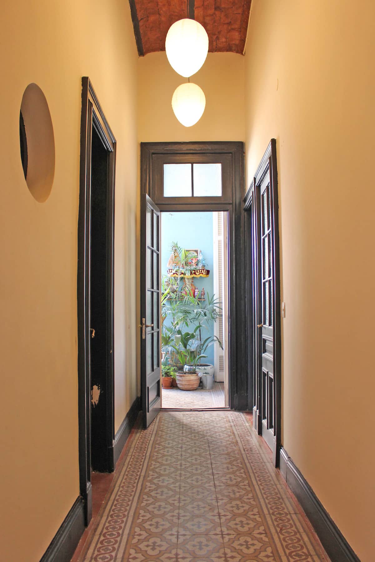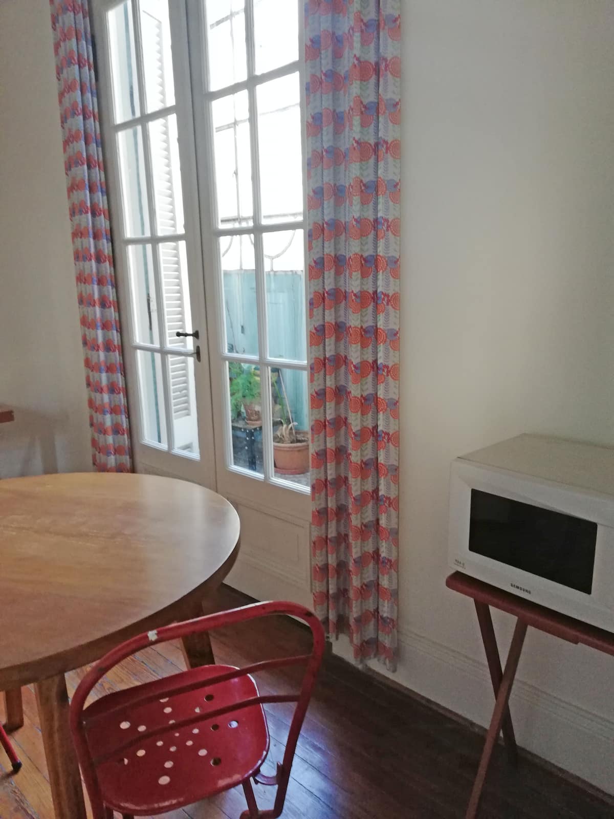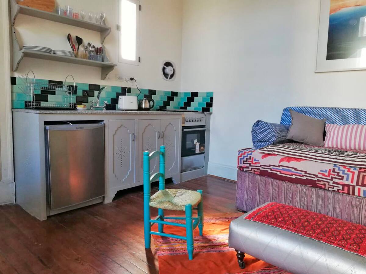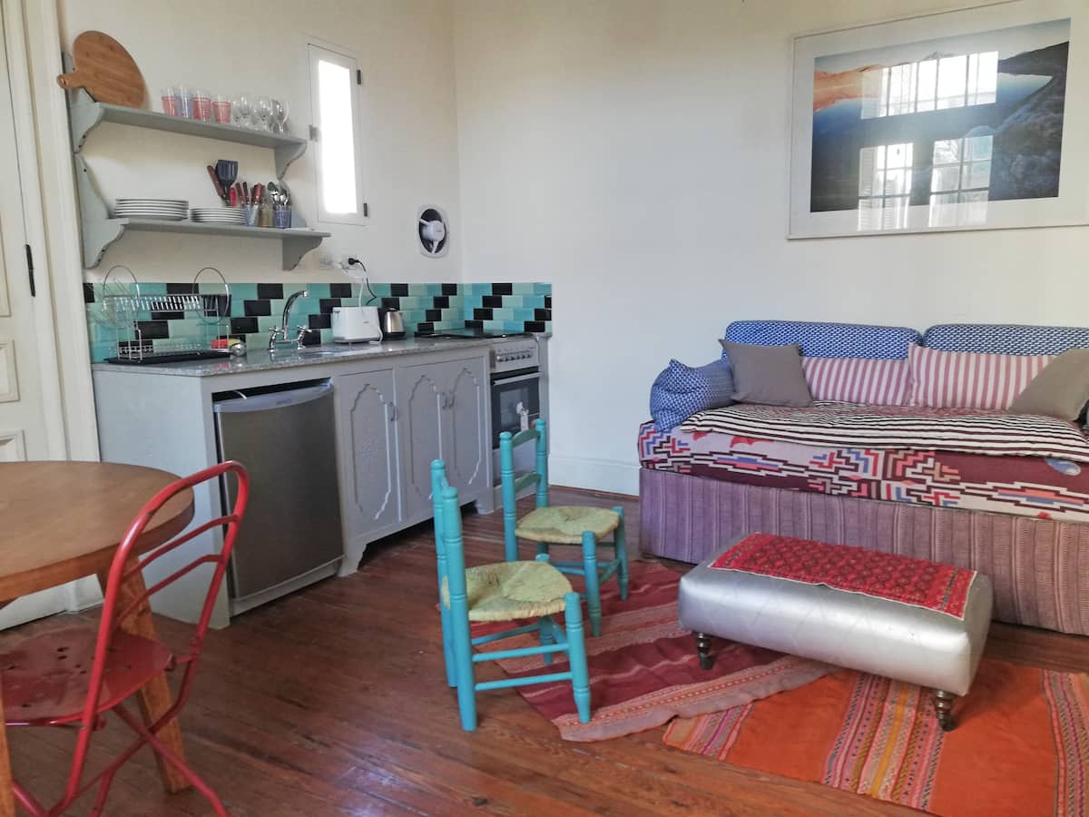 Apartamento em San Telmo, reformado, com 1 quarto, no 2º andar por escada. A planta tem sala de estar e jantar integradas à cozinha, 1 banheiro completo e quarto com cama queen. A unidade tem entrada independente pelo corredor Santa Marina e acesso pelo pátio interno, com portas de vidro para o pátio.