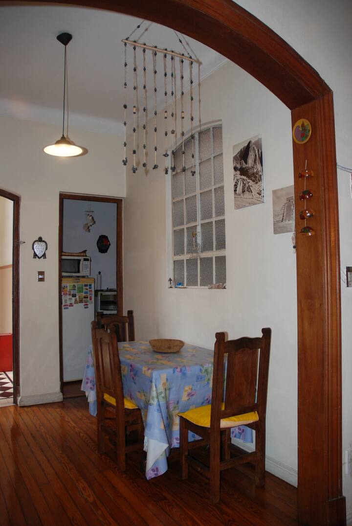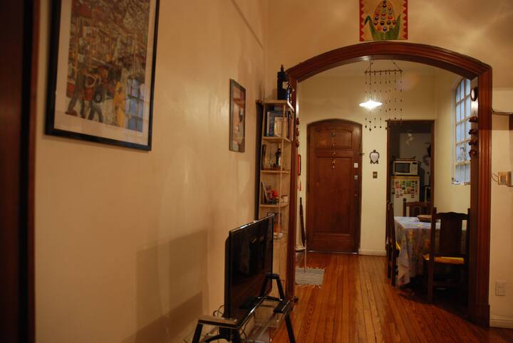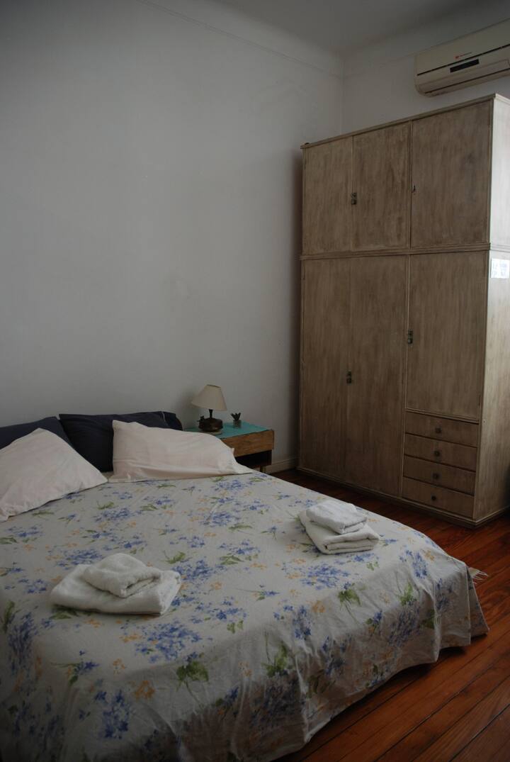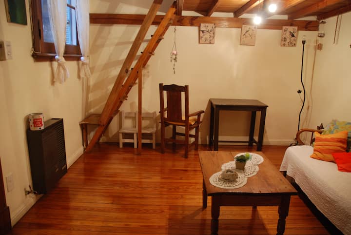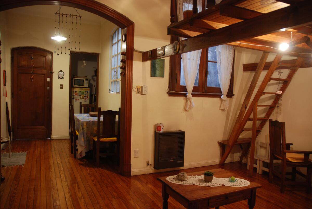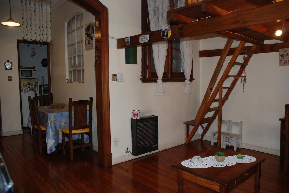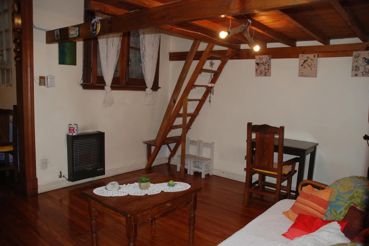 Apartamento mobiliado para aluguel temporário em San Telmo, no primeiro andar (acesso por escadas), dois quadros do Parque Lezama. Possui sala ampla, 1 quarto com cama de casal e mezanino com colchão simples; cozinha totalmente equipada e banheiro com box e bidê. Tem ar-condicionado, aquecimento com sistema de tiragem balanceada, ventilador de teto, TV a cabo, internet Wi‑Fi, telefone e micro-ondas. Inclui serviço de limpeza semanal e utensílios de cozinha (geladeira, forno, cafeteira, torradeir