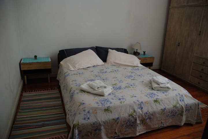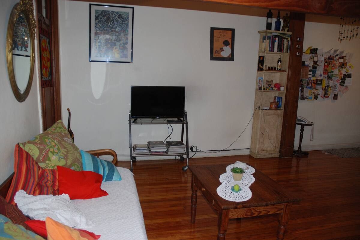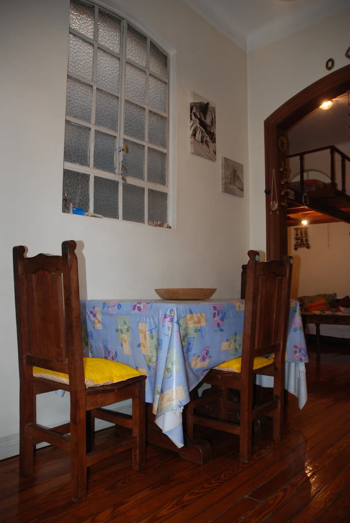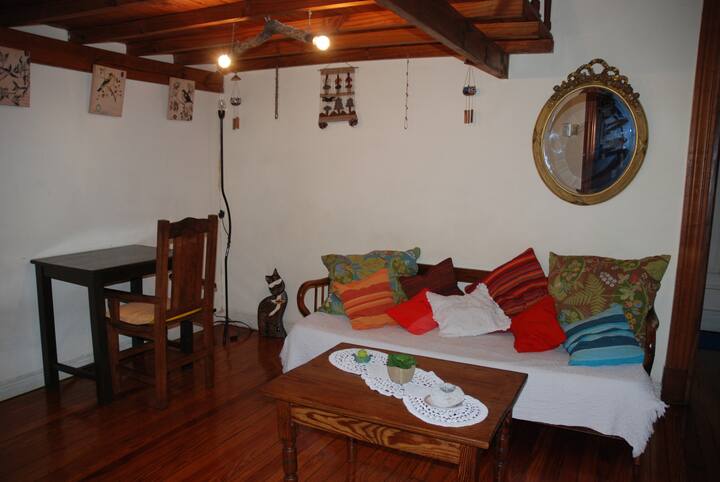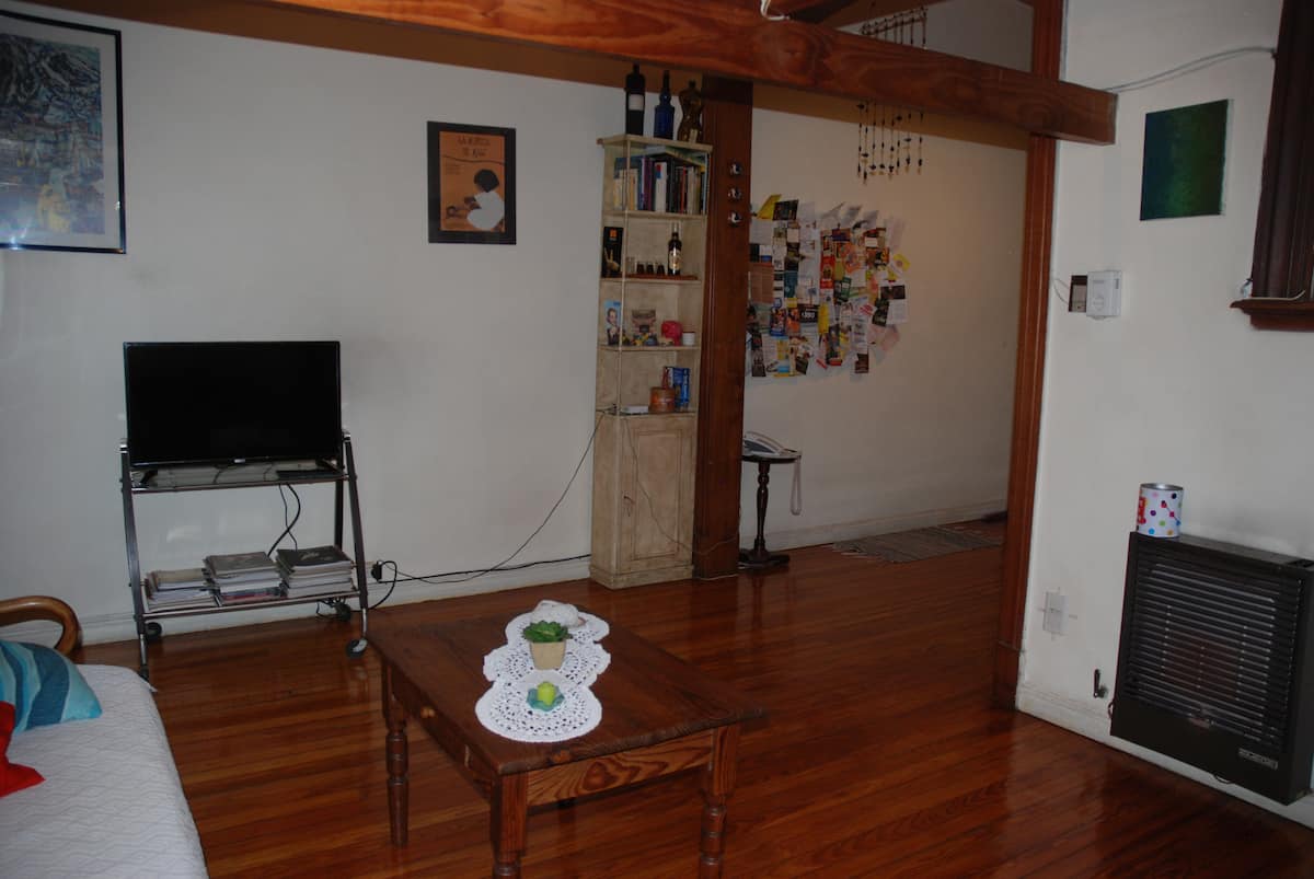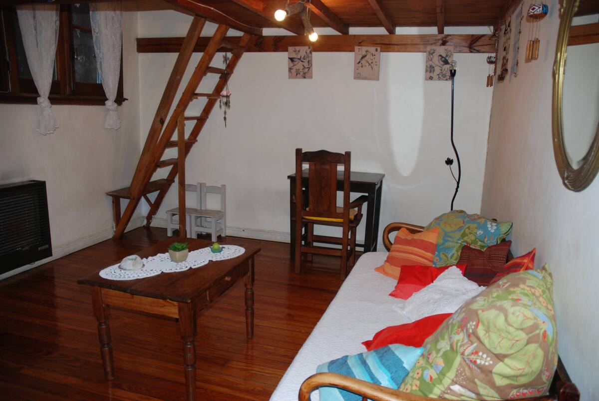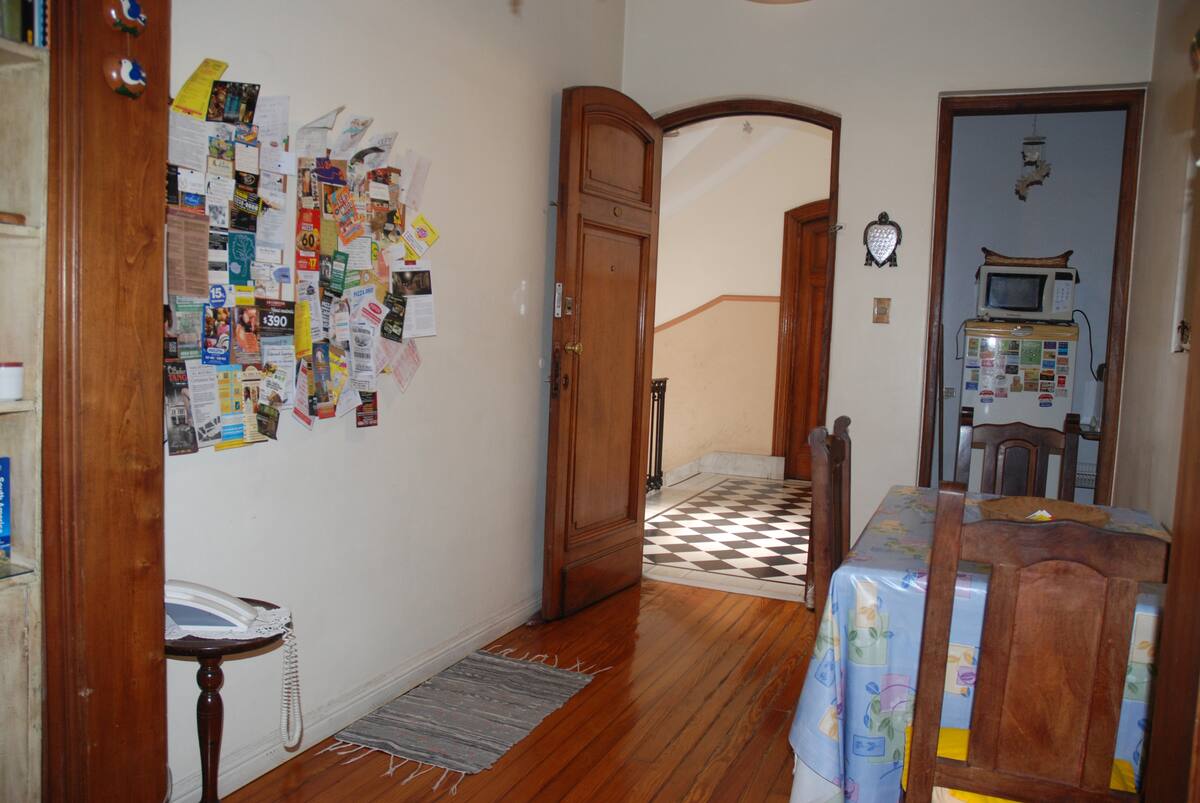 Apartamento mobiliado para aluguel temporário em San Telmo, no primeiro andar (acesso por escadas), dois quadros do Parque Lezama. Possui sala ampla, 1 quarto com cama de casal e mezanino com colchão simples; cozinha totalmente equipada e banheiro com box e bidê. Tem ar-condicionado, aquecimento com sistema de tiragem balanceada, ventilador de teto, TV a cabo, internet Wi‑Fi, telefone e micro-ondas. Inclui serviço de limpeza semanal e utensílios de cozinha (geladeira, forno, cafeteira, torradeir