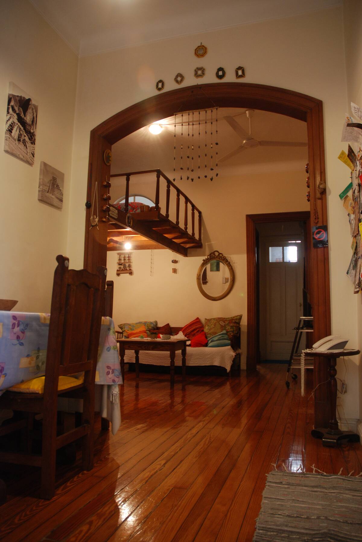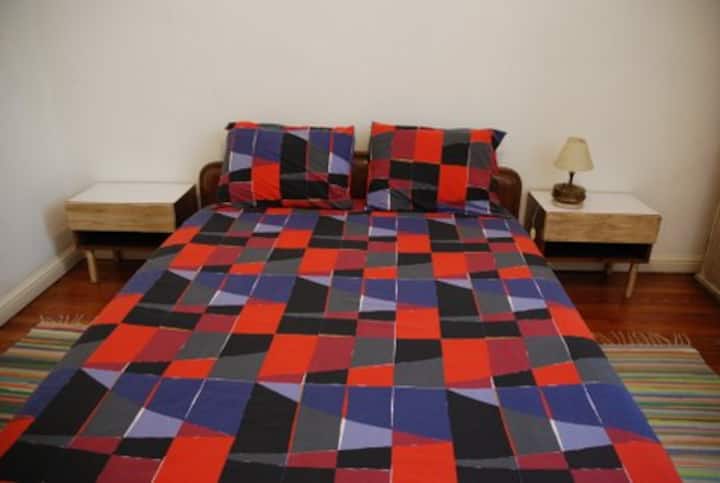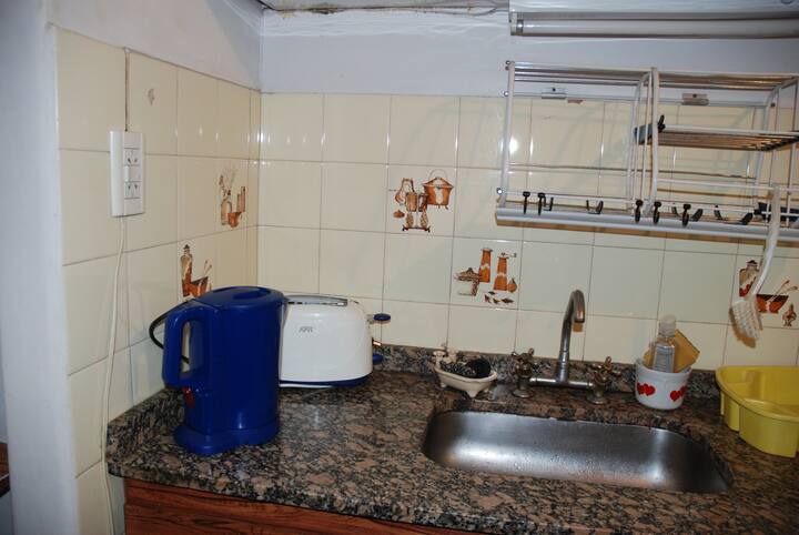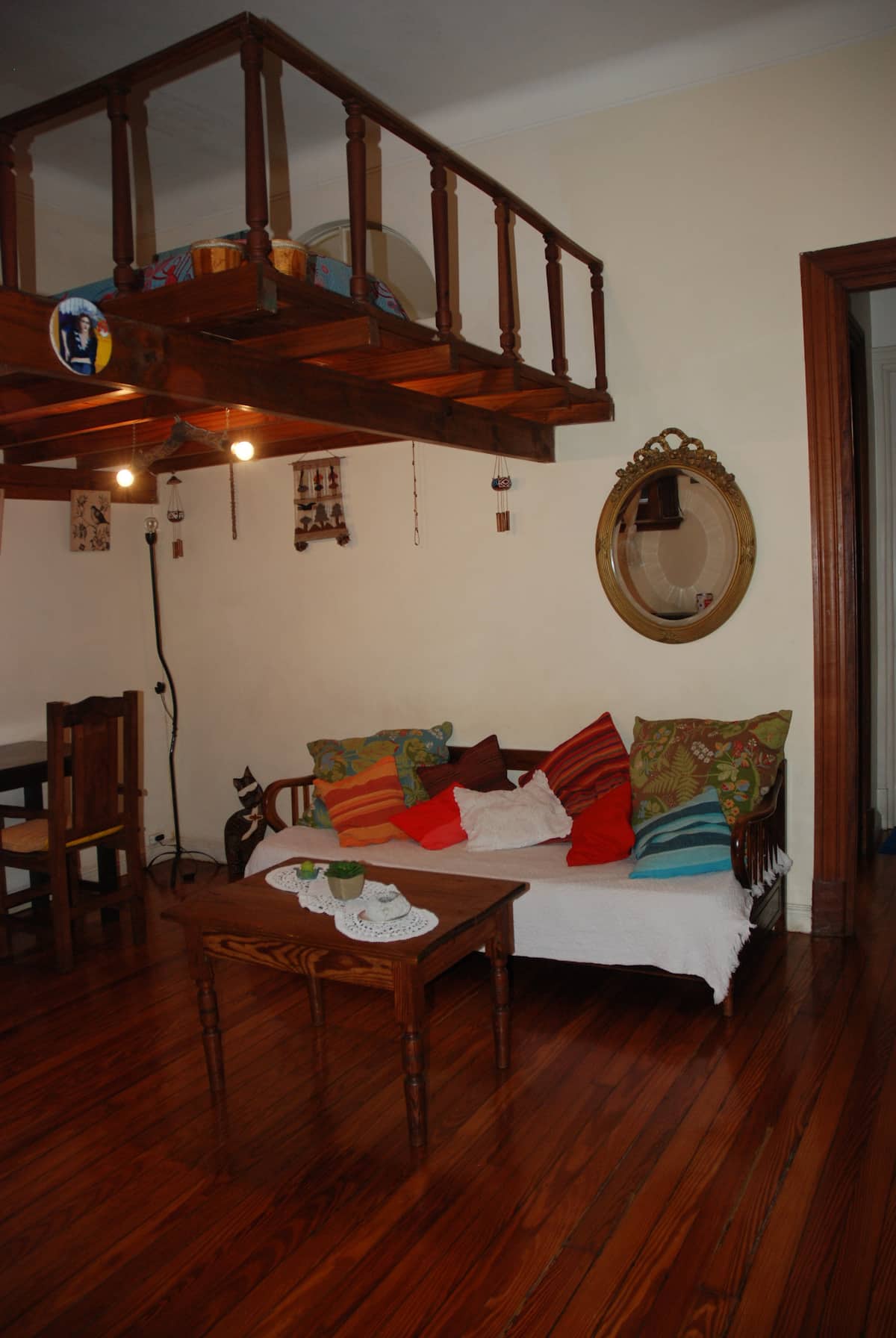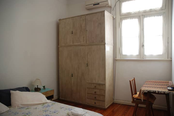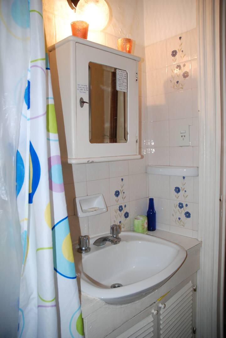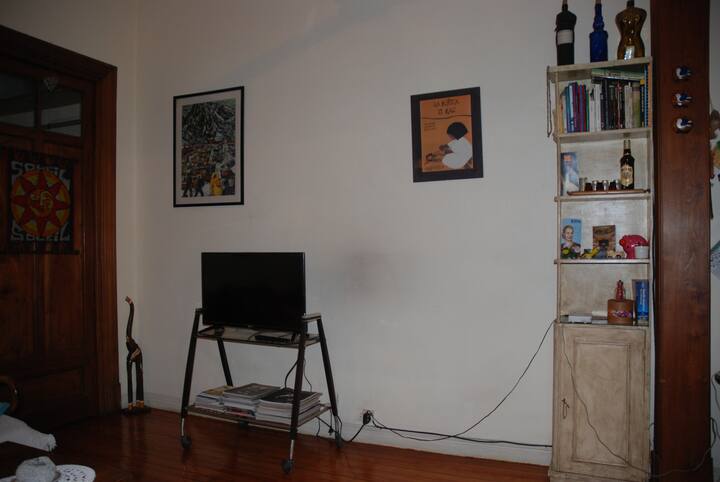 Apartamento mobiliado para aluguel temporário em San Telmo, no primeiro andar (acesso por escadas), dois quadros do Parque Lezama. Possui sala ampla, 1 quarto com cama de casal e mezanino com colchão simples; cozinha totalmente equipada e banheiro com box e bidê. Tem ar-condicionado, aquecimento com sistema de tiragem balanceada, ventilador de teto, TV a cabo, internet Wi‑Fi, telefone e micro-ondas. Inclui serviço de limpeza semanal e utensílios de cozinha (geladeira, forno, cafeteira, torradeir