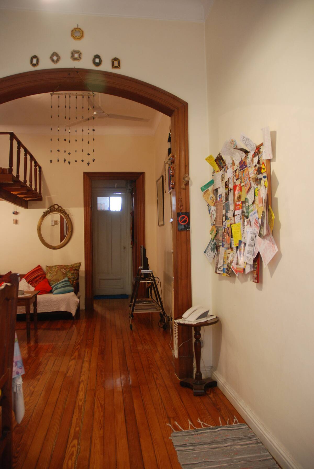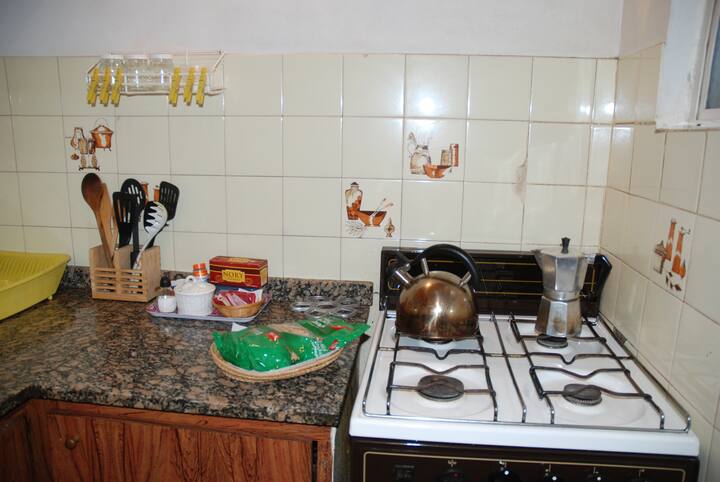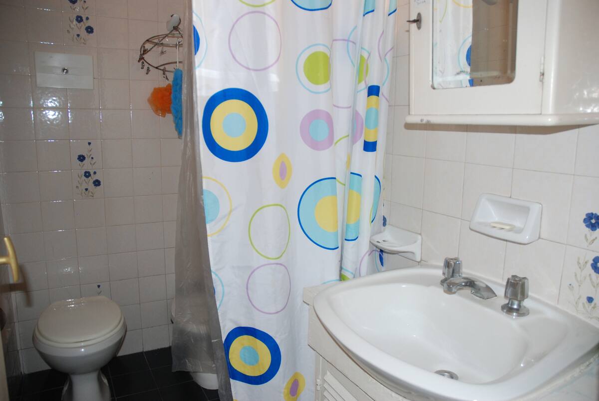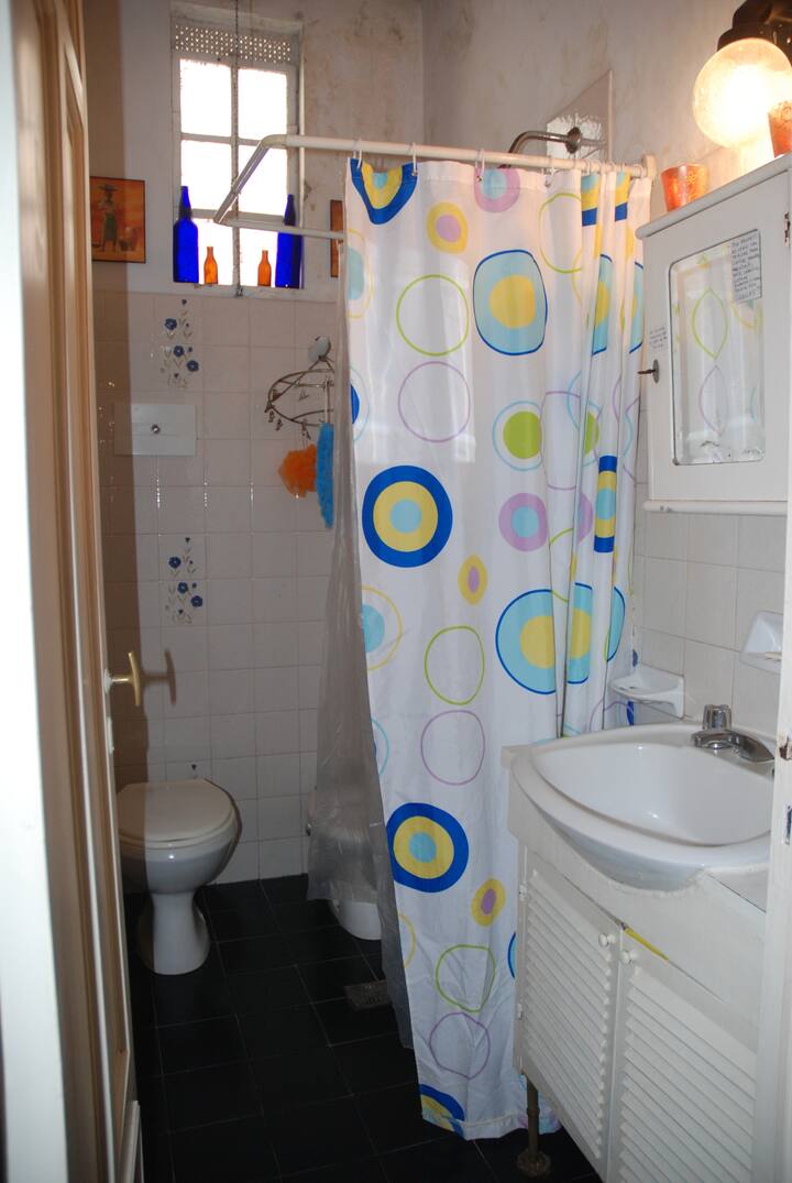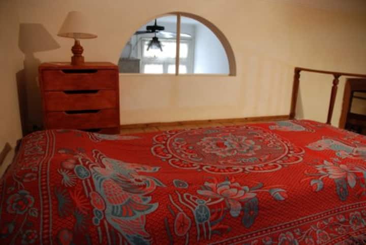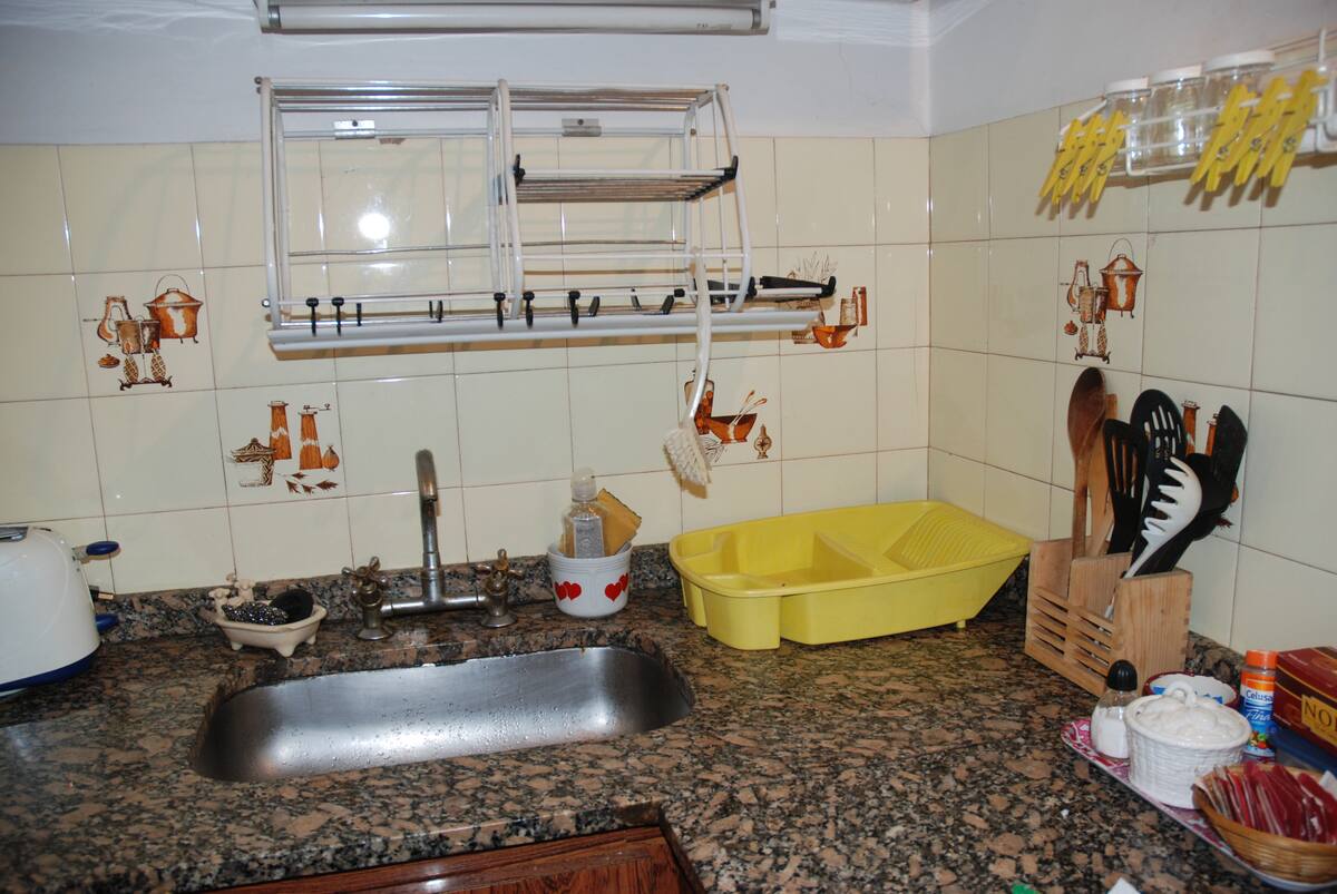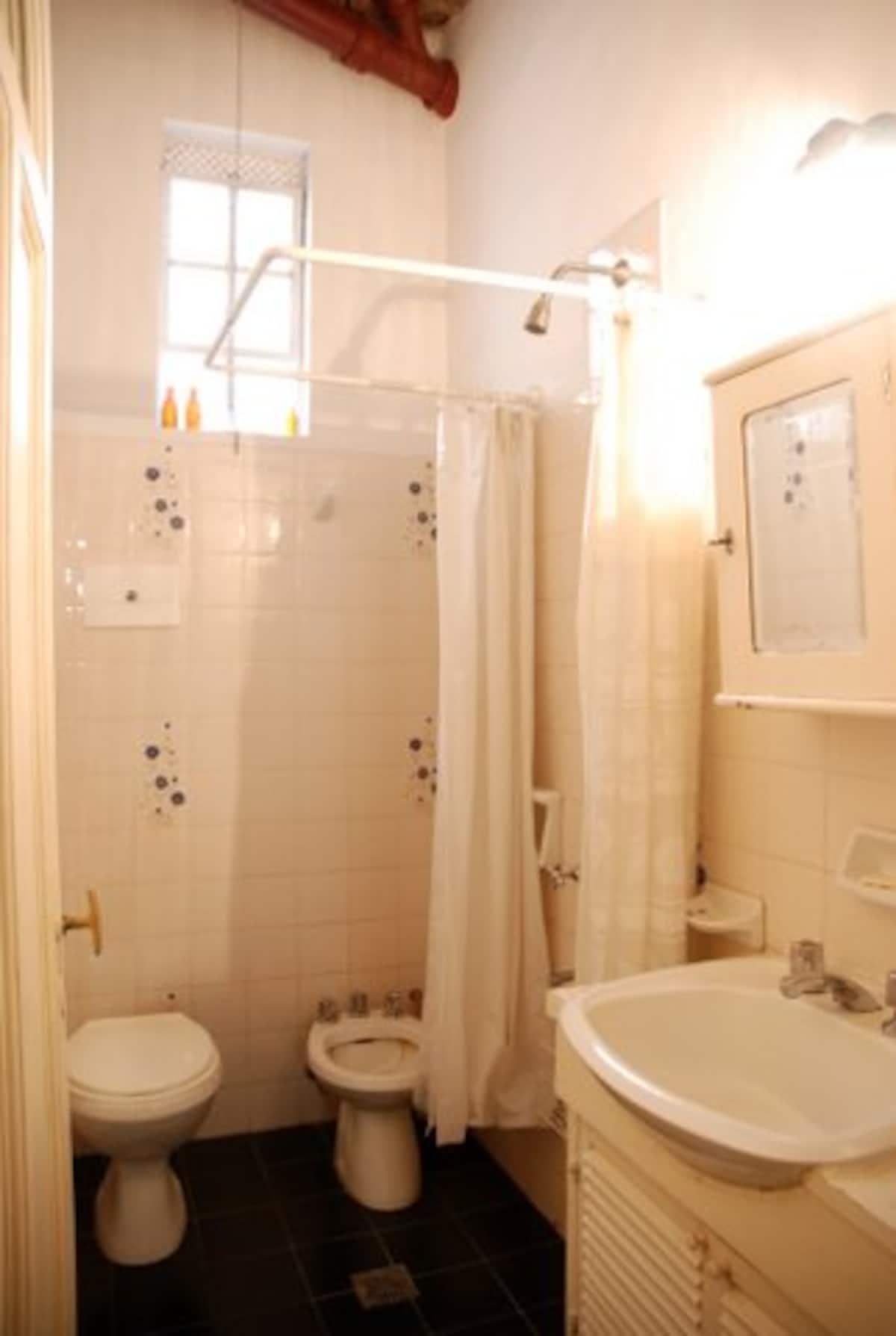 Apartamento mobiliado para aluguel temporário em San Telmo, no primeiro andar (acesso por escadas), dois quadros do Parque Lezama. Possui sala ampla, 1 quarto com cama de casal e mezanino com colchão simples; cozinha totalmente equipada e banheiro com box e bidê. Tem ar-condicionado, aquecimento com sistema de tiragem balanceada, ventilador de teto, TV a cabo, internet Wi‑Fi, telefone e micro-ondas. Inclui serviço de limpeza semanal e utensílios de cozinha (geladeira, forno, cafeteira, torradeir