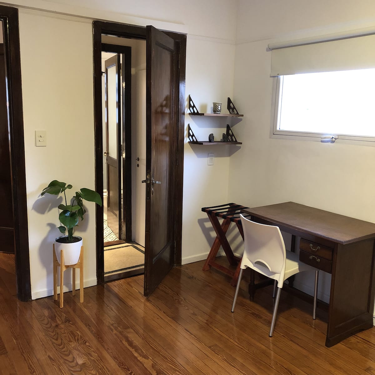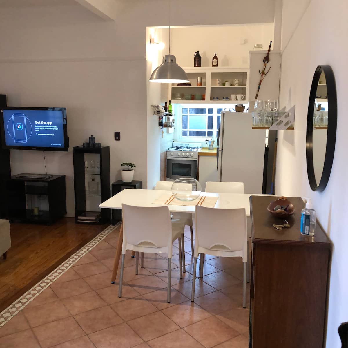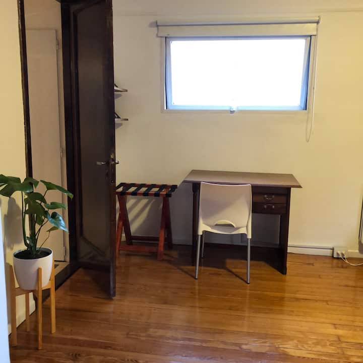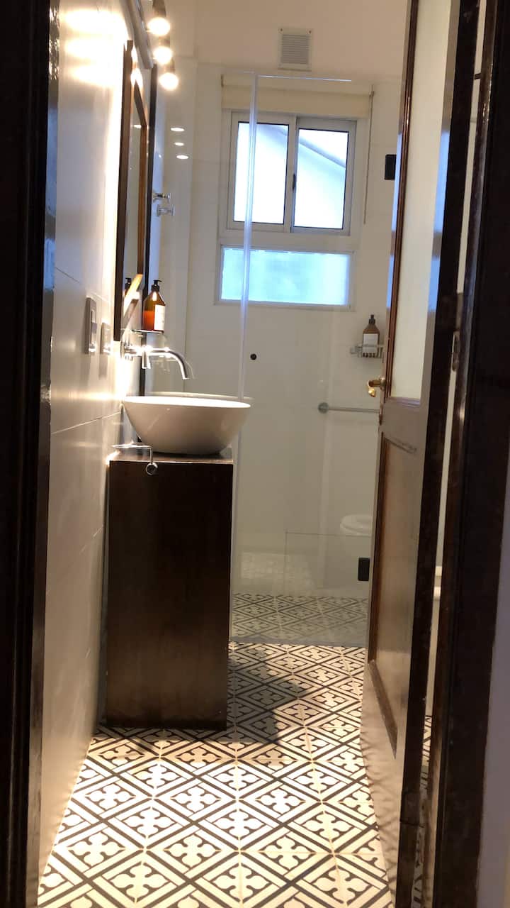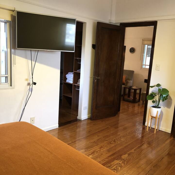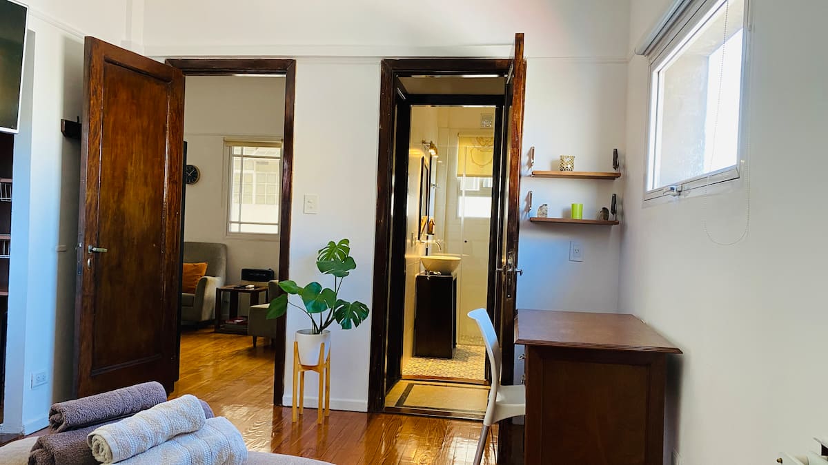 Apartamento em San Telmo com sala e cozinha totalmente equipada. Inclui geladeira com congelador, máquina de lavar automática, chaleira elétrica, cafeteira e liquidificador. O quarto tem cama king size, ar-condicionado, smart TV e armário/dressing room, além de mesa de trabalho. O banheiro é acessível a partir do quarto e da sala. A conexão de internet e a velocidade dependem exclusivamente do provedor.