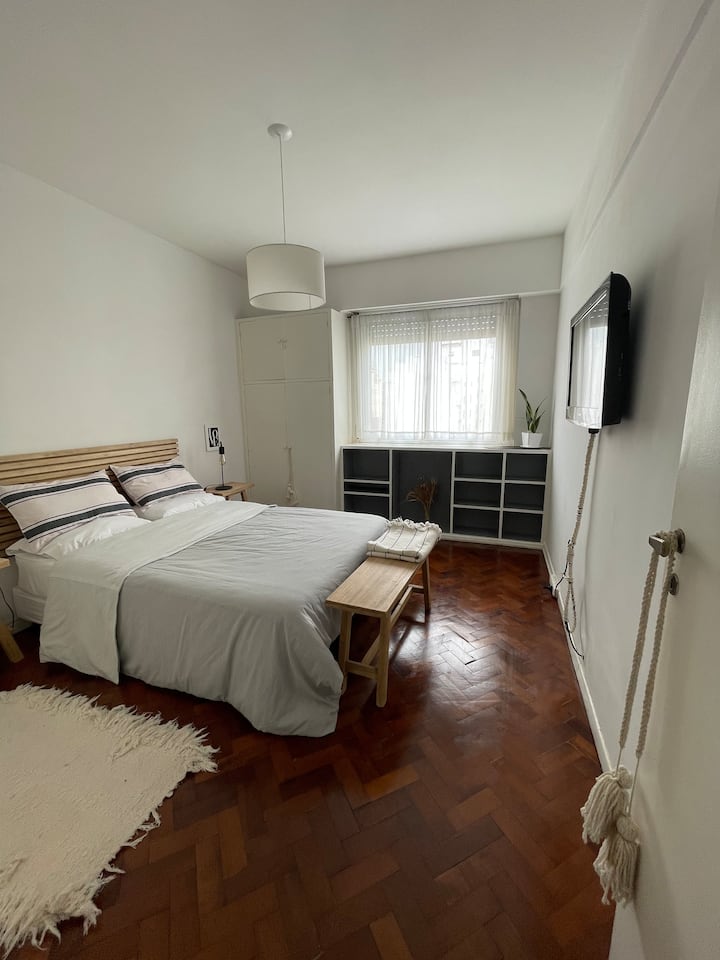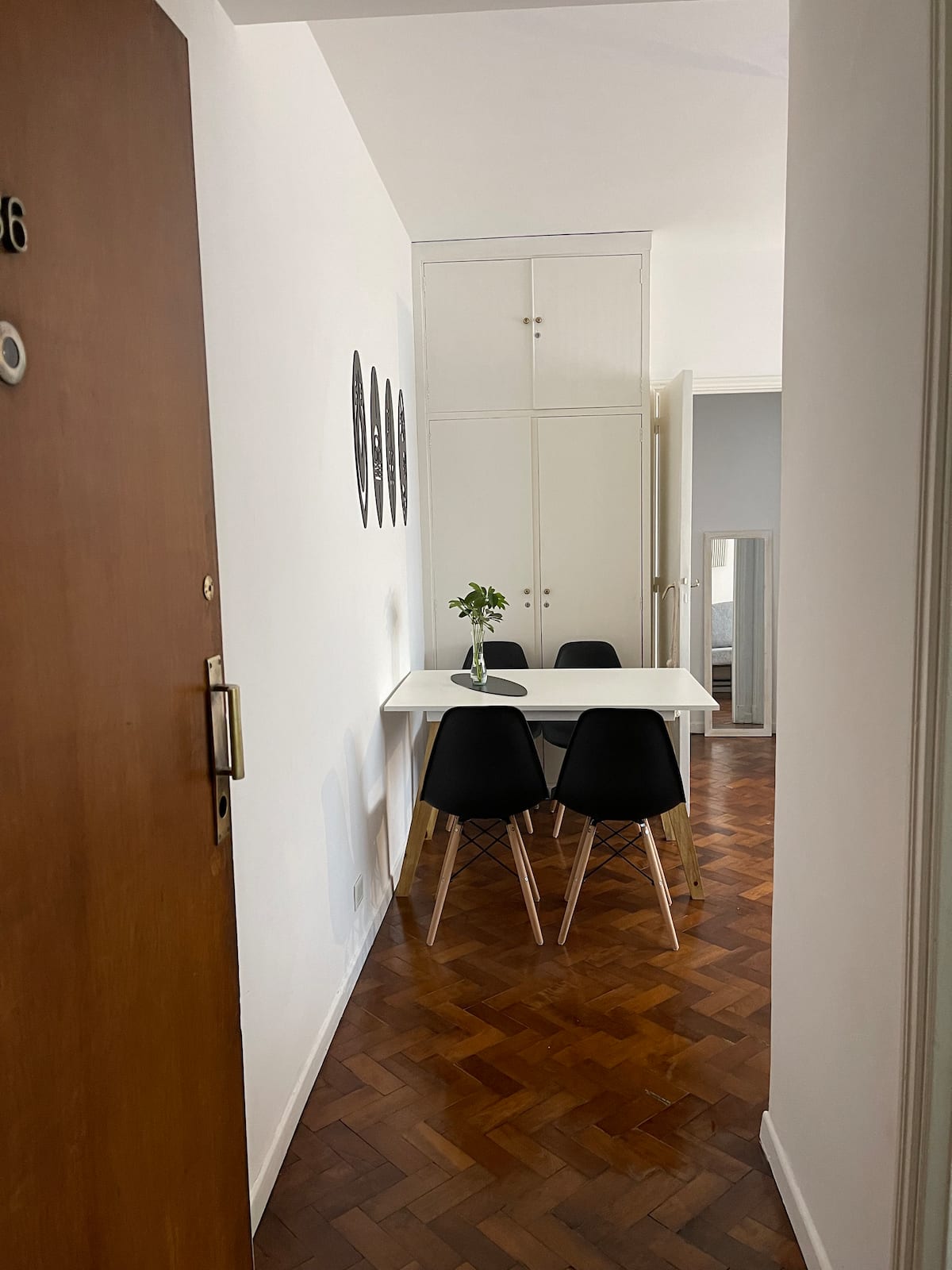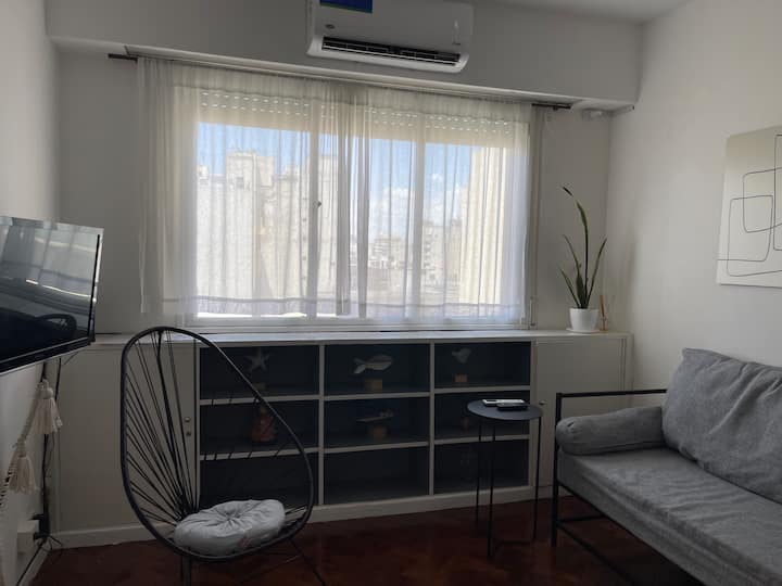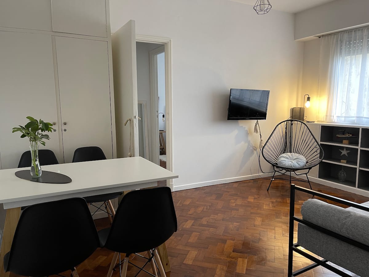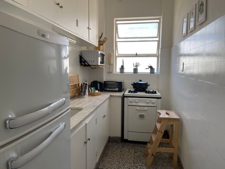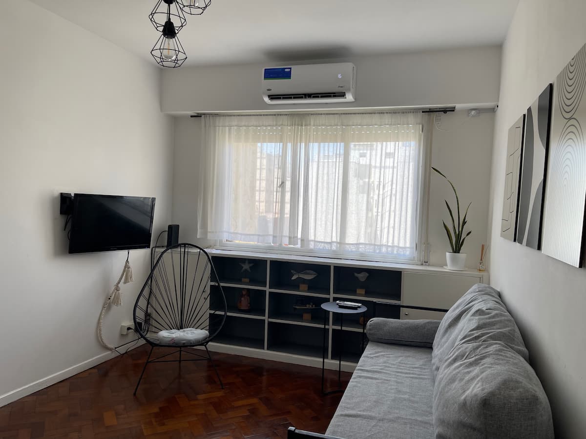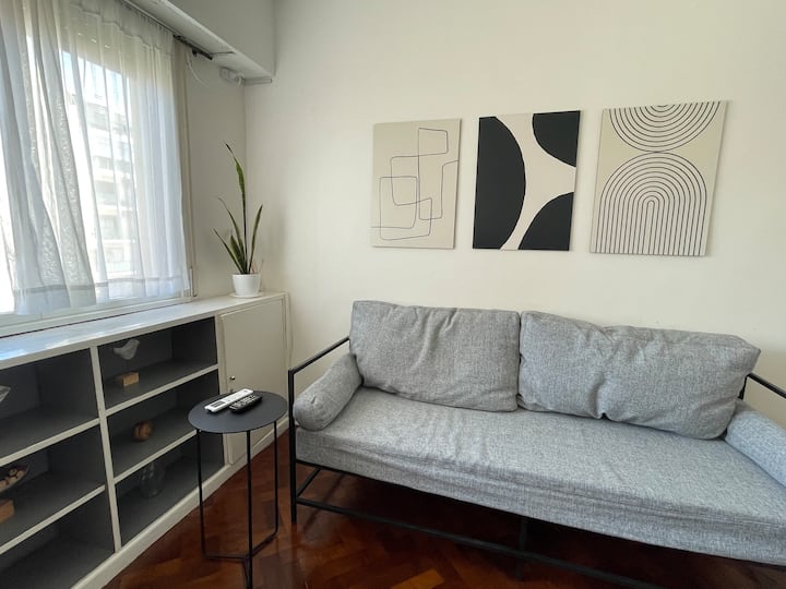 Apartamento com 1 quarto, sala, cozinha separada e 1 banheiro, no 7º andar em San Telmo. Tem vista aberta e recebe luz natural. O prédio dispõe de 2 elevadores. Há 2 TVs com serviço S-Mart e acesso a cabo; no quarto há cama de casal e na sala, sofá-cama.