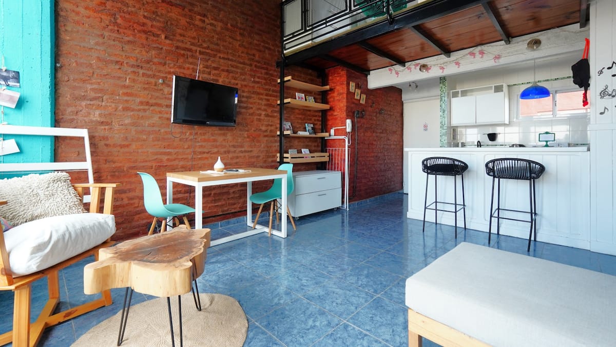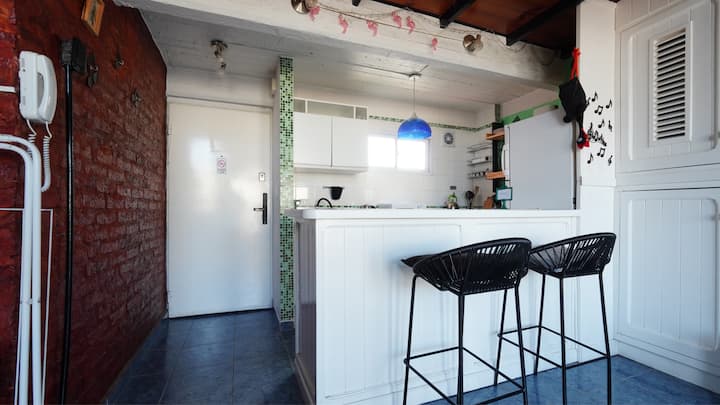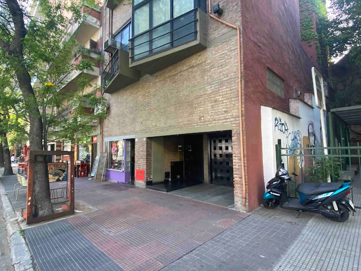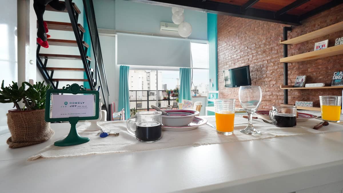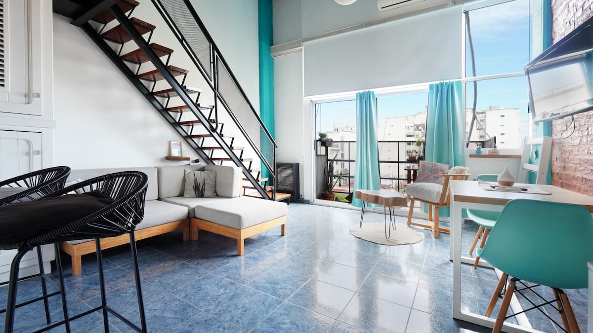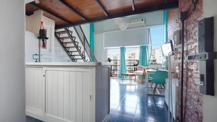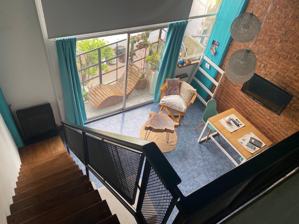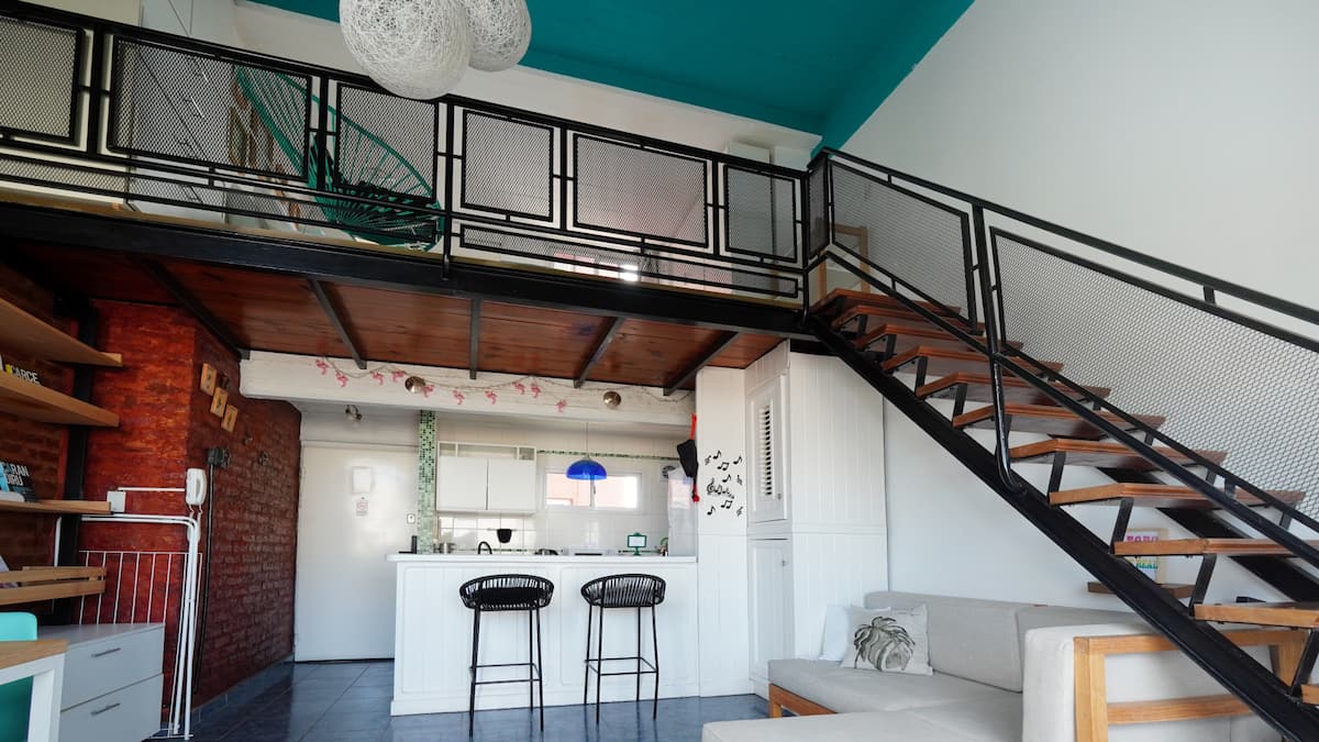 Apartamento duplex em San Telmo com 1 quarto. A unidade tem acesso a áreas comuns do prédio. Por ser do tipo duplex, há necessidade de subir escadas; o quarto e o único banheiro ficam no 2º andar. A cozinha e o quarto são entregues equipados, com máquina de lavar e Wi-Fi de alta velocidade.