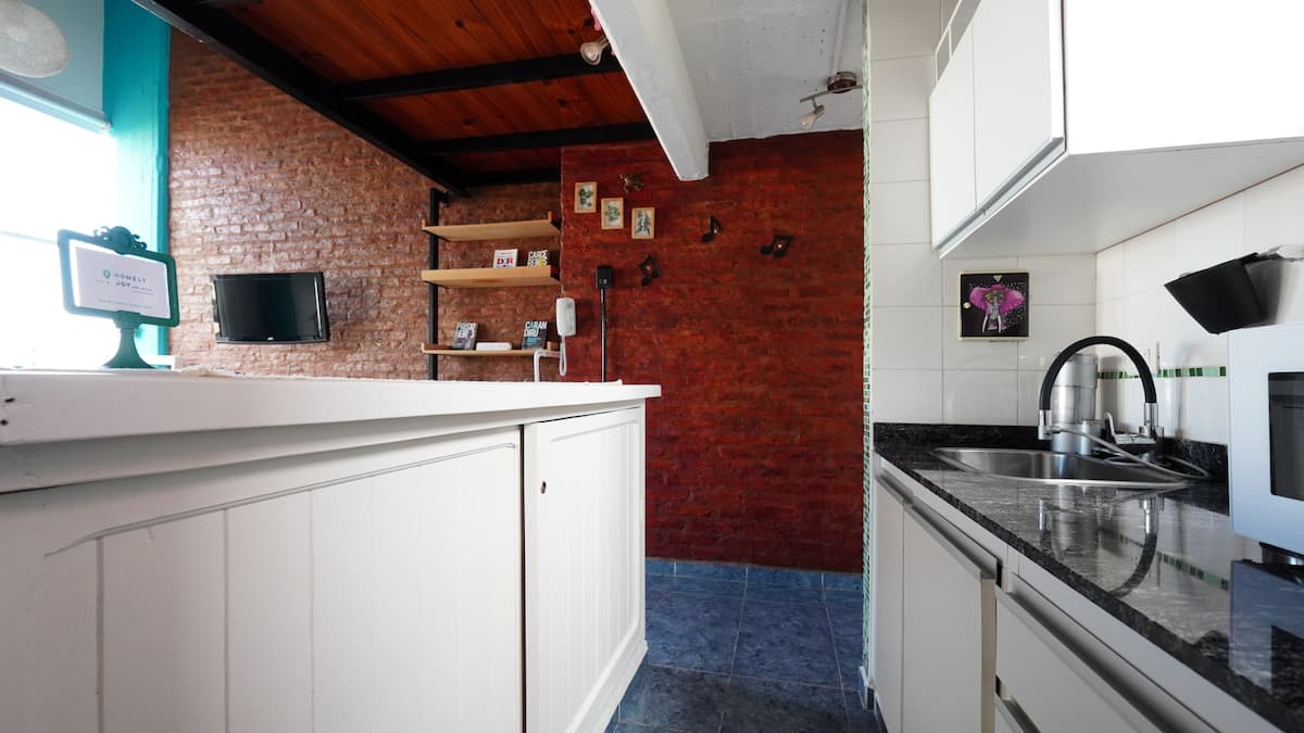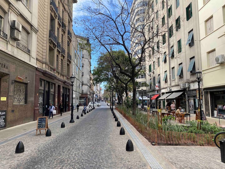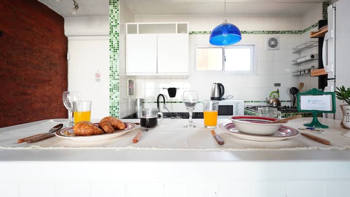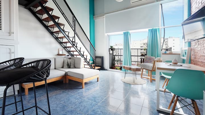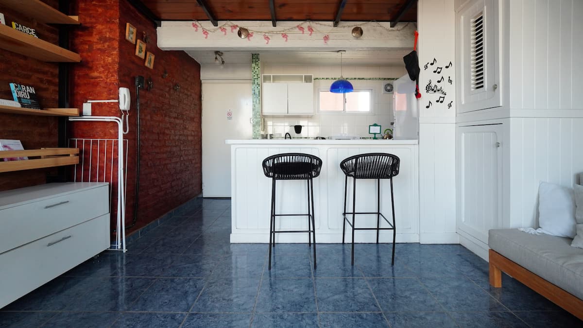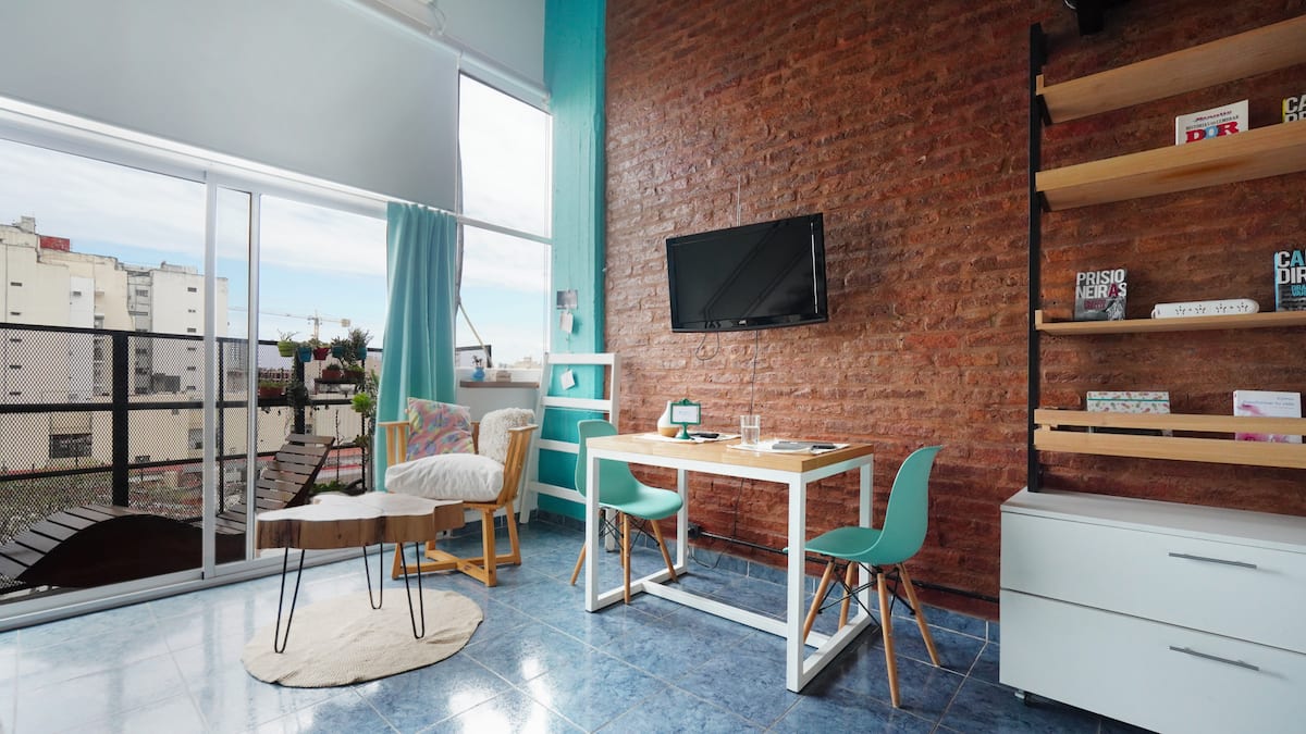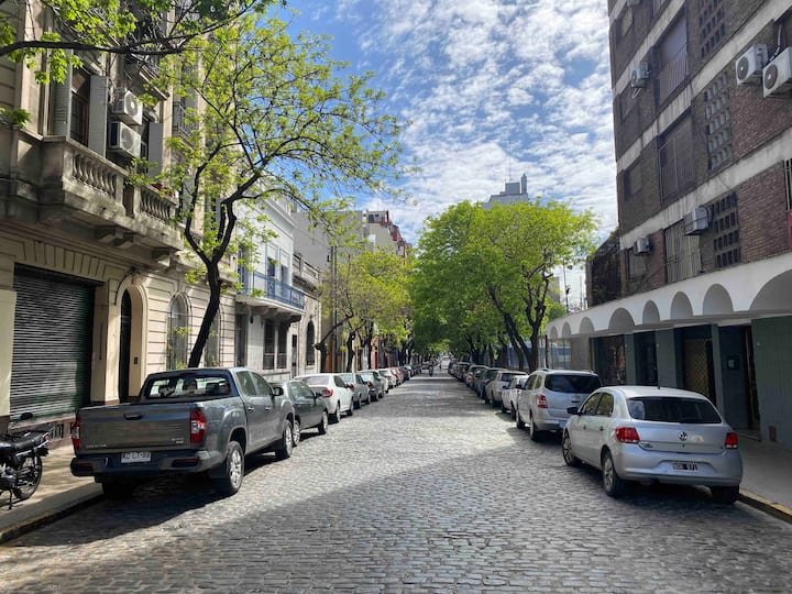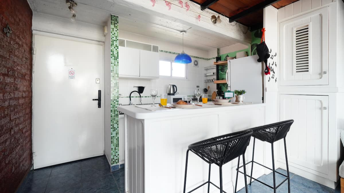 Apartamento duplex em San Telmo com 1 quarto. A unidade tem acesso a áreas comuns do prédio. Por ser do tipo duplex, há necessidade de subir escadas; o quarto e o único banheiro ficam no 2º andar. A cozinha e o quarto são entregues equipados, com máquina de lavar e Wi-Fi de alta velocidade.