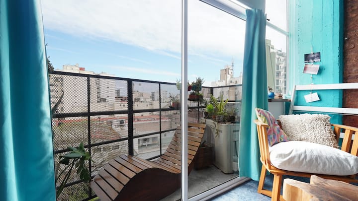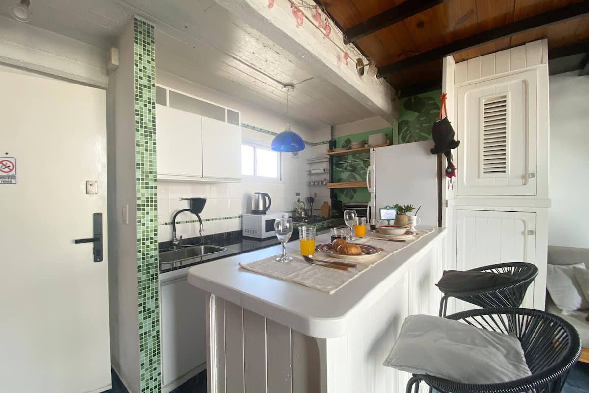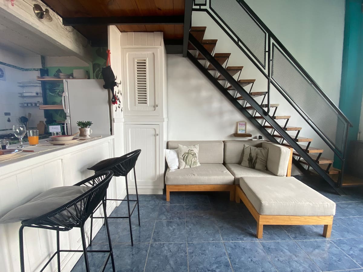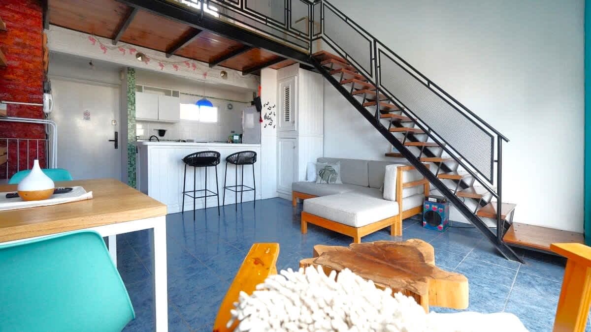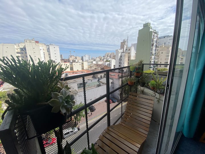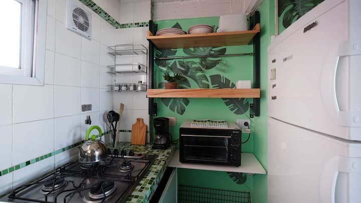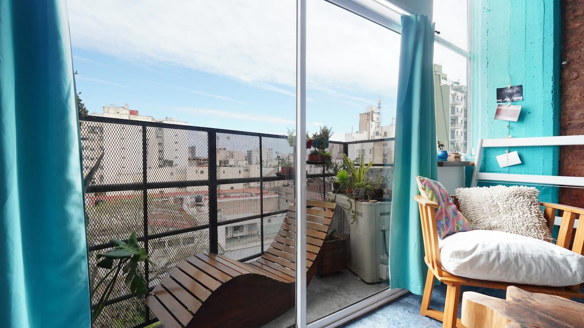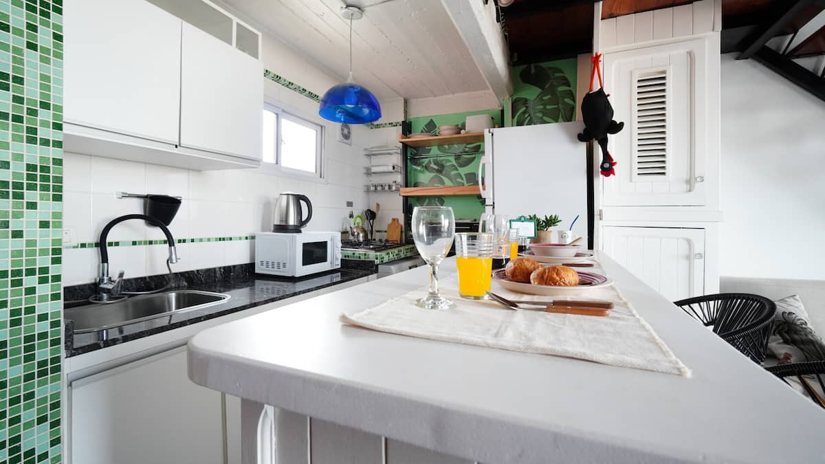 Apartamento duplex em San Telmo com 1 quarto. A unidade tem acesso a áreas comuns do prédio. Por ser do tipo duplex, há necessidade de subir escadas; o quarto e o único banheiro ficam no 2º andar. A cozinha e o quarto são entregues equipados, com máquina de lavar e Wi-Fi de alta velocidade.