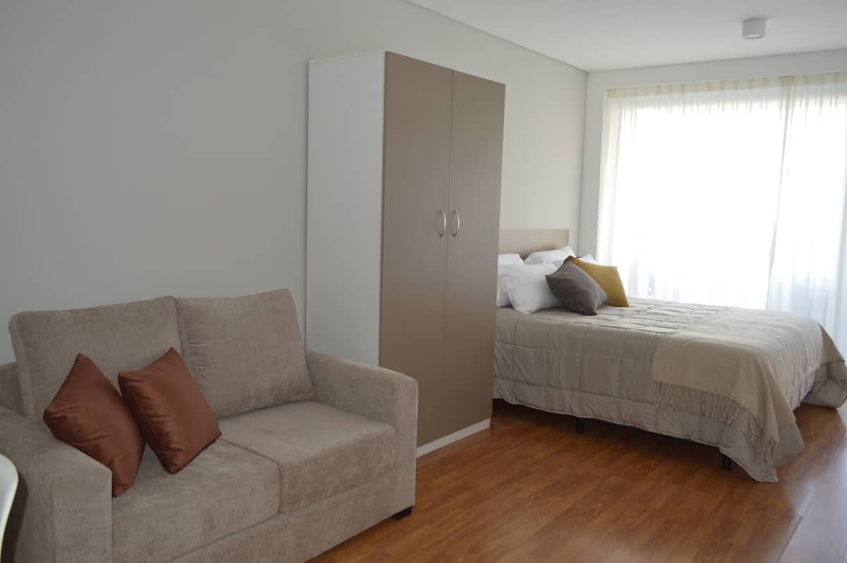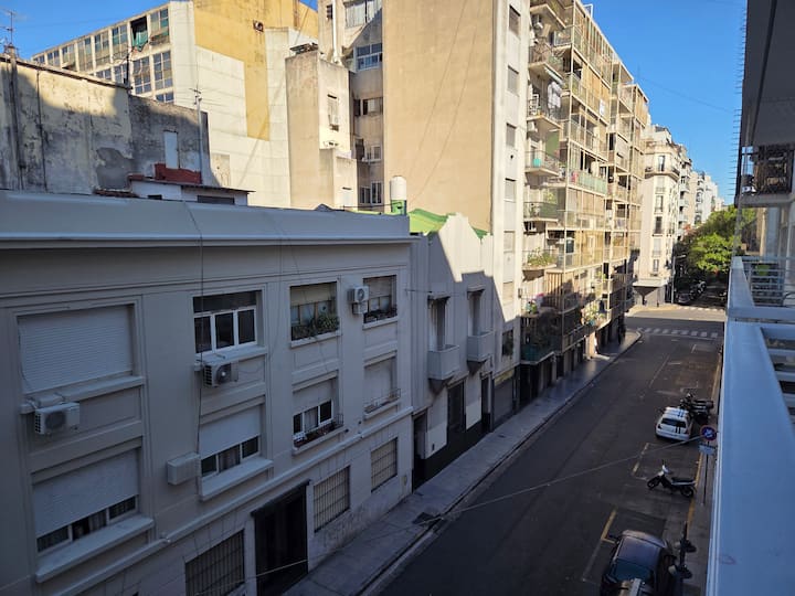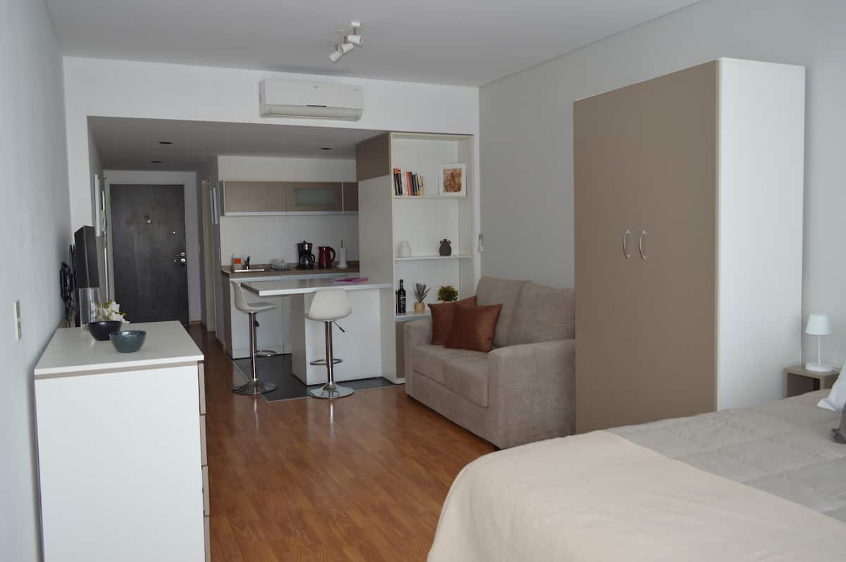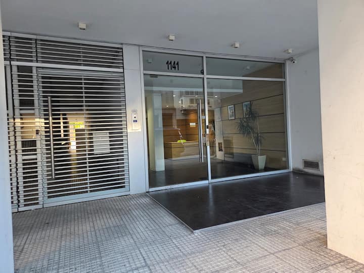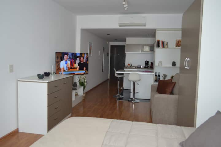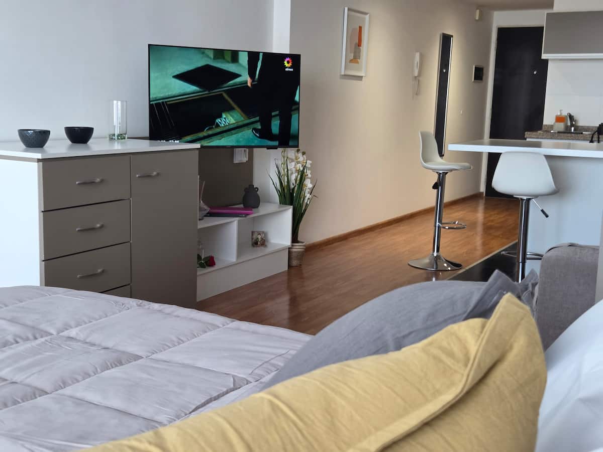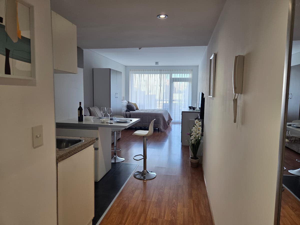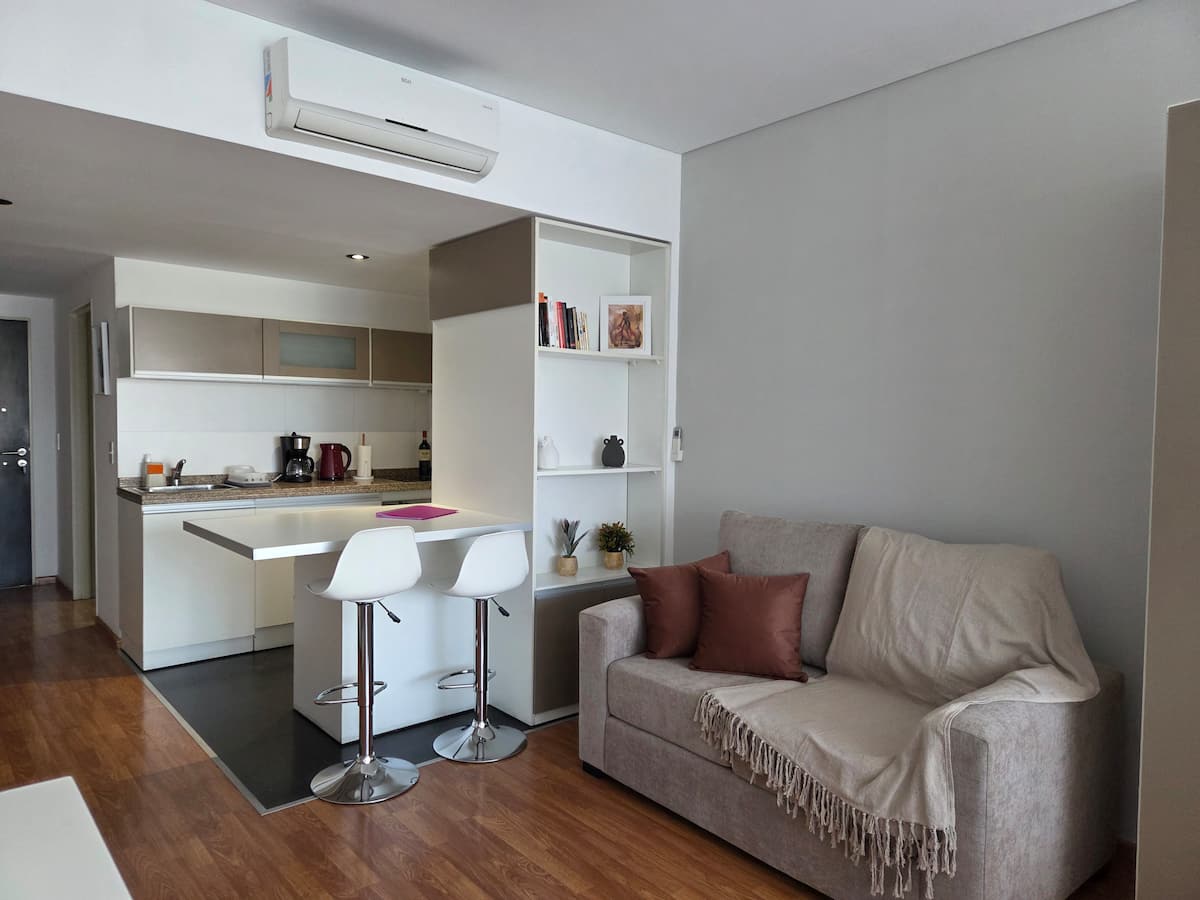 Apartamento de 38 m² em San Telmo, com 1 quarto e mobiliado. Inclui cama king-size e TV LED de 43 polegadas. Possui varanda com vista para a rua. O condomínio tem câmeras de segurança, área de lavanderia, jardim e piscina.