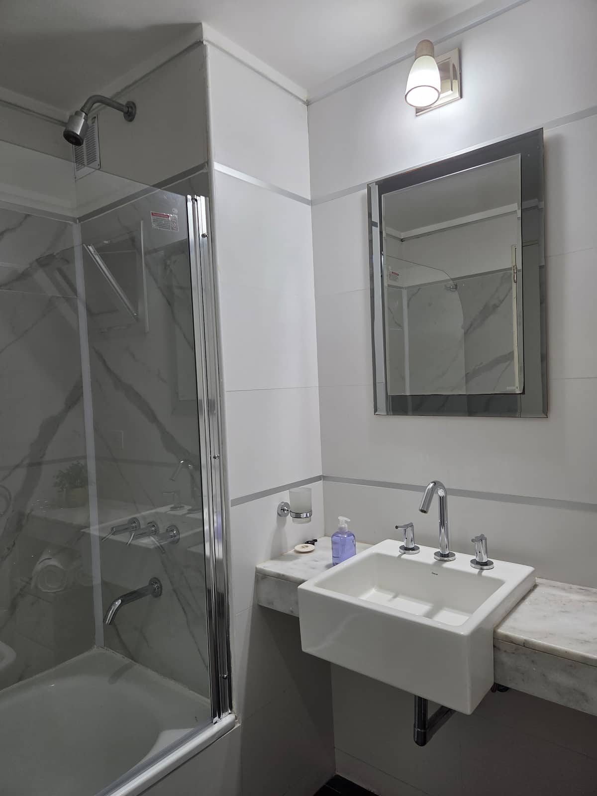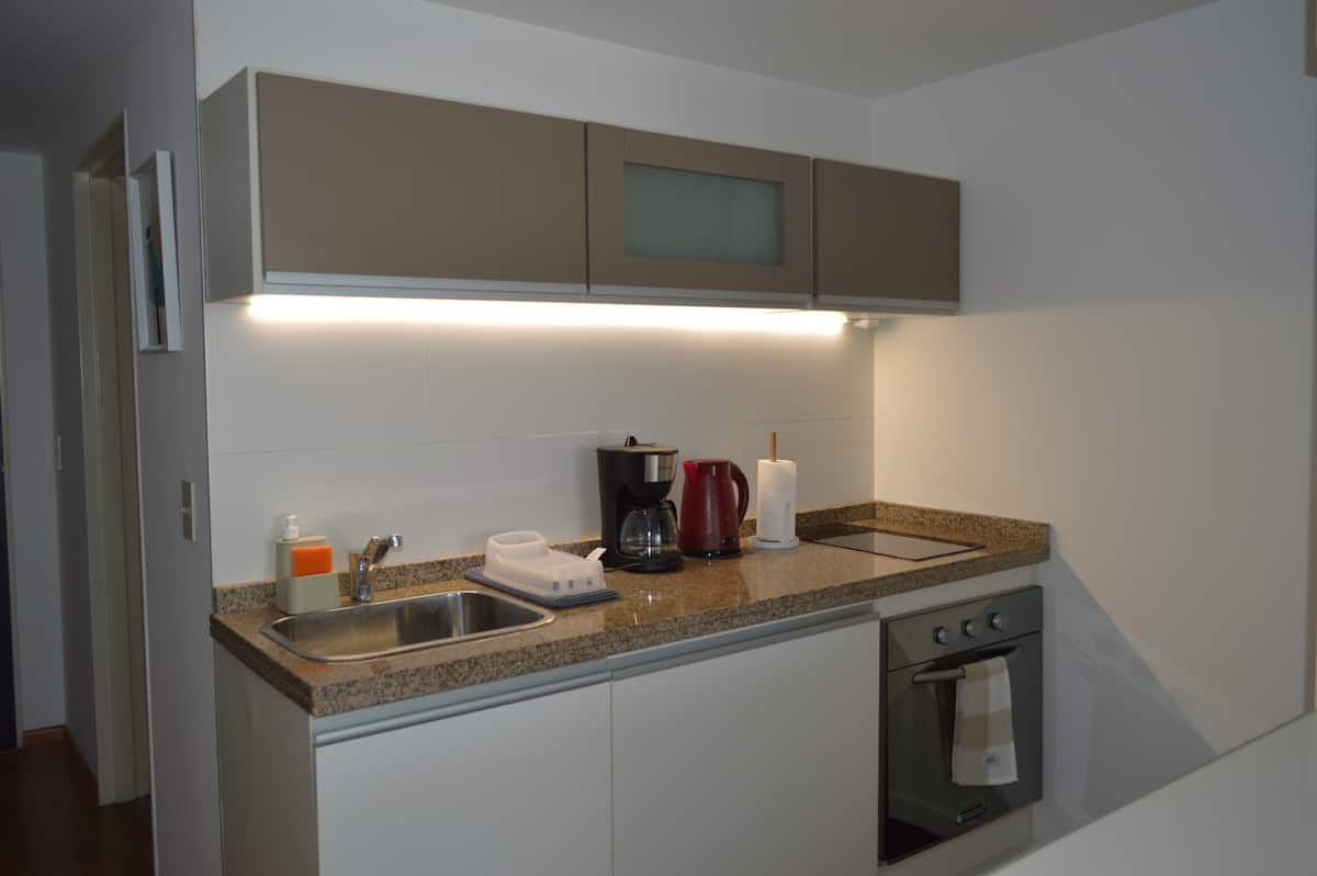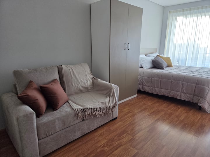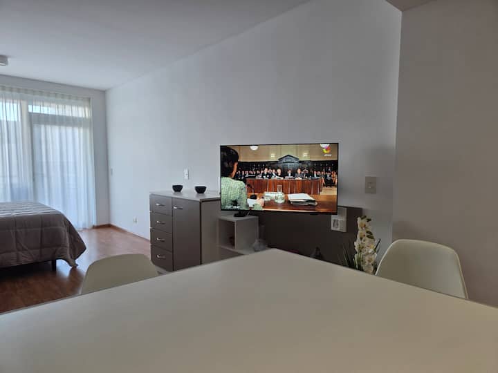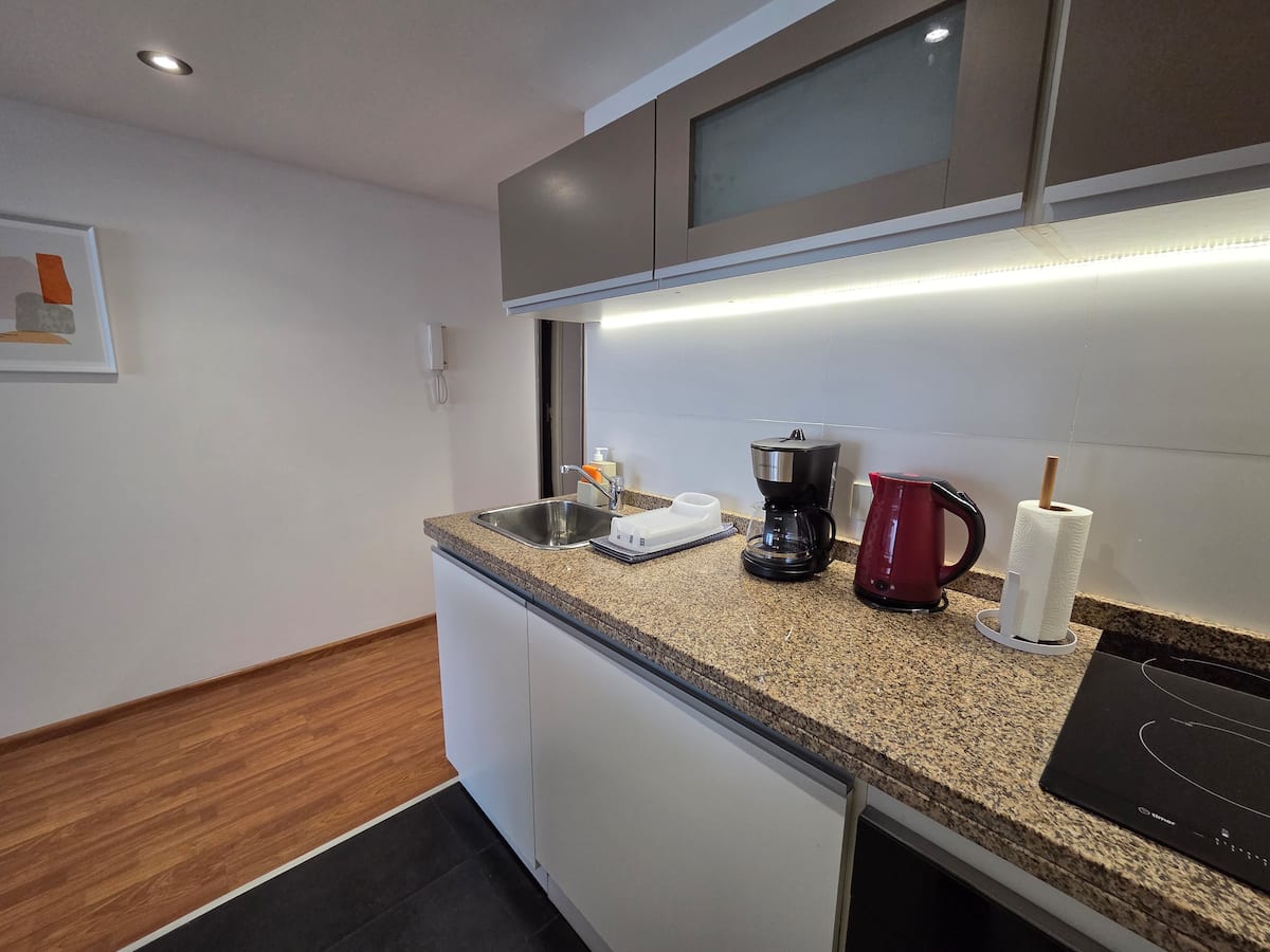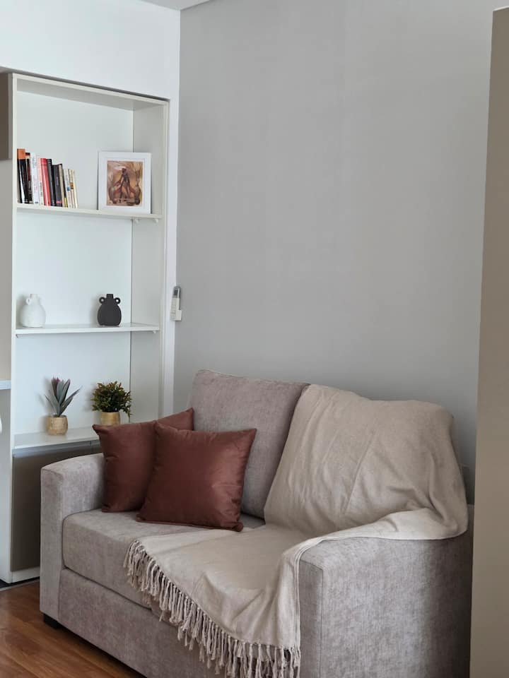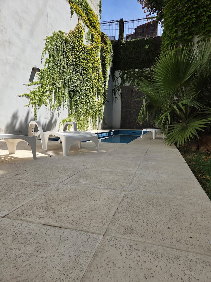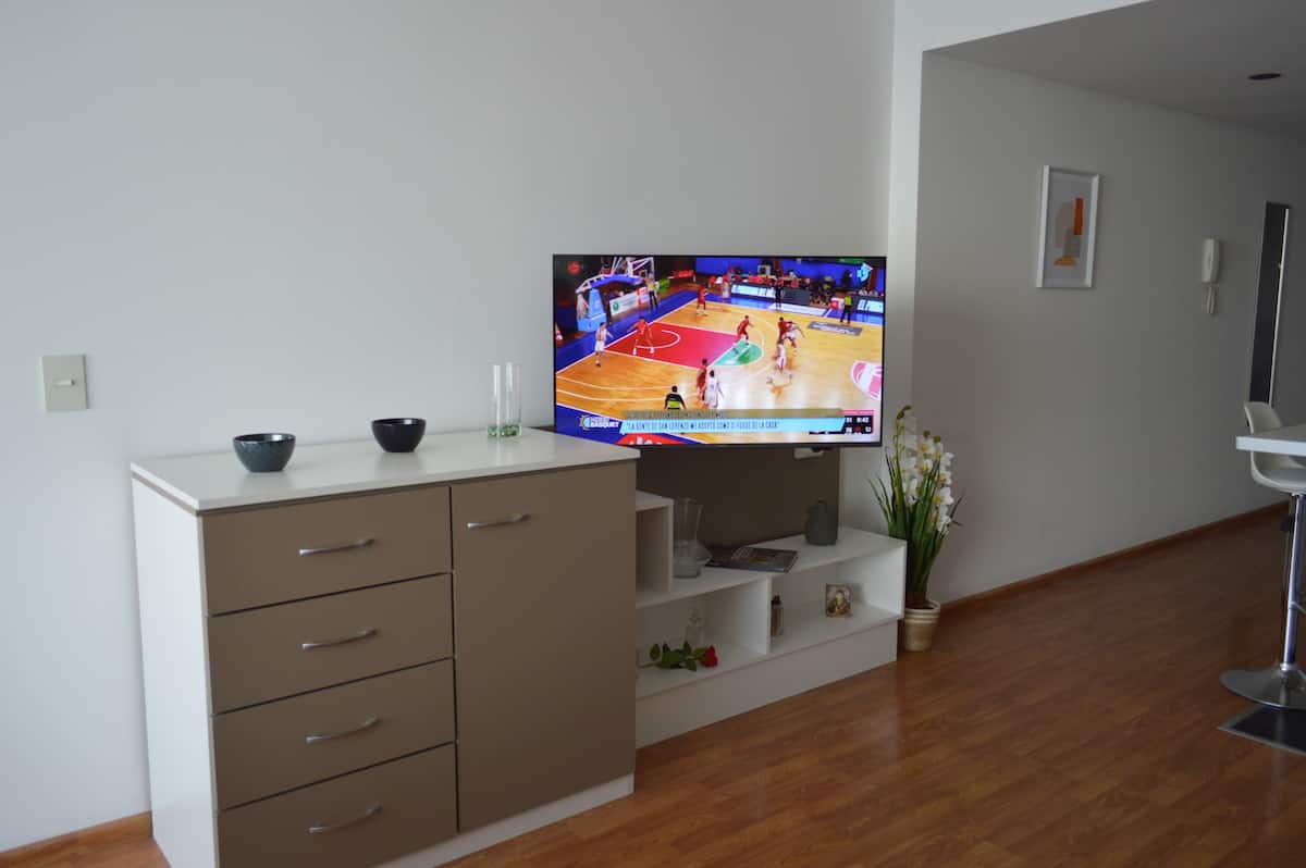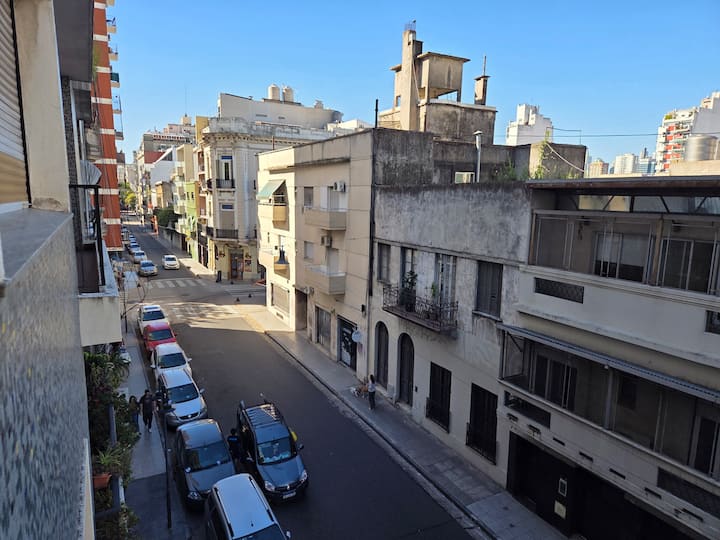 Apartamento de 38 m² em San Telmo, com 1 quarto e mobiliado. Inclui cama king-size e TV LED de 43 polegadas. Possui varanda com vista para a rua. O condomínio tem câmeras de segurança, área de lavanderia, jardim e piscina.