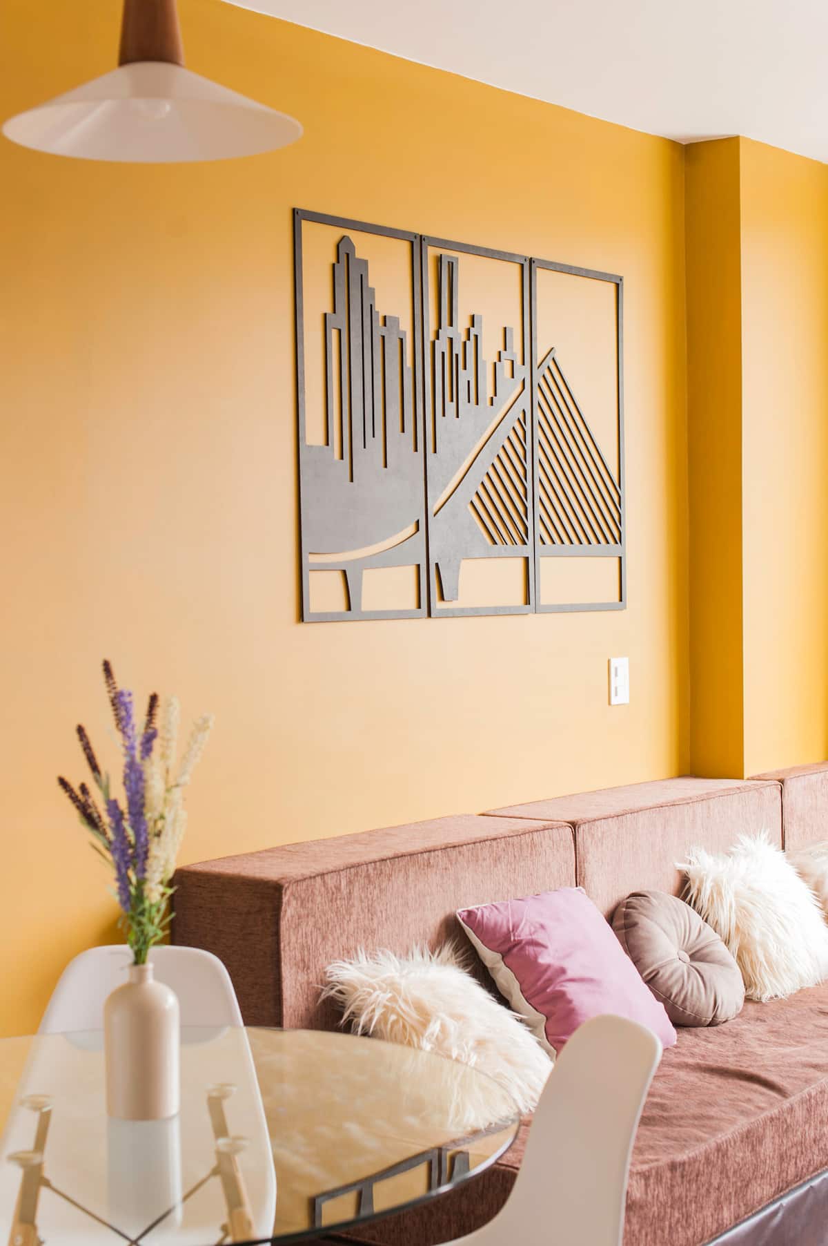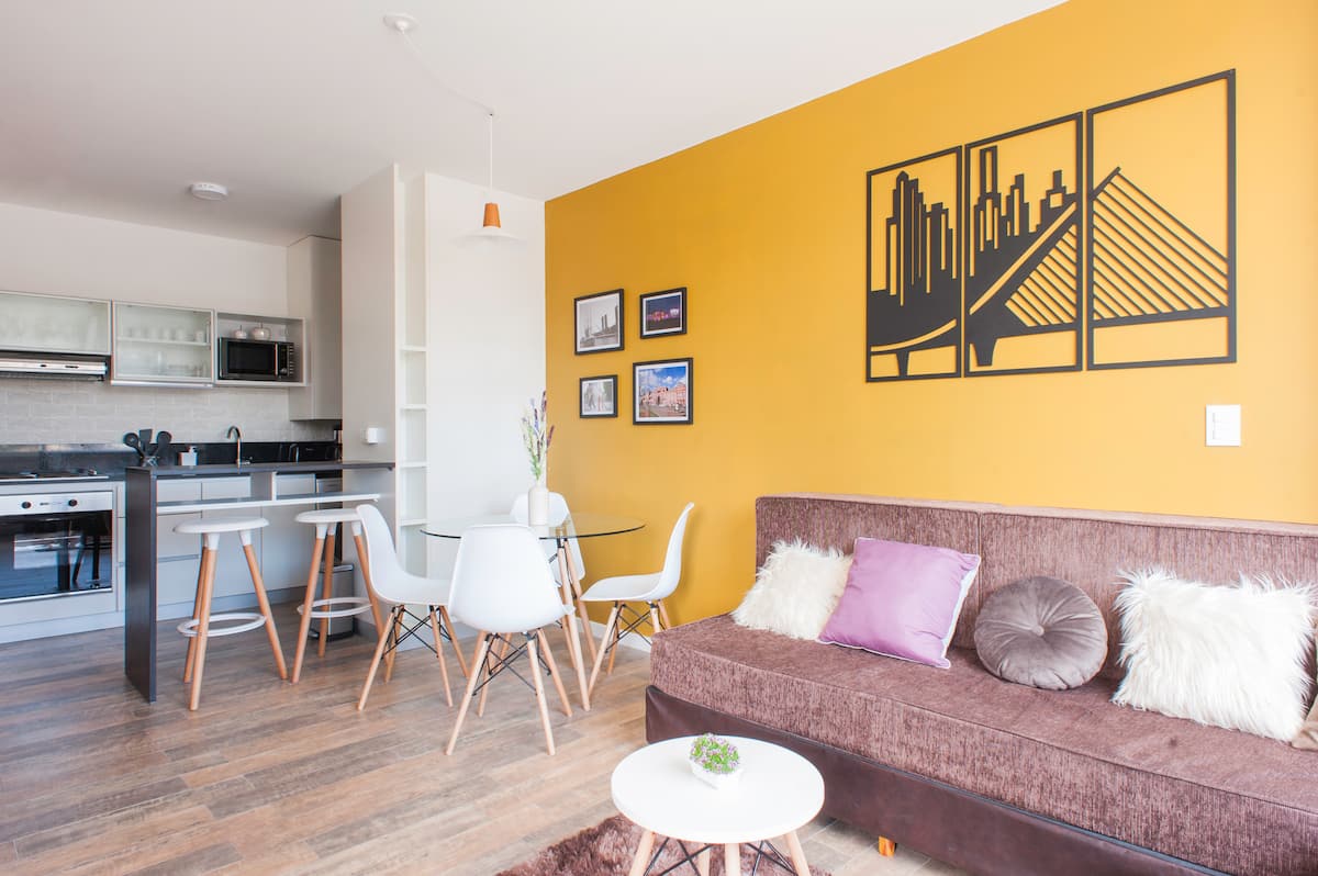Apartamento novo com 2 ambientes e estilo escandinavo na sala de estar e jantar. Há 1 quarto com móveis Luis (sem detalhes adicionais), cores atuais e configuração indicada como com 3 camas para acomodar até 3 pessoas. O acesso ao apartamento é sem degraus; o prédio tem 2 elevadores e monta-cargas.