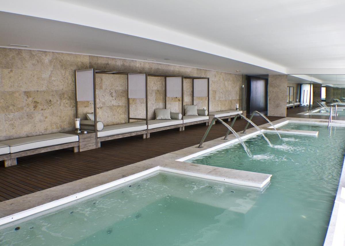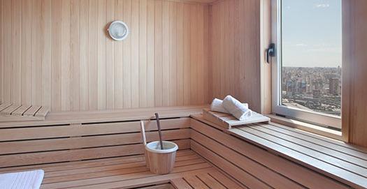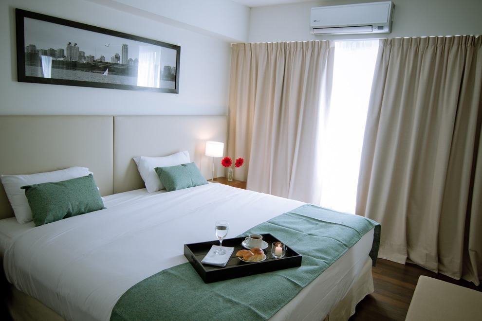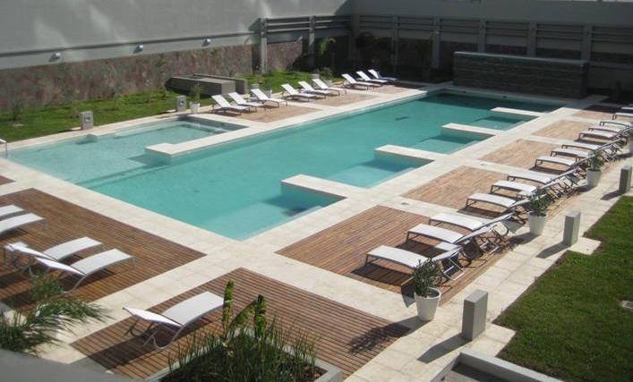 Apartamento de 2 ambientes em San Telmo, na Av. Juan de Garay 700, com varanda. Inclui living com sofá de 2 lugares e TV de tela plana, ar-condicionado e cozinha completa com utensílios, espaço de armazenamento, geladeira com freezer e mesa para 4 pessoas. O quarto tem colchão tipo sommier de 2 praças, amplo armário tipo closet e roupas de cama. Banheiro completo com banheira. O prédio oferece piscina coberta e descoberta, deck/solário, academia, vestiários com sauna, sala de massagens, área de