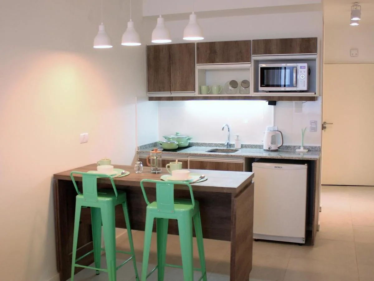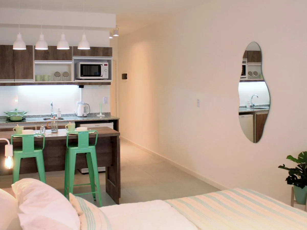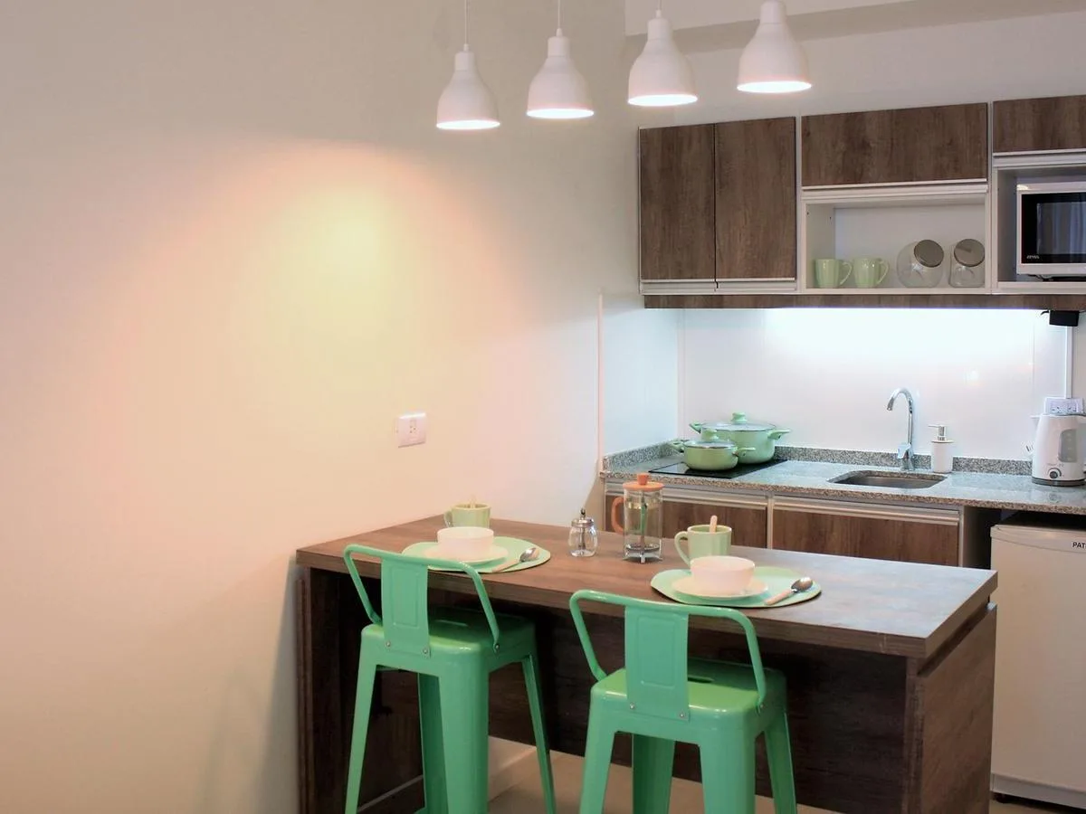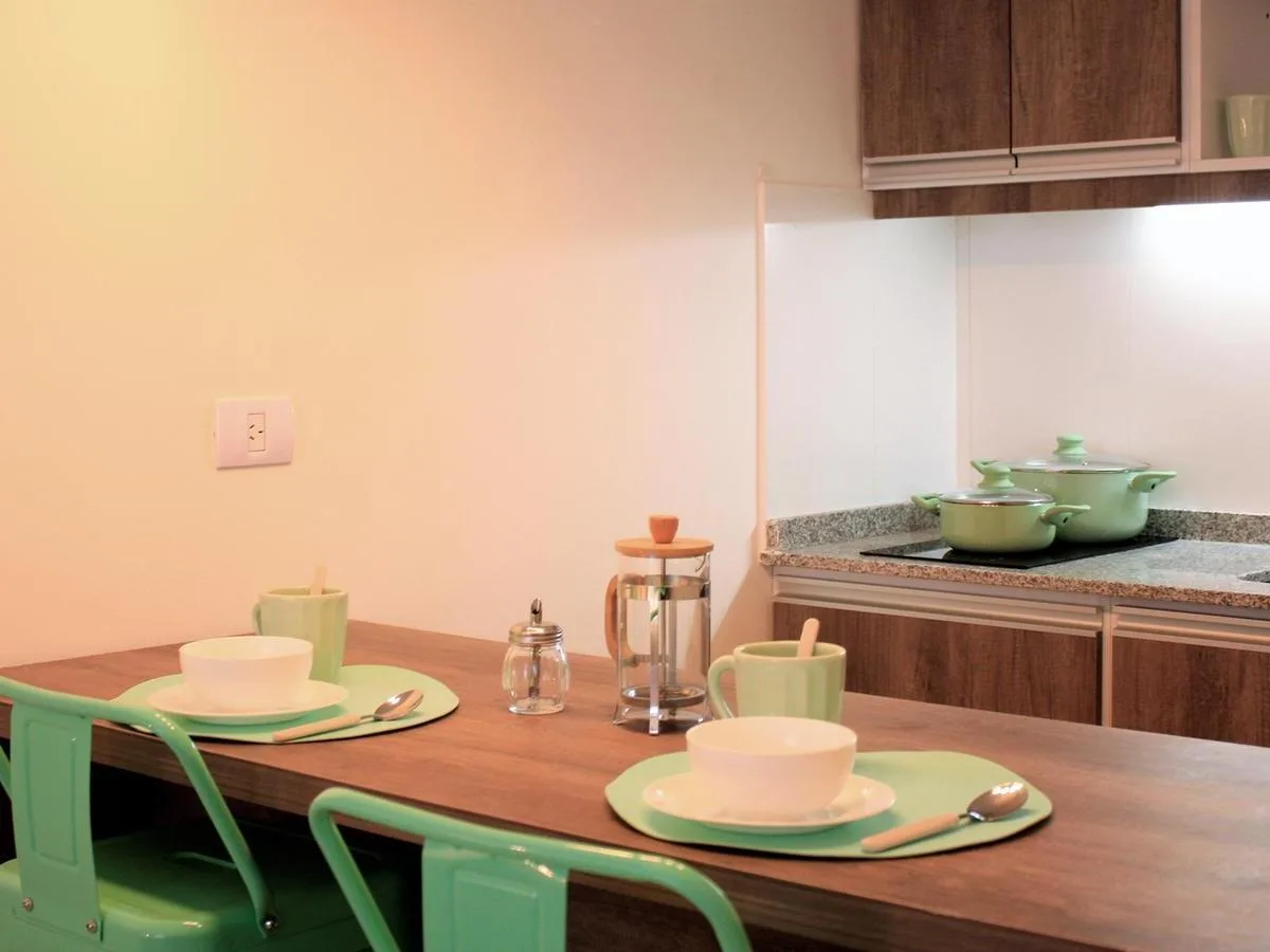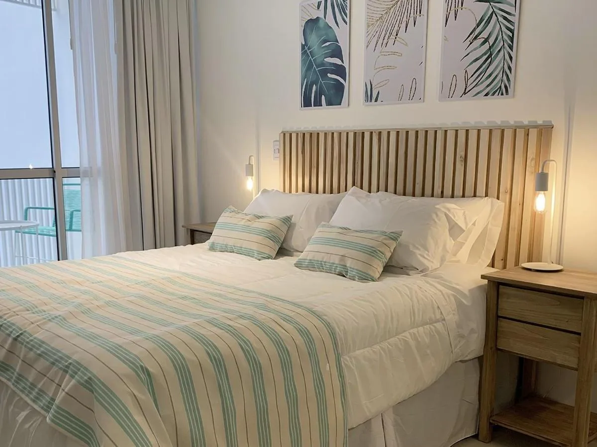 Kitnet de 1 ambiente no 1º andar, unidade 09, com varanda. Conta com cama queen na área de descanso, cozinha completa com bancada e banquetas e banheiro completo. O prédio tem lavanderia, piscina na cobertura e academia equipada.