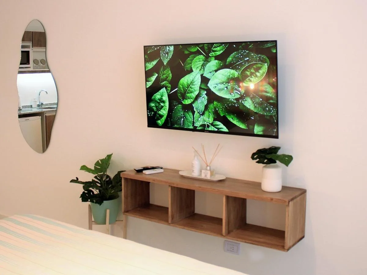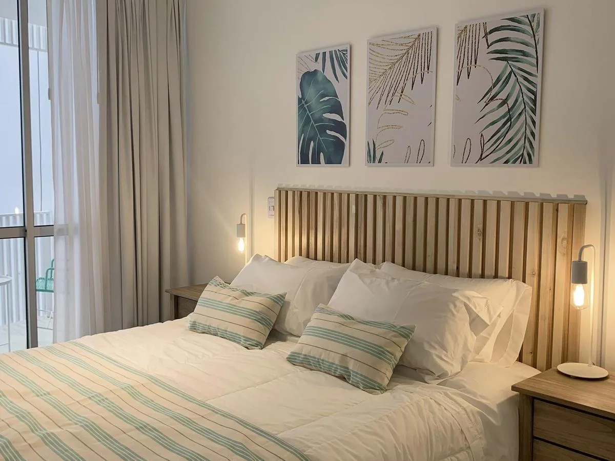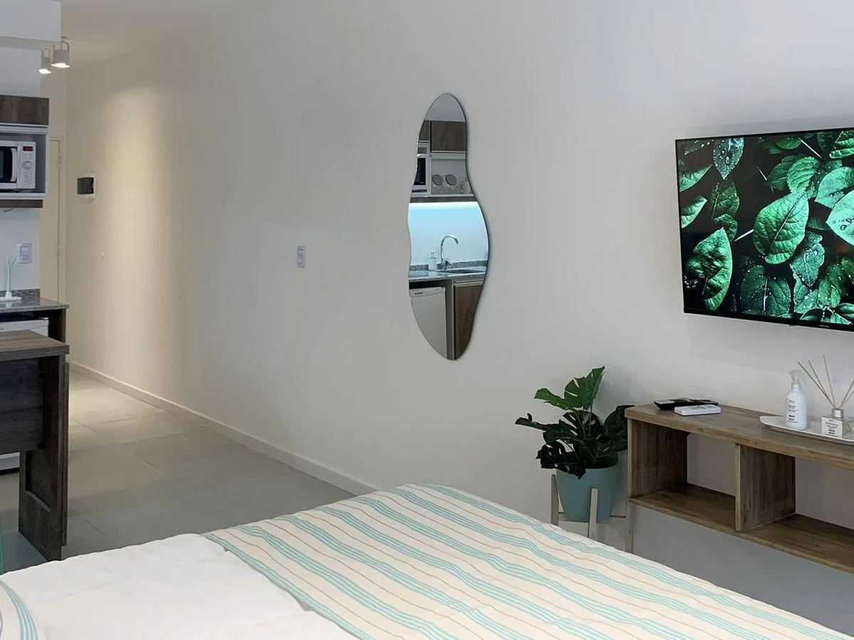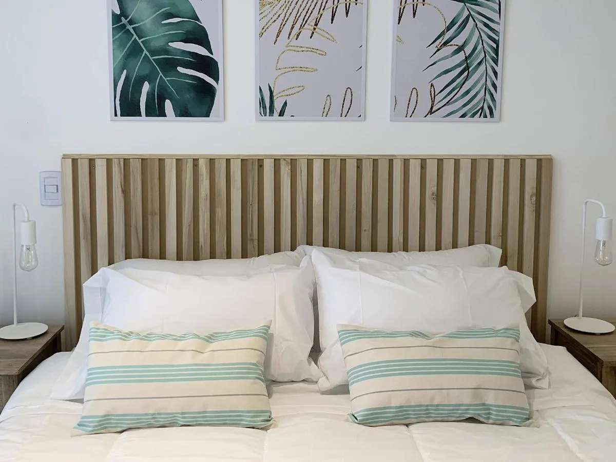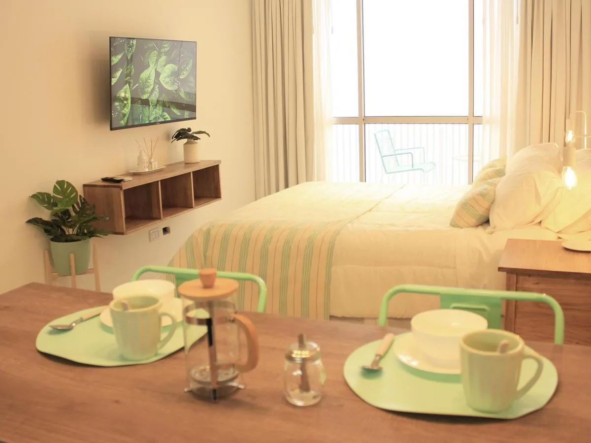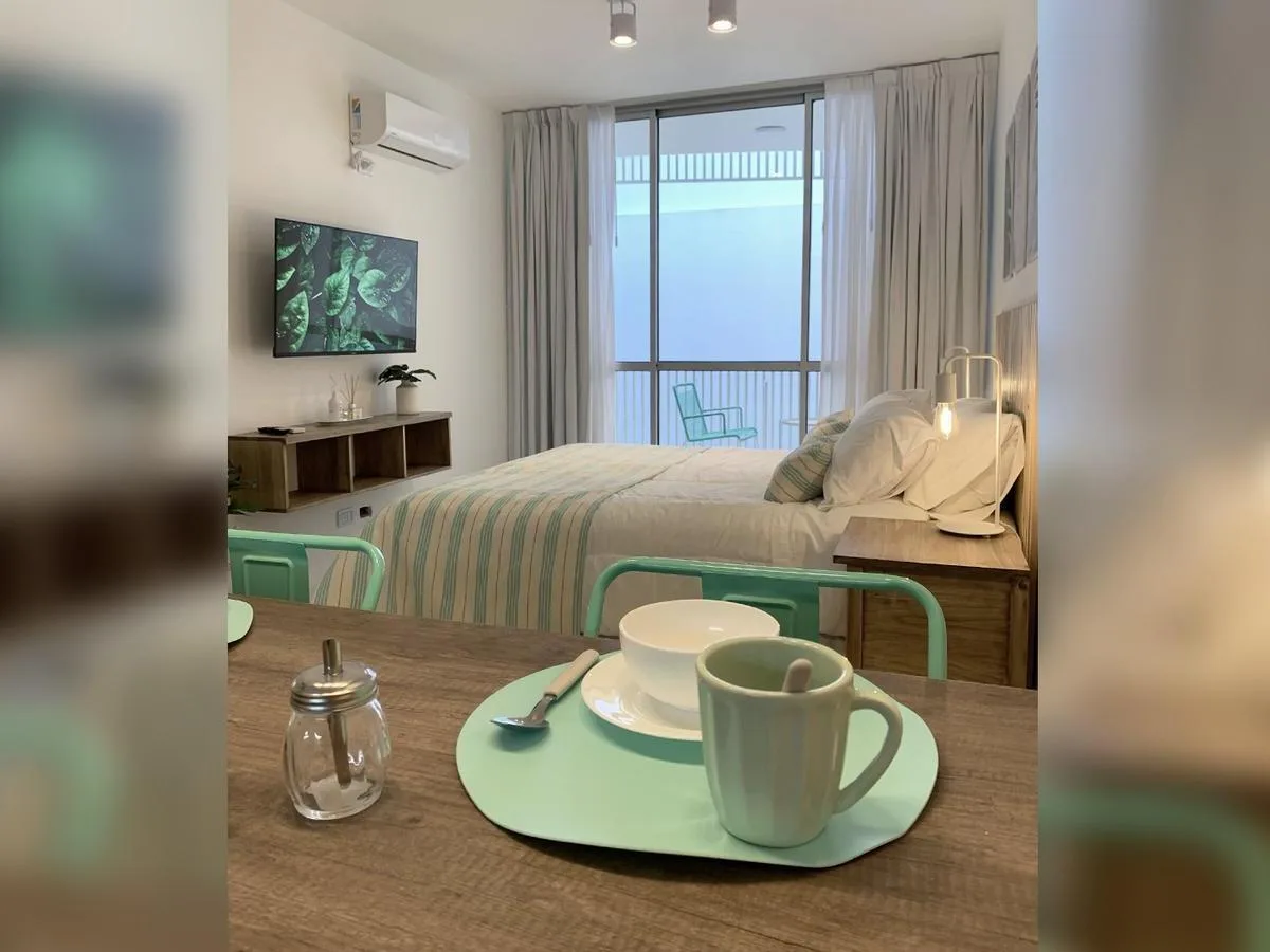Kitnet de 1 ambiente no 1º andar, unidade 09, com varanda. Conta com cama queen na área de descanso, cozinha completa com bancada e banquetas e banheiro completo. O prédio tem lavanderia, piscina na cobertura e academia equipada.